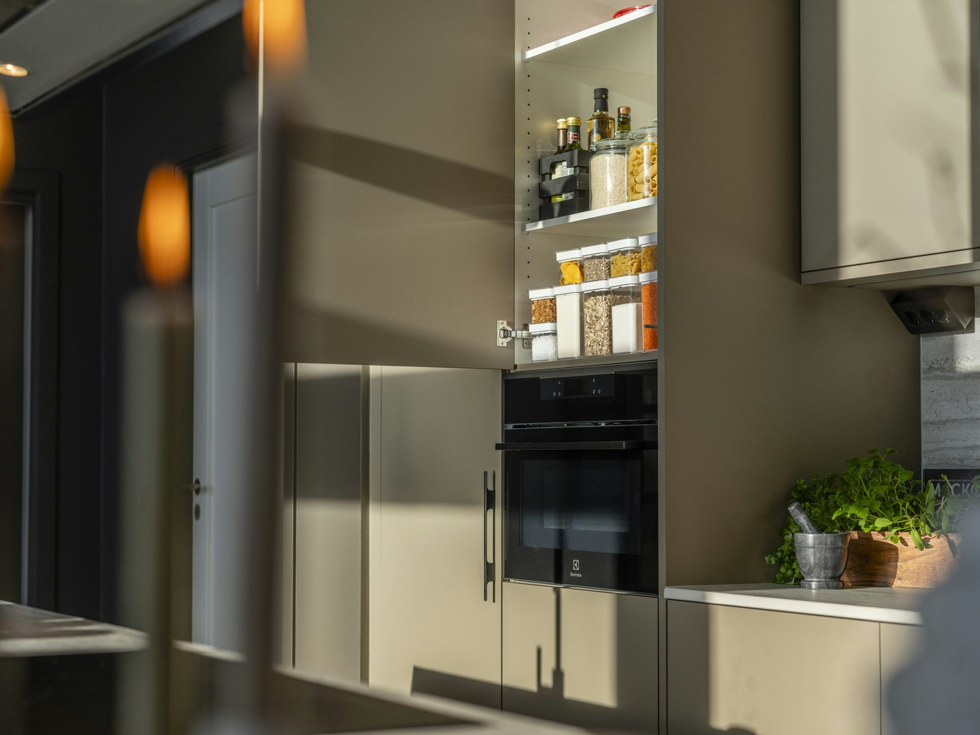 Marko was clear from the start when choosing the furniture: he fell in love with the beige FENIX finish from Ballingslöv, a classic matt tone that brings visual serenity. The designer describes it as “a classic colour and durable furniture… with a unique silky matt finish that, with its straight lines, creates a calm and understated impression.” Alongside Electrolux appliances, the kitchen was ready to combine design with plenty of culinary activity.