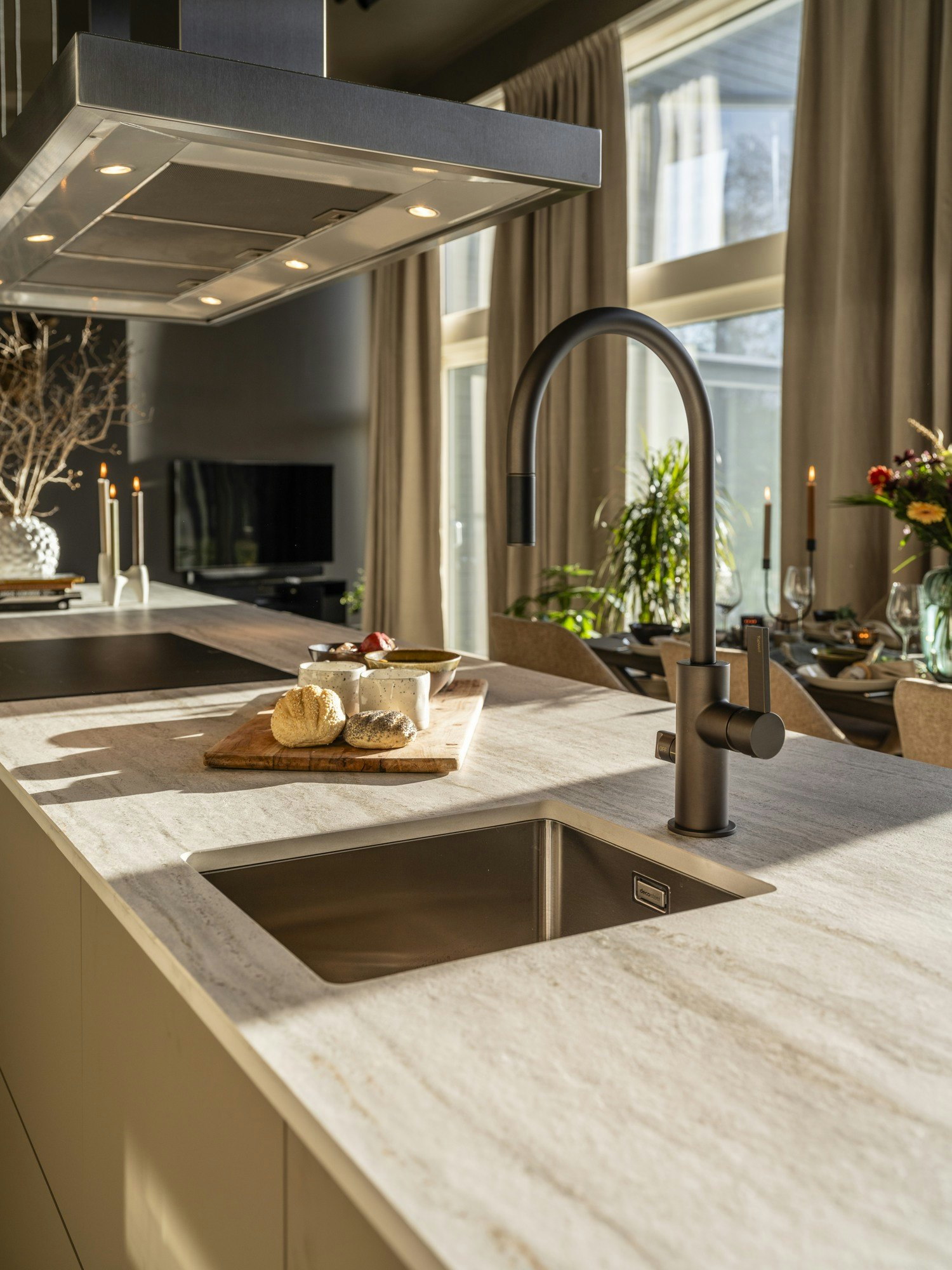 But there was a decisive aspect for Marko: he needed an extremely durable worktop, capable of withstanding direct heat, impacts, and stains, especially because the kitchen is closely linked to his hobbies. “One of Marko's interests is hunting and also cooking, so during preparation things can get very hot,” notes Ulrika. That’s why the choice of material was clear. “Dekton is an unbeatable material against scratches, stains, and heat,” says the designer. “Hot pots and pans can be placed directly on the worktop.”