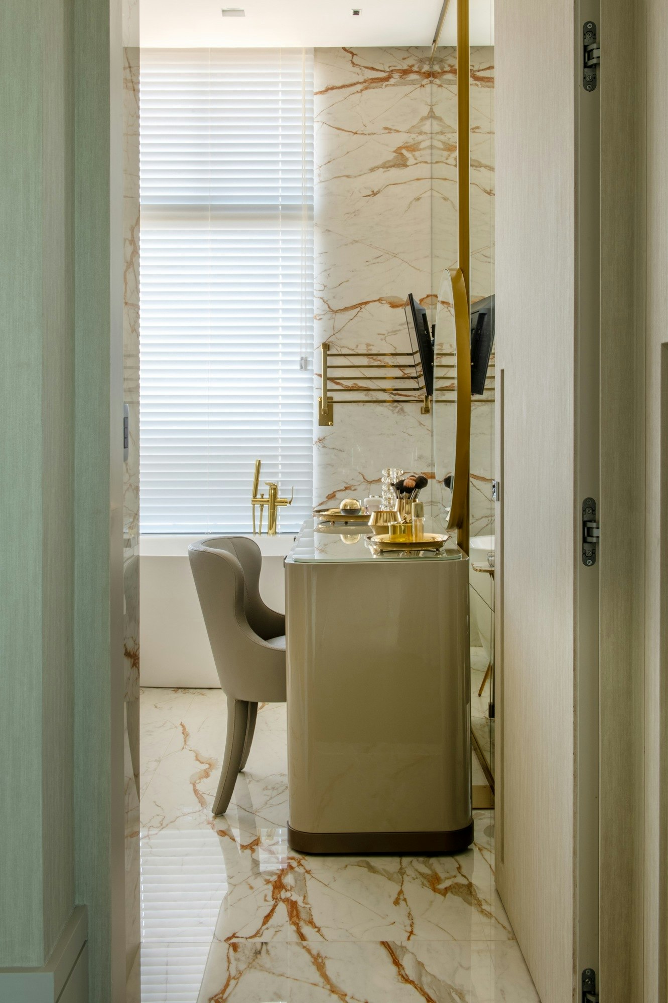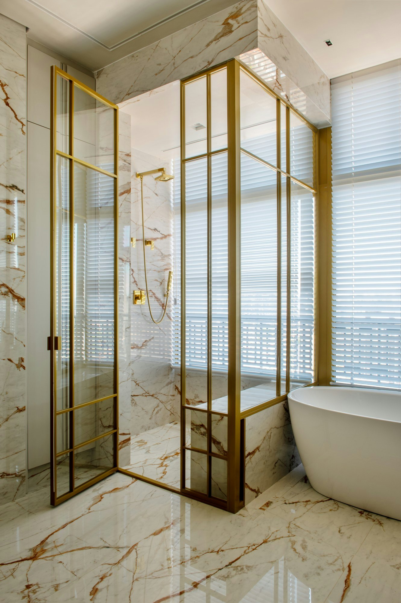 In the kitchen, the worktops are made of 12 mm Dekton Awake, a shade reminiscent of marble with striking veining, complementing the organic style of the space. In the main bathroom, the wall also features Dekton Awake, this time in 4 mm, while the floor is clad in the same material in 8 mm, enhancing visual continuity and moisture resistance. The shower floor in the master suite adds a touch of contrast with Dekton Reverie.