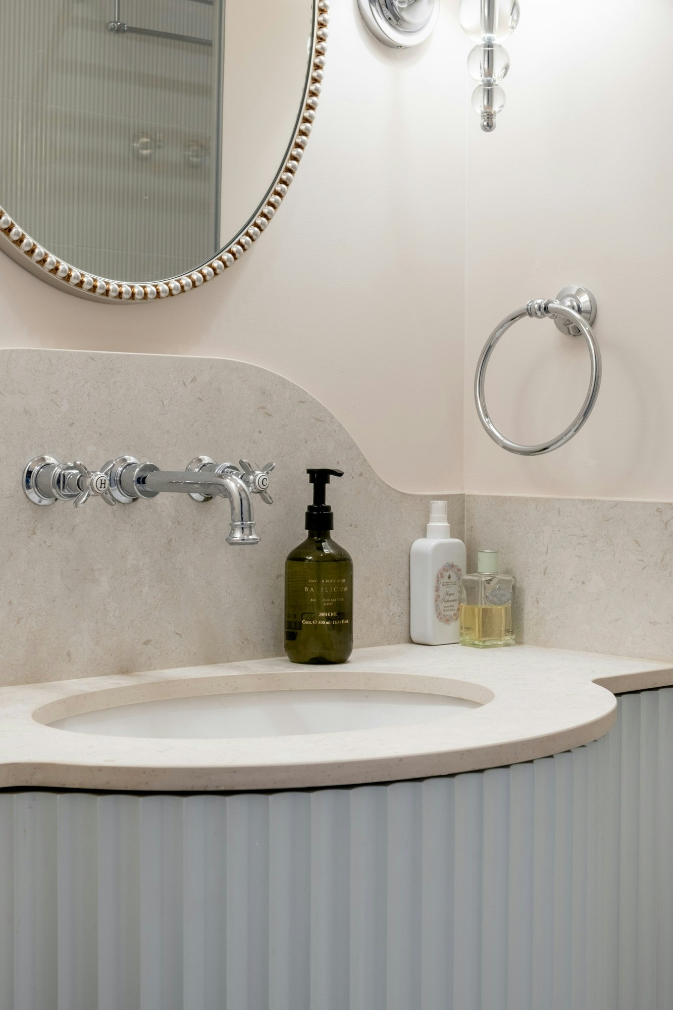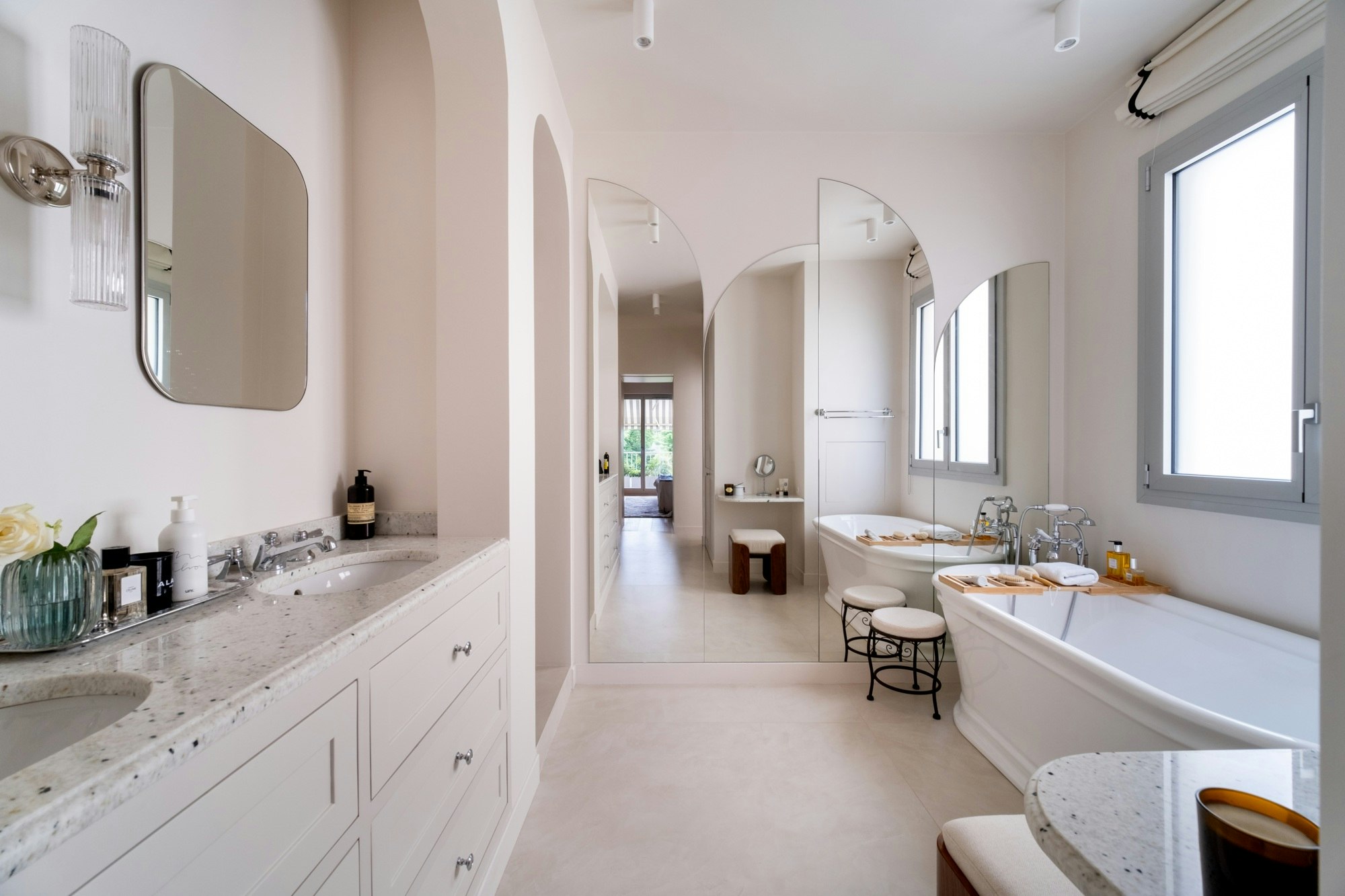 The master bathroom embraces a Hamptons-inspired style with Sensa Siberia natural stone, made completely impermeable thanks to SenGuard technology, which protects the surface while highlighting its subtle veining, and is elevated by the sophistication of a corbel edge detail. The flooring and shower feature Dekton Albarium in a concrete-effect large format, minimizing joints to create visual continuity and easier cleaning.