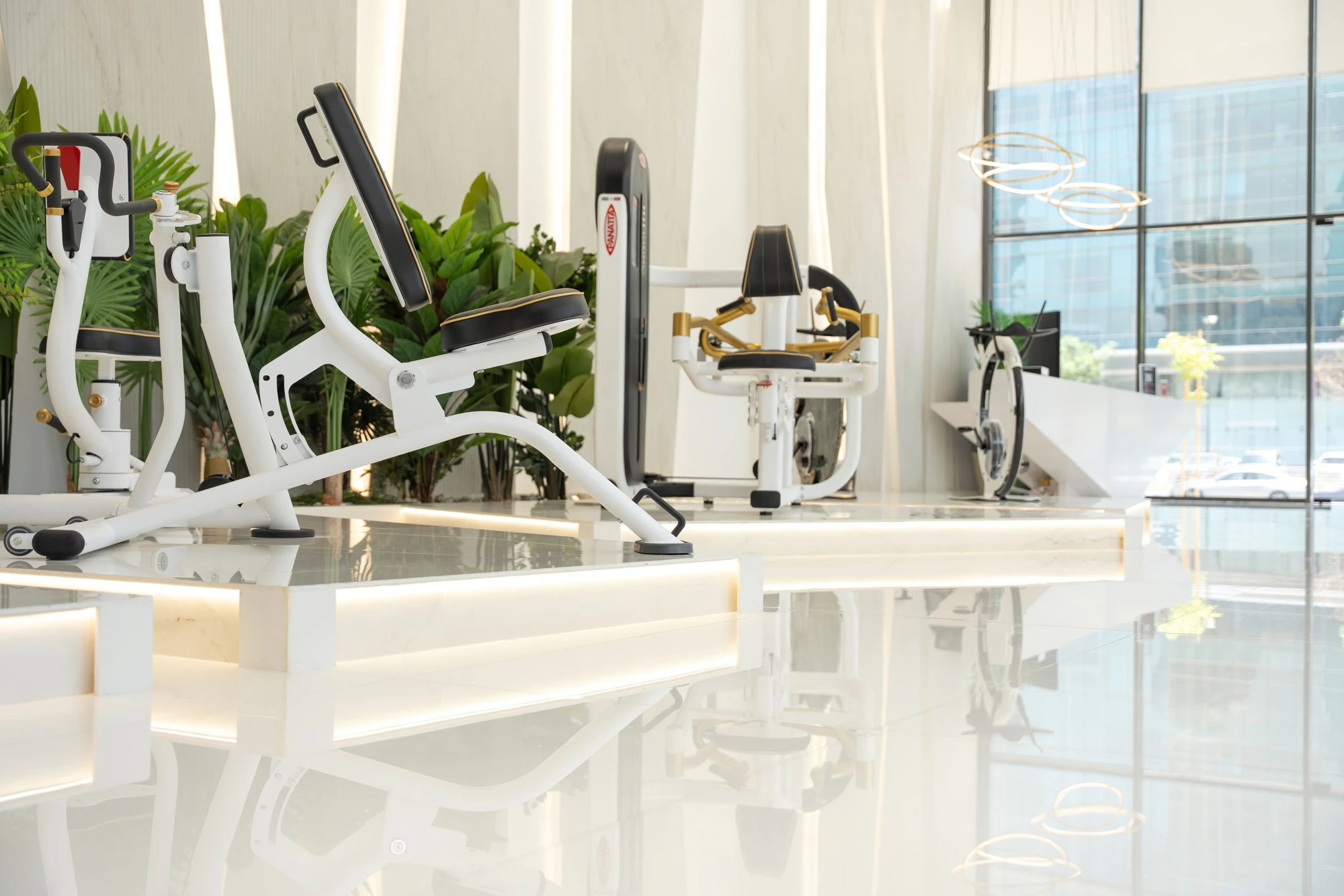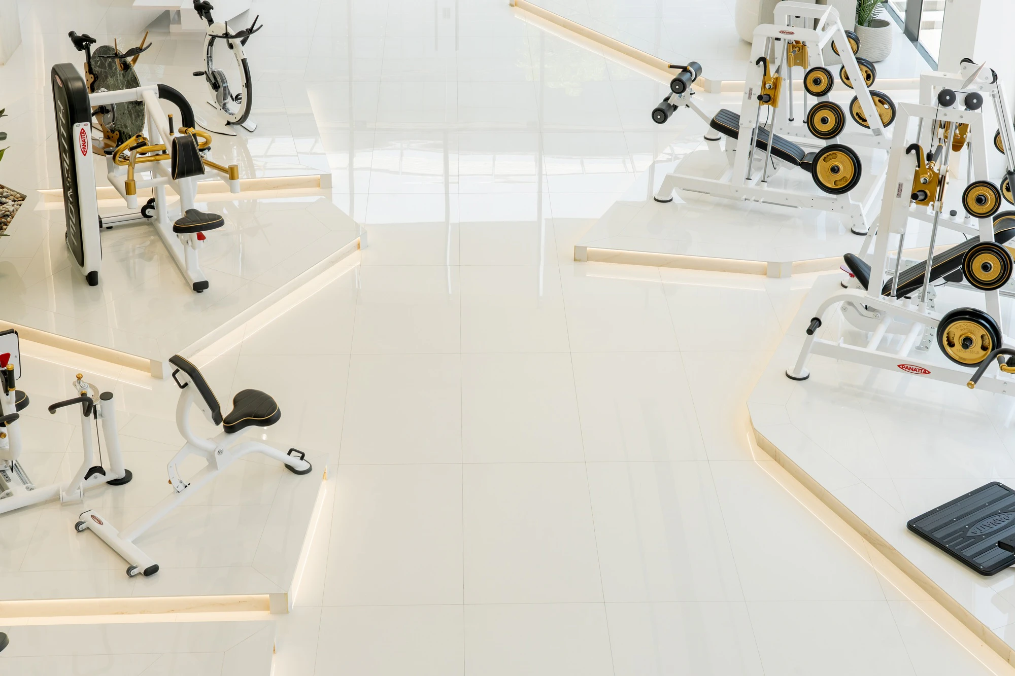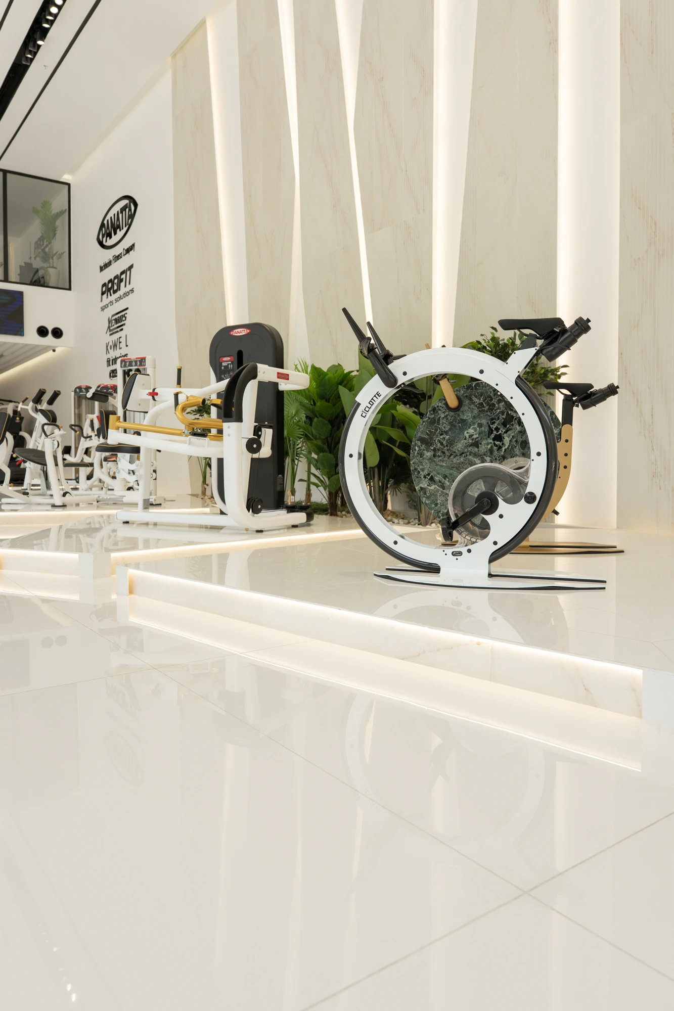 The rest of the space is populated by customised machines with pearl finishes and golden accents that don’t clash but rather complement the white atmosphere. The products are displayed as if they were part of a next-generation art gallery.
