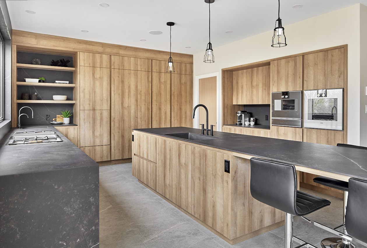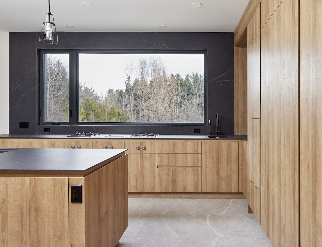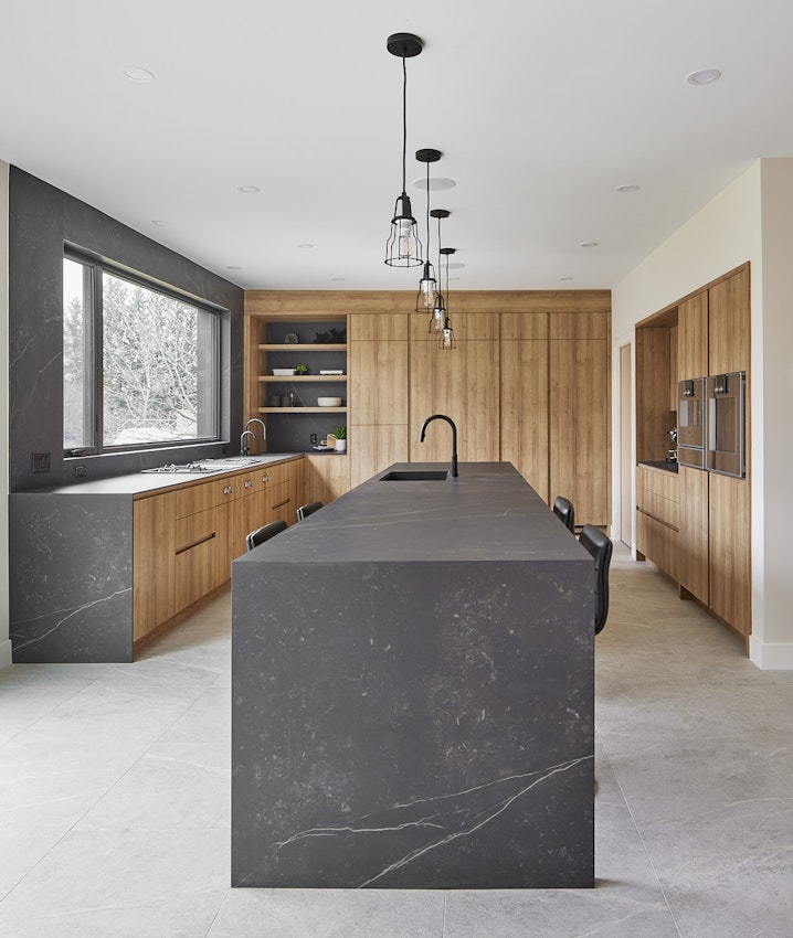 This kitchen blends a touch of rusticity with contemporary sensibilities. Its clean lines and efficient design let the materials and functionality of the space shine. Dekton Kelya perfectly frames the picture window, allowing the serene vista to become a part of the kitchen.