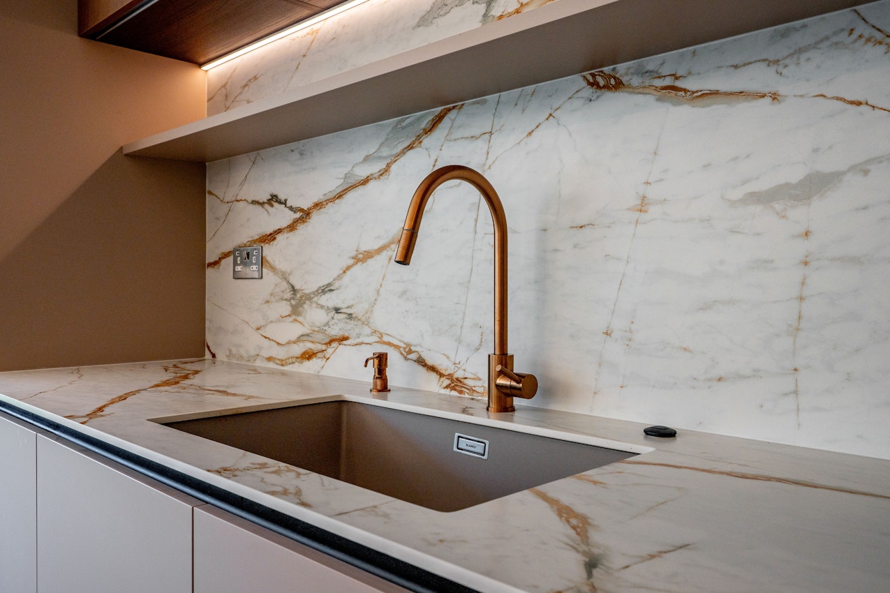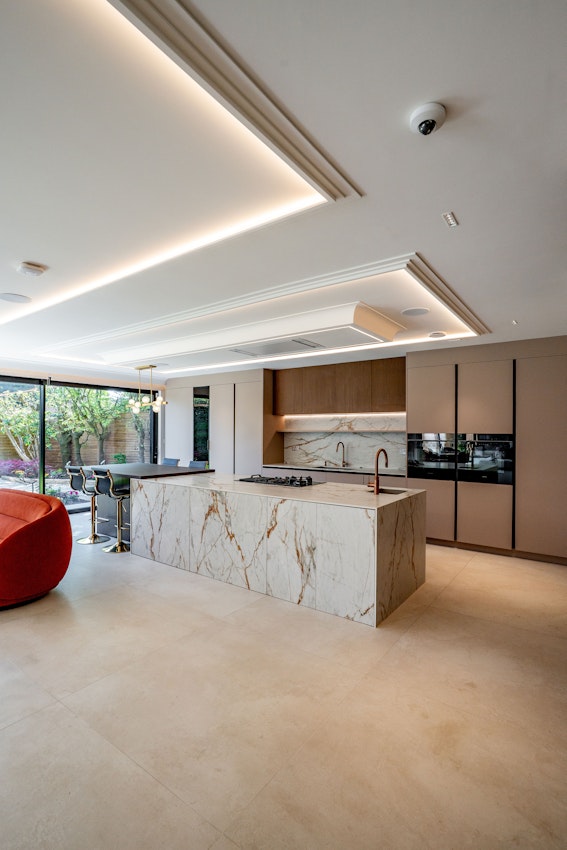 For this kitchen the client wanted a modern design with a Wow Factor. We decided to use Dekton Reverie combined with wood elements, earthy tone colours and a rose copper Quooker Tap. In addition to this to make it even more unique, we cladded the Island Units with Dekton Reverie as well.