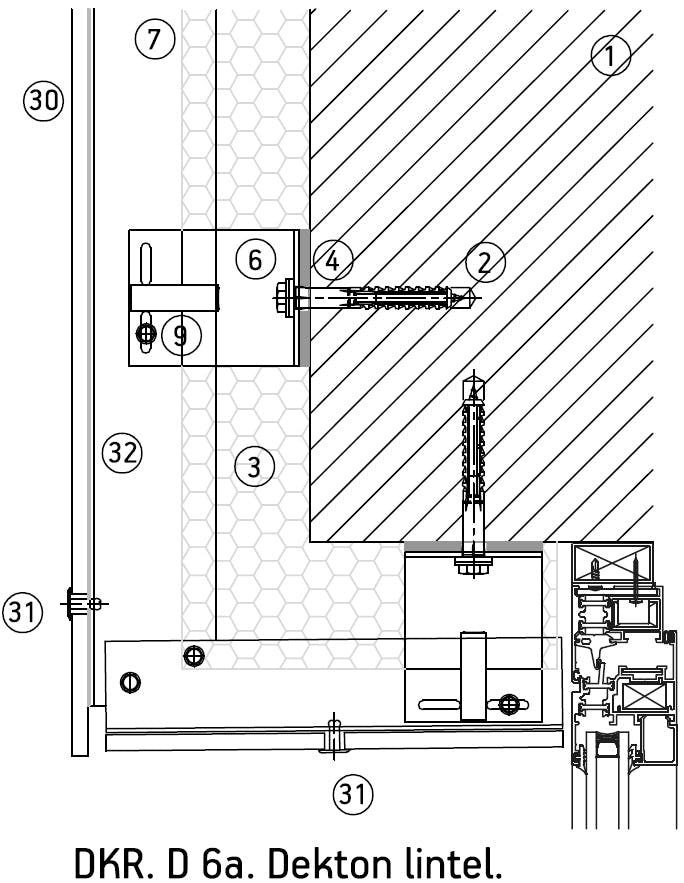 Met het DKR-systeem kunnen Dekton®-delen met een dikte van 4 mm en 8 mm rechtstreeks met klinknagels worden bevestigd op verticale profielen of een substructuur, zodat de materiaal- en installatiekosten kunnen worden verminderd. Klinknagels en boren kunnen in roosters met verschillende dichtheden in het deel worden geplaatst om te voldoen aan de weerstandsvereisten van het project. De twee vaste punten die met cilinders worden vastgezet, ondersteunen het gewicht van het deel terwijl de rest van de klinknagels de windbelastingen ondersteunen. Hierdoor is een flexibel voegontwerp mogelijk.