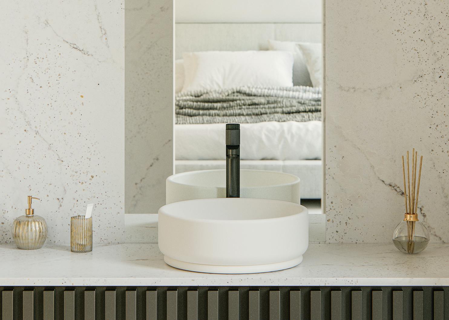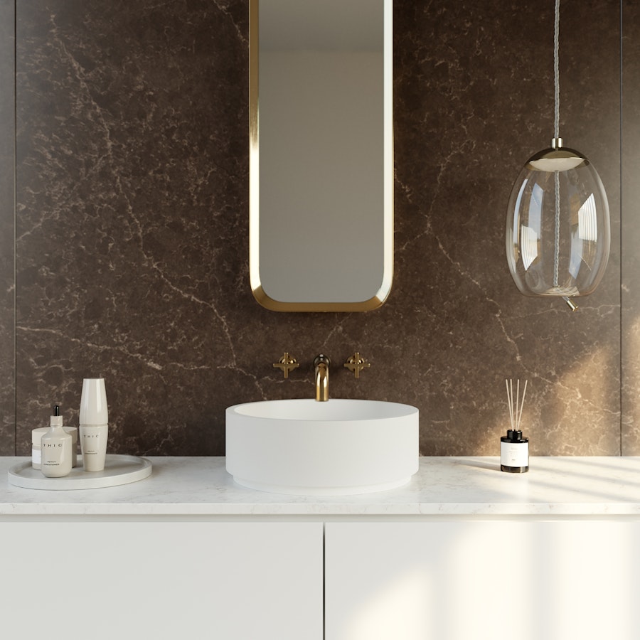 Onze ontwerpen zijn zeer veelzijdig en maken het mogelijk om grootformaat meubels en bekledingen te creëren, evenals douchebakken, tafelbladen en kaptafels, die perfect geïntegreerd of gecombineerd kunnen worden met de afwerking van de wastafel.