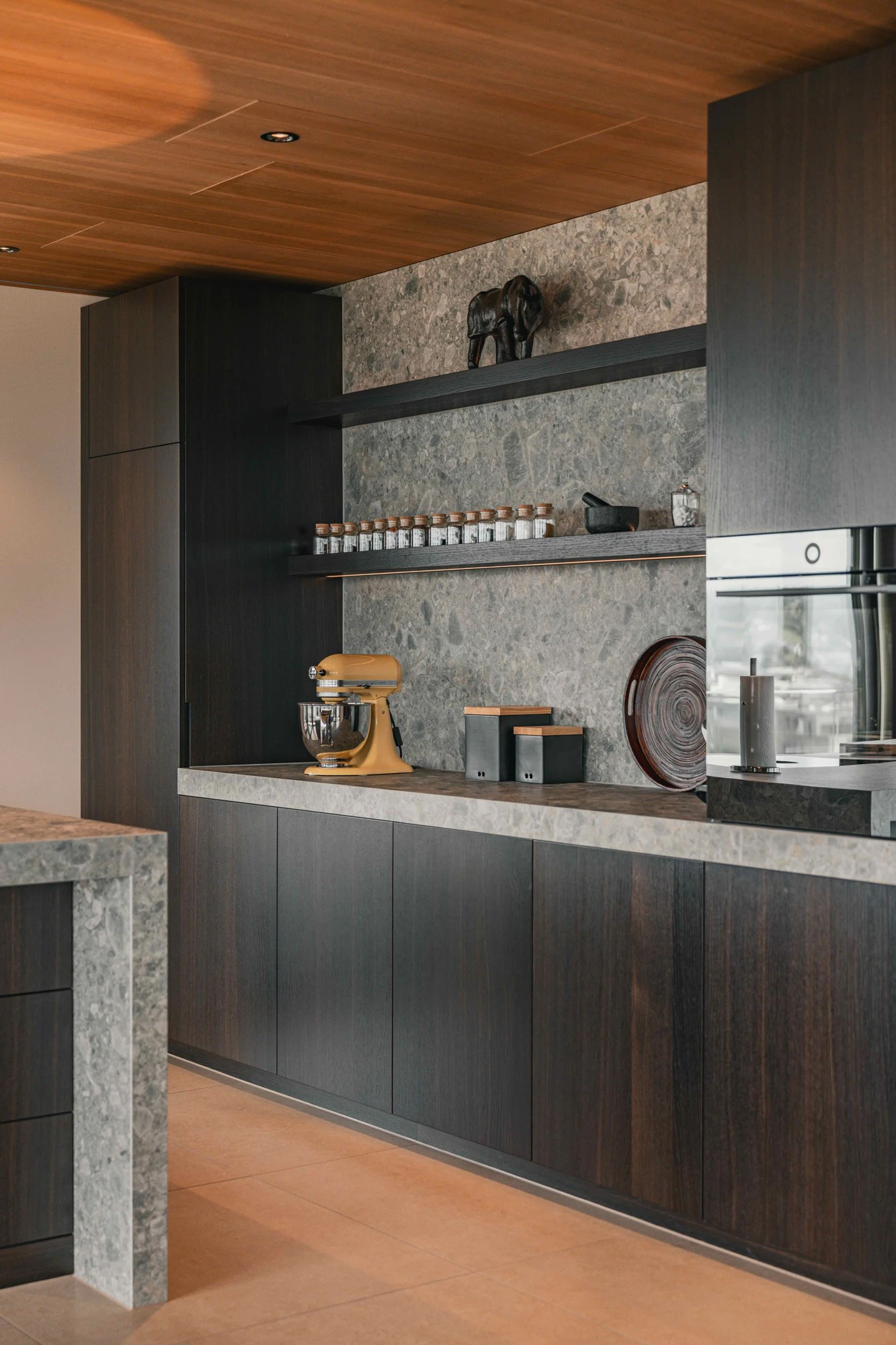 For the studio, the defining feature of the project is also the balance between strong material presence and visual restraint: “The combination of dark wood volumes with the expressive texture of Dekton Ceppo creates a clear architectural rhythm, where the kitchen island becomes a central element without dominating the space. Additionally, the continuity of materials across different surfaces enhances the sense of depth and reinforces the serene and cohesive character of the interior,” the team explains.