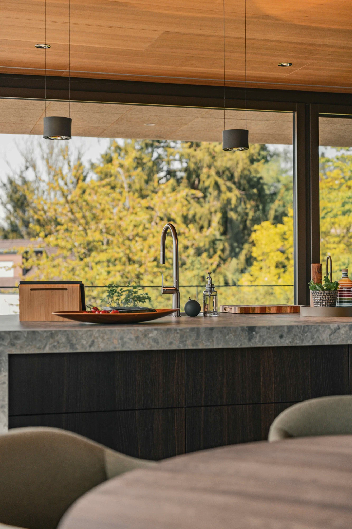 Since this continuity was important for the kitchen's appearance, large Dekton slabs were chosen, allowing for a clean and precise aesthetic language. “Dekton Ceppo allowed us to maintain a refined and architectural image for the project, while ensuring suitable performance for a contemporary kitchen,” Lindau states.