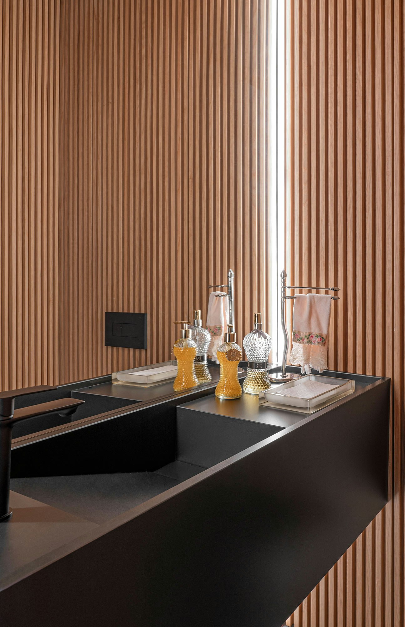 E é nesses espaços mais privados que encontramos a segunda contribuição da Cosentino, especificamente no lavabo, onde Dekton Domoos, em tom escuro fosco, é utilizado na bancada e no lavatório para criar um contraste sóbrio com a madeira clara.
