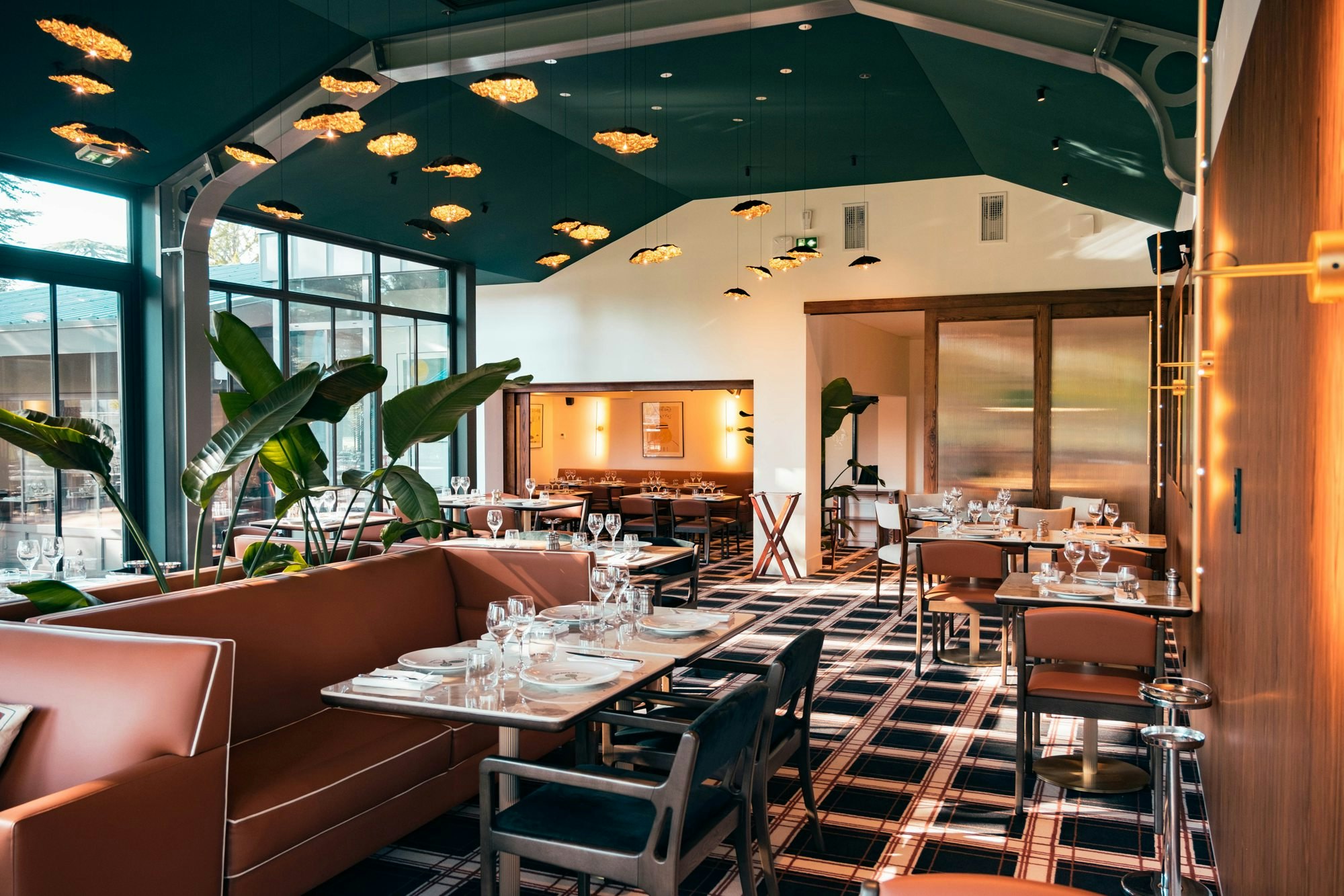 Across both the indoor and outdoor spaces, a clear design narrative emerges: a palette of deep greens, warm woods, graphic tartans, and subtle references to the world of tennis clubs. Vintage Roland-Garros posters, caramel-toned banquettes, brass lighting, and expansive windows create a warm, immersive atmosphere where each detail contributes to the identity of the place.