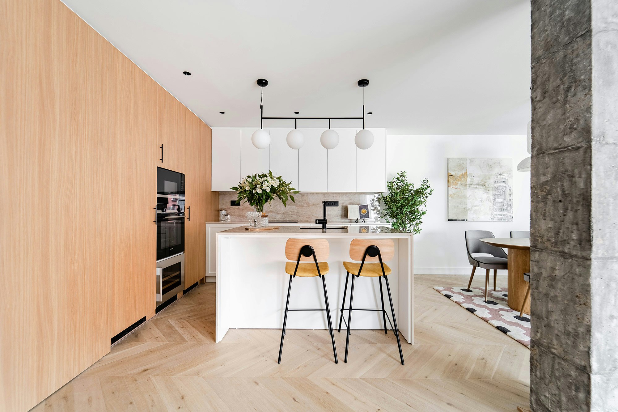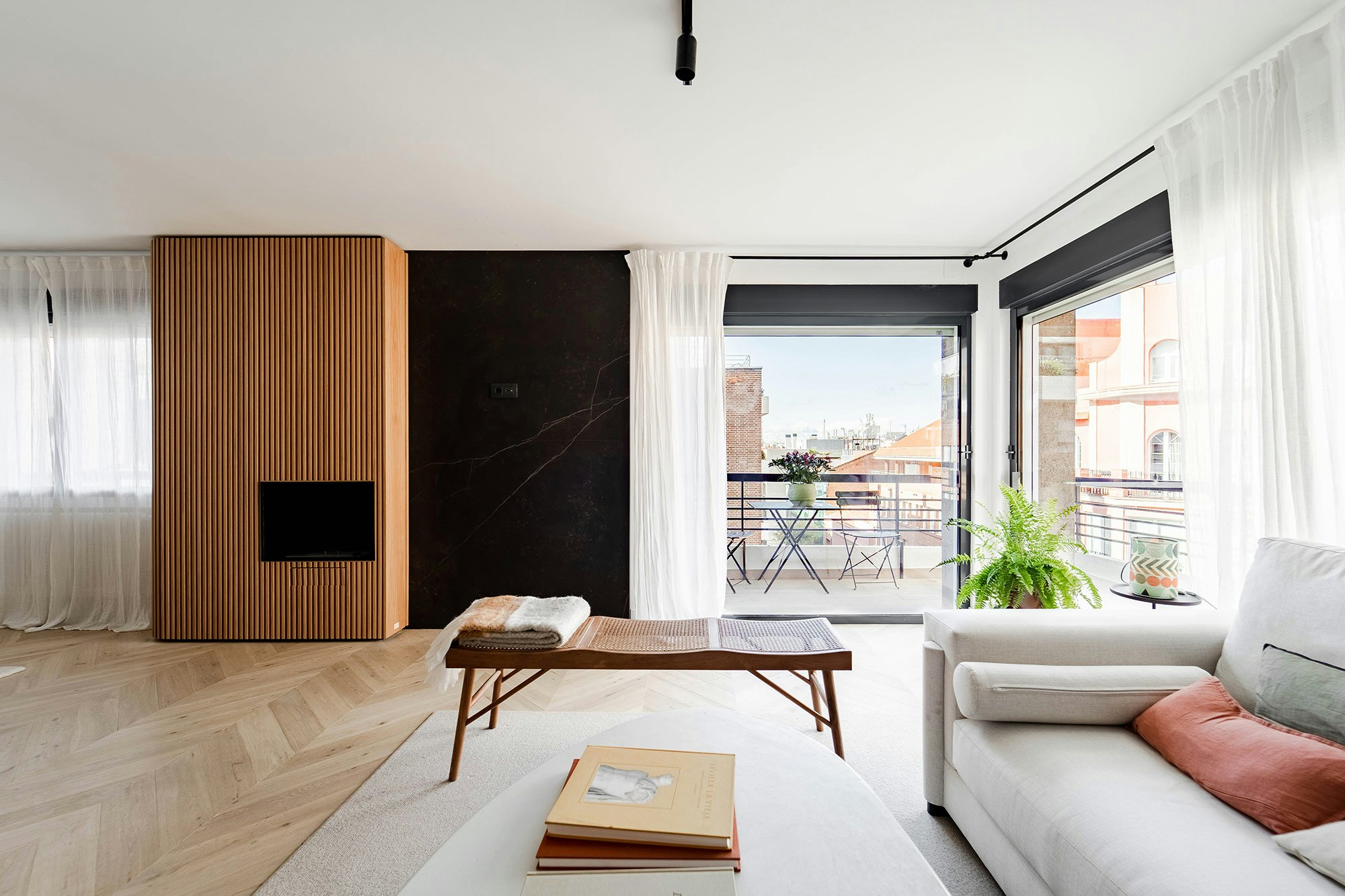 “Arranging and sectioning the four zones of this day area into a space of square proportions with a pillar in its centre” was the big challenge for Mónica Diago when it came to renovating this 180 m2 home in the Barrio de Salamanca neighbourhood, in Madrid. “That is why we decided to make exposed concrete the element around which the four zones – kitchen, dining room, living room and reading room – revolve. In addition, we wanted to create a characterful backdrop between the large windows, so we designed a panelled wall in oak and black Dekton, which gives the living room a powerful visual impact and catches the eye as soon as you enter the area”, says the architect. This is not the only place where Diago opted for Dekton to add a touch of elegance and sophistication. The open-plan kitchen also features this Cosentino surface. Here it was combined with oak wood to create continuity with the rest of the common areas.