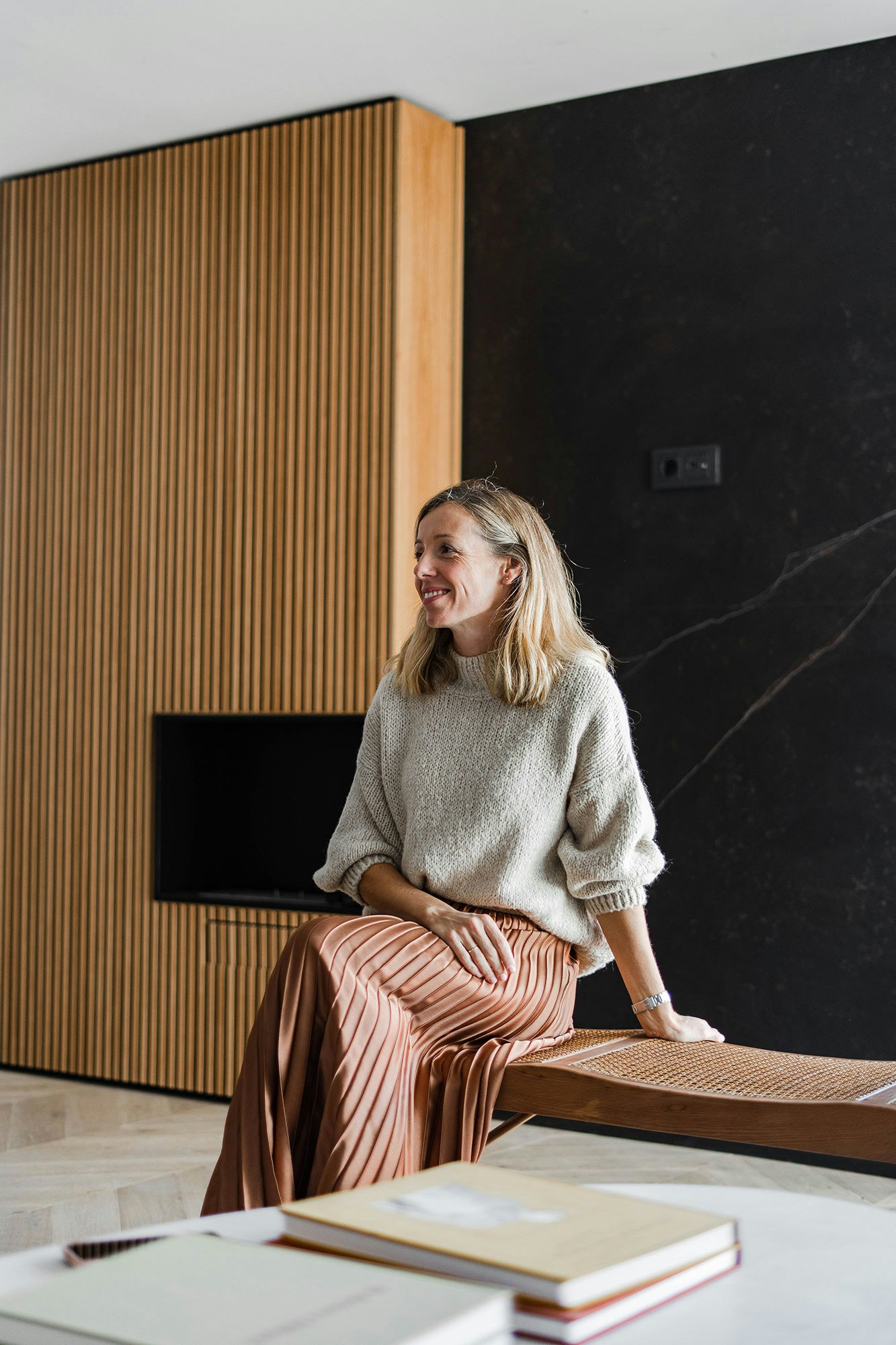 “On the worktop, Arga veining matches the lacquered kitchen fronts and the oak columns”, says Diago. “Meanwhile, the black shade of Kelya, which was used for the vertical wall of the fireplace, adds a sophisticated and elegant touch to the wall and matches perfectly with the ironwork and other decorative accessories, as well as the black exterior woodwork”, she further says.