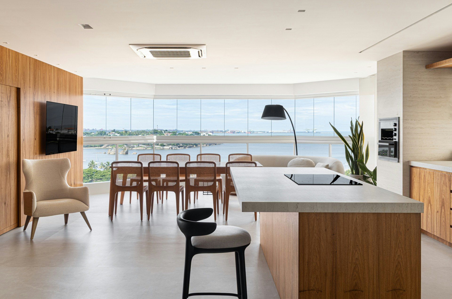 O projeto foi concebido para promover a convivência e a conexão. A disposição da bancada e da ilha na mesma altura favorece a interação entre quem cozinha e quem observa, transformando o preparo das refeições em um momento compartilhado.