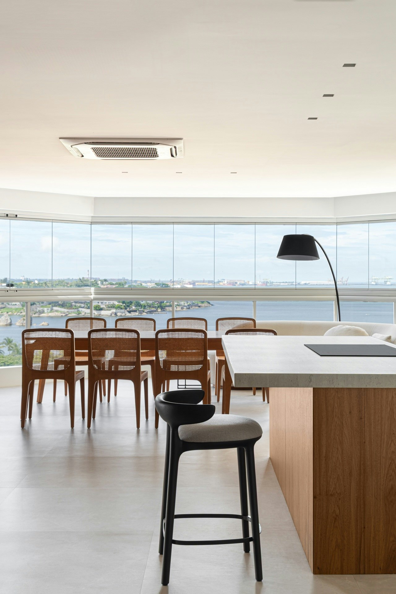 A mesa de jantar, localizada ao lado da varanda envidraçada, oferece uma vista privilegiada para o exterior e reforça o vínculo com a paisagem. A composição se completa com a torre de churrasqueira e um balcão auxiliar.