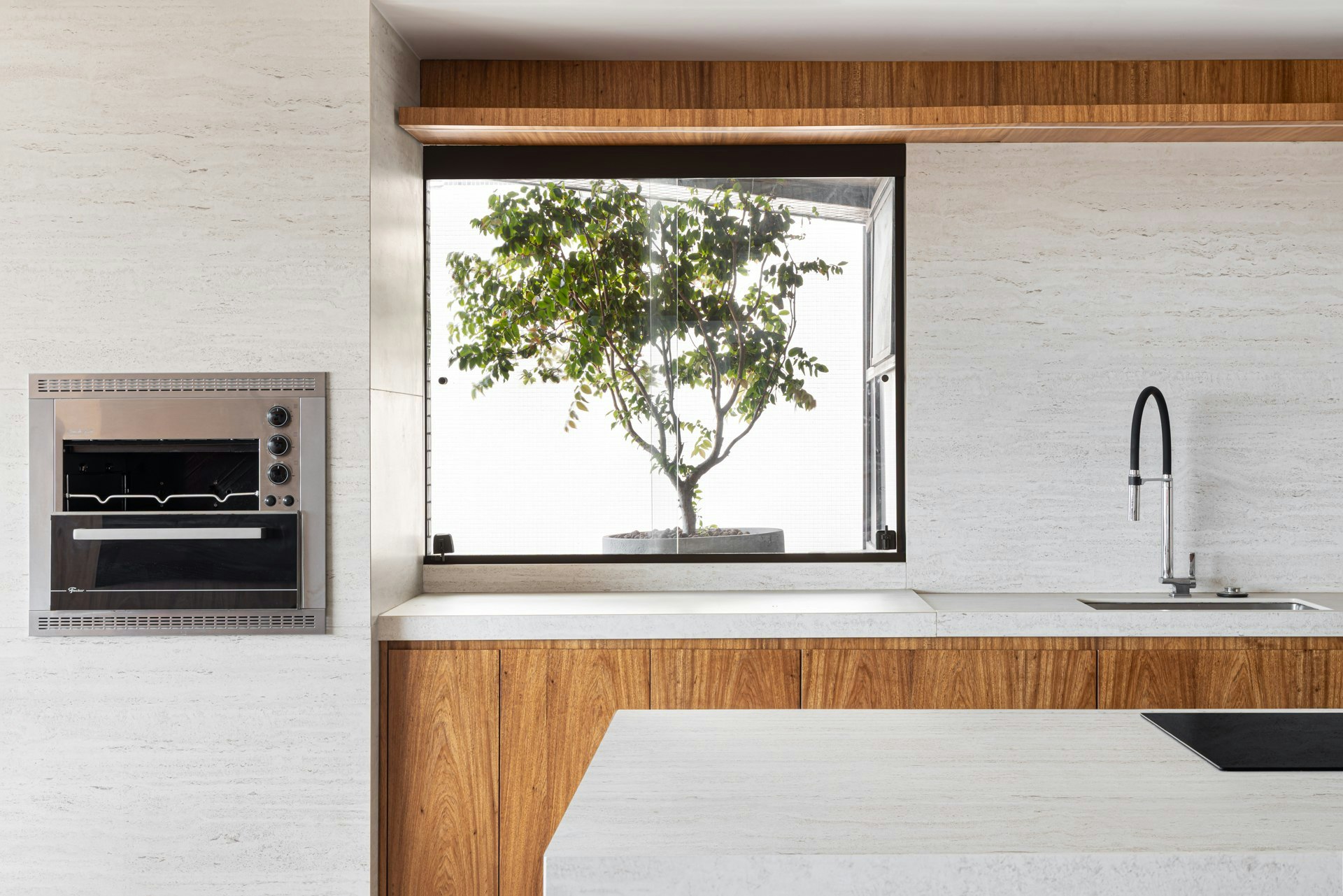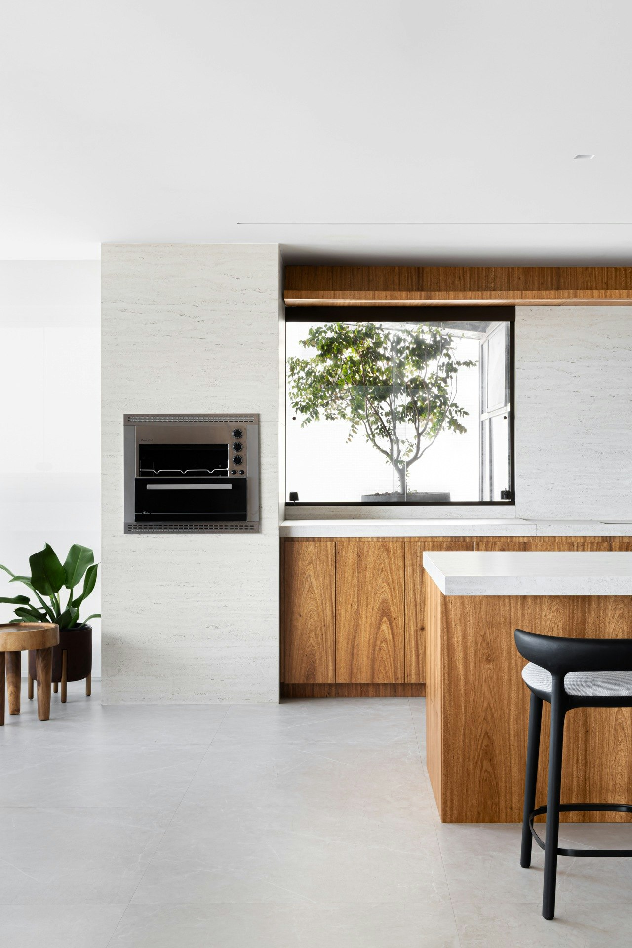 “O ponto de partida deste projeto foi a janela que dava para um vaso externo do edifício, onde plantamos uma jabuticabeira. A partir daí nasceu tudo: a bancada, a ilha e a torre de churrasqueira. A janela se transformou em um verdadeiro quadro vivo, trazendo o verde para o interior”, explica a arquiteta Carolina Ferraz.