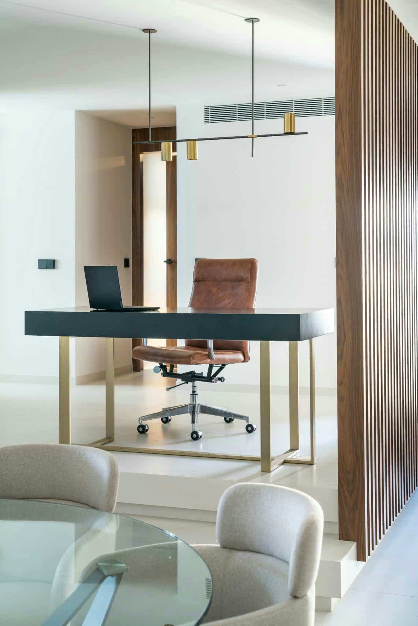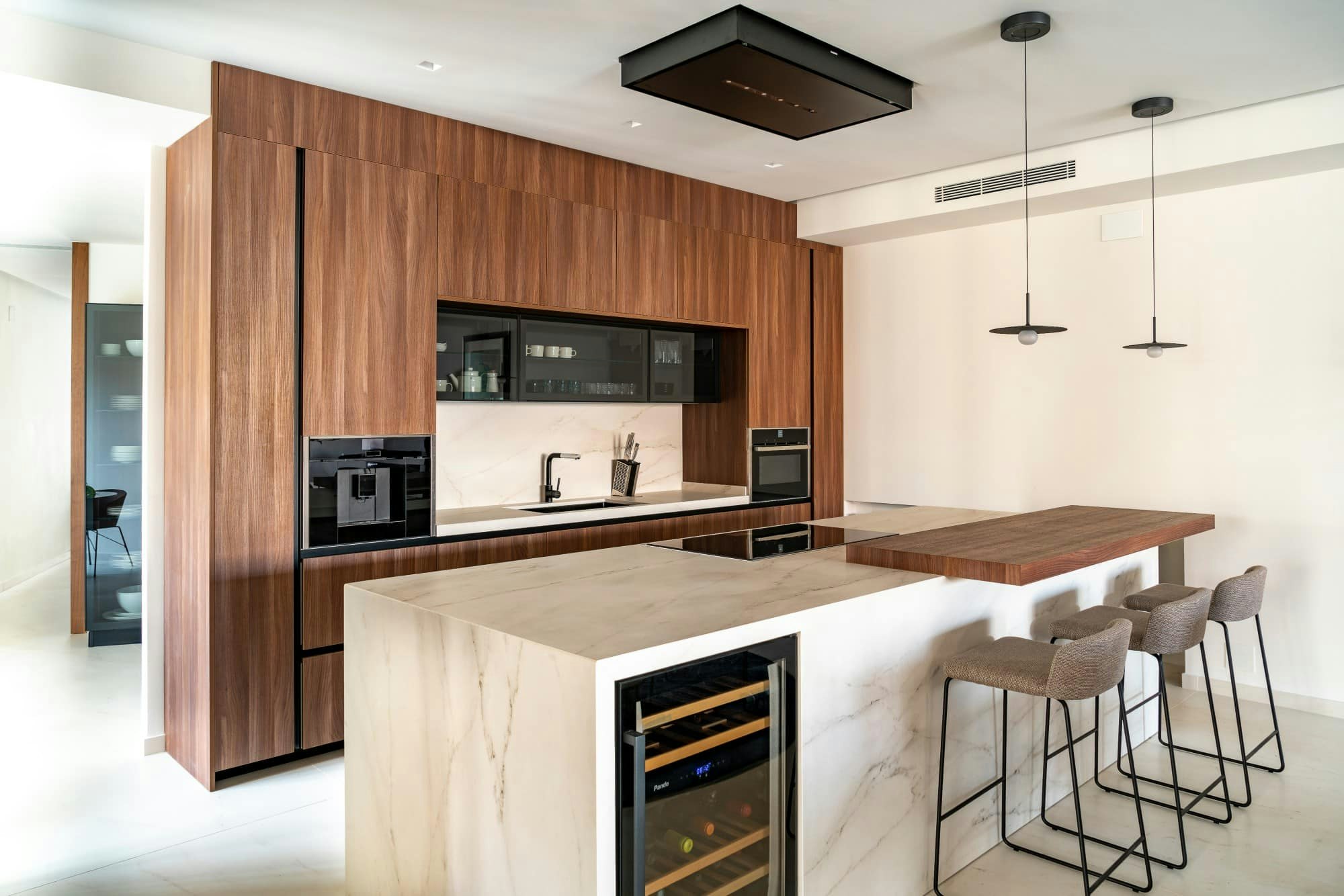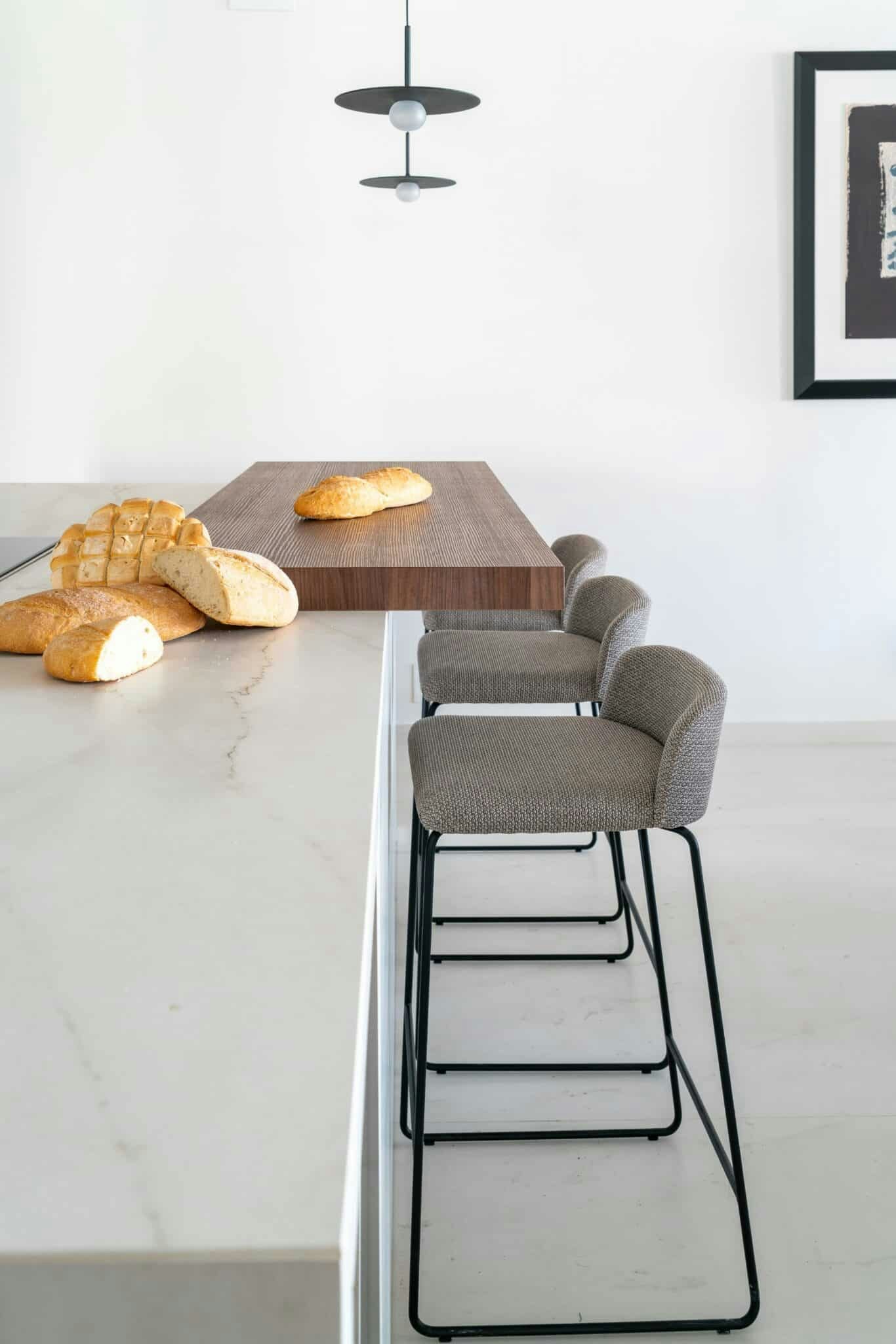 According to the architects, ‘The building itself has been a great source of inspiration for us. The light, the surrounding façade, the colours and materials, the exterior wooden latticework that surrounds and protects it, etc. We wanted all this to be reflected in the house in some way, bringing the essence of the original project to the present.’ This is the case of the entrance, where a wooden framework that emulates the construction detail of the exterior separates the hall from a work area and directs us towards the kitchen. In this area, the same tones blend seamlessly with the grey and gold veining of Dekton Rem to form a large island. The hardness of the material makes it possible to cut directly on it without the knife scratching it or to place a hot pan on it without the risk of burning it.