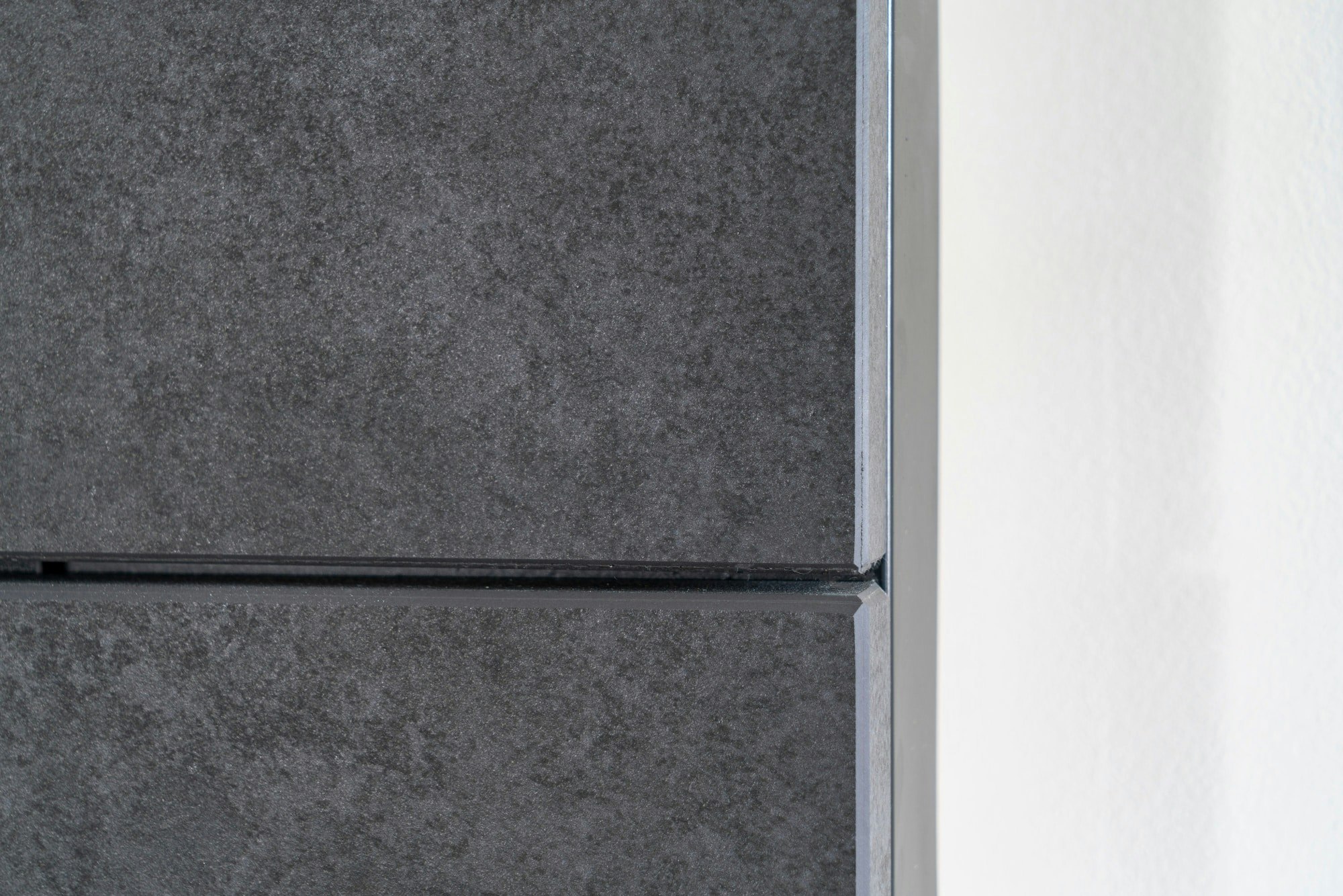 Silestone Eternal Noir 12mm; Silestone Charcoal Soapstone 12mm; Dekton Rem 20mm; Reformulated Dekton Rem 8mm; Dekton Liquid Shell 8mm; Dekton Eter 8mm and 4mm (fireplace)