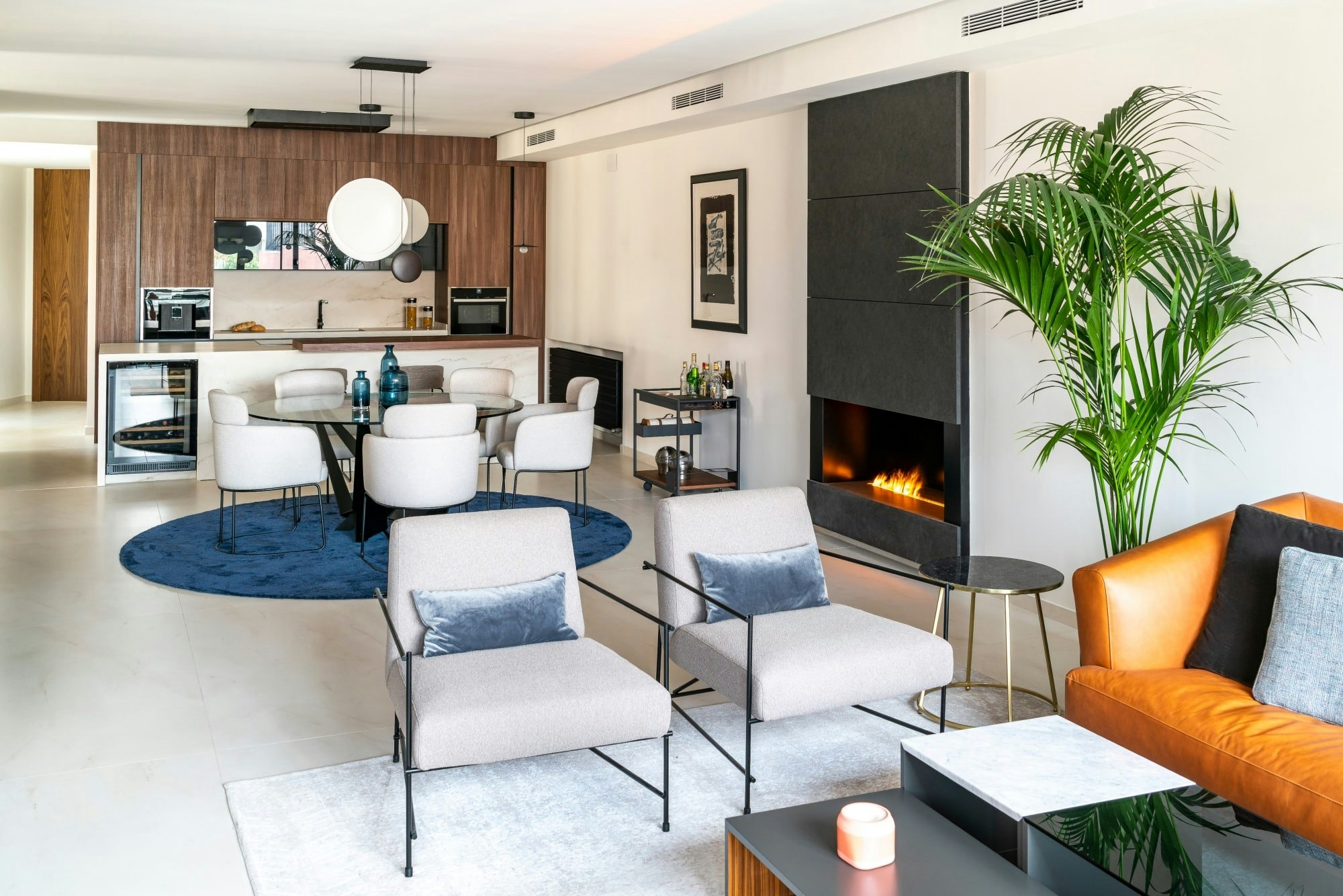 Next to the island, in the same open-plan space, is the dining and living area which in turn connects to one of the terraces. Neutral colours such as grey, blue and white stand out here, with hints of dark tones, such as the aforementioned wood or a Dekton Eter fireplace unit that gives a distinctive look to the whole space. ‘We have worked with both Silestone and Dekton in different models, using them for applications in which everyone is more or less used to seeing and using them, such as flooring, bathrooms and worktops. But also, using them for unique custom-made features that match them, such as the fireplace itself, the flower beds…’ They are materials with almost endless possibilities.’