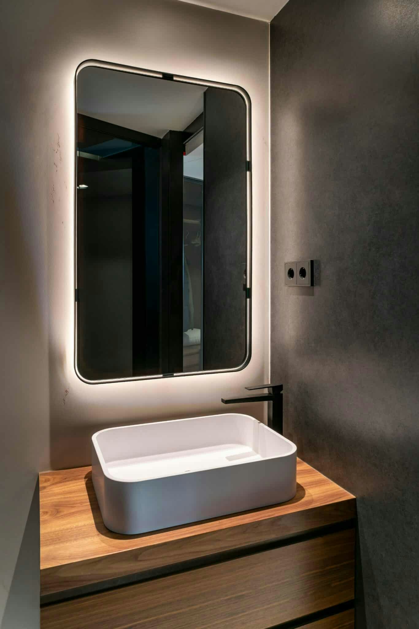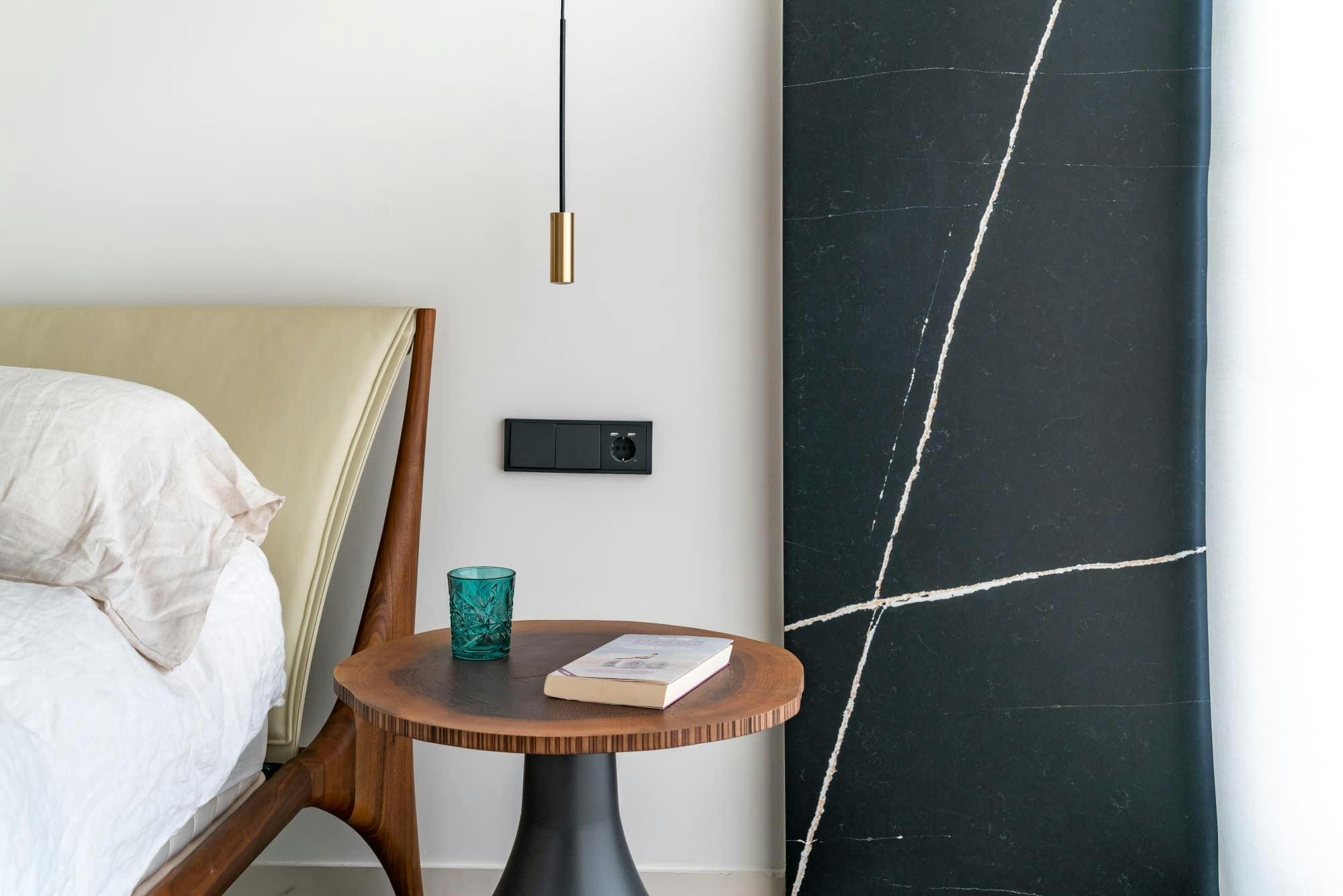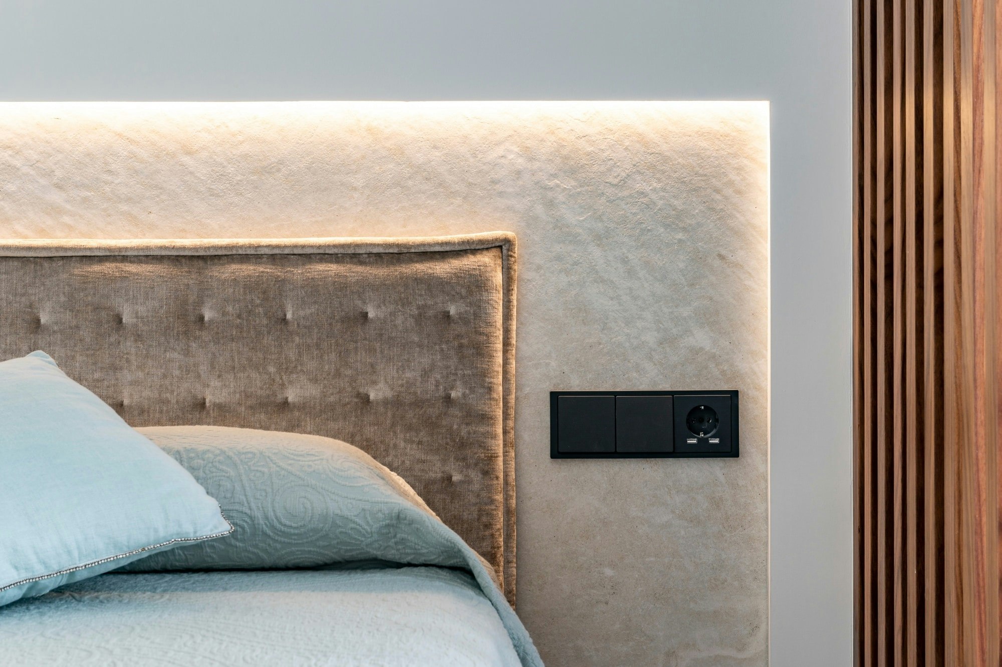 Perhaps one of the most impressive uses of Dekton in this home is the headboard in the guest bedroom, where the Liquid Shell colour becomes a kind of bas-relief with a warm, silky feel that is made even more striking with careful LED lighting.
