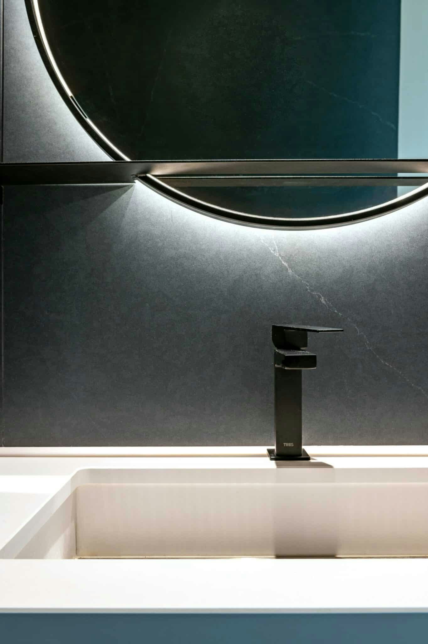 Something similar occurs with the two Silestone Eternal Noir columns that frame the master bedroom and connect the range of light colours that characterise the public area and the dark tones that dominate the bathrooms, which are made entirely in this Silestone colour or in Dekton Eter and Silestone Charcoal Soapstone.