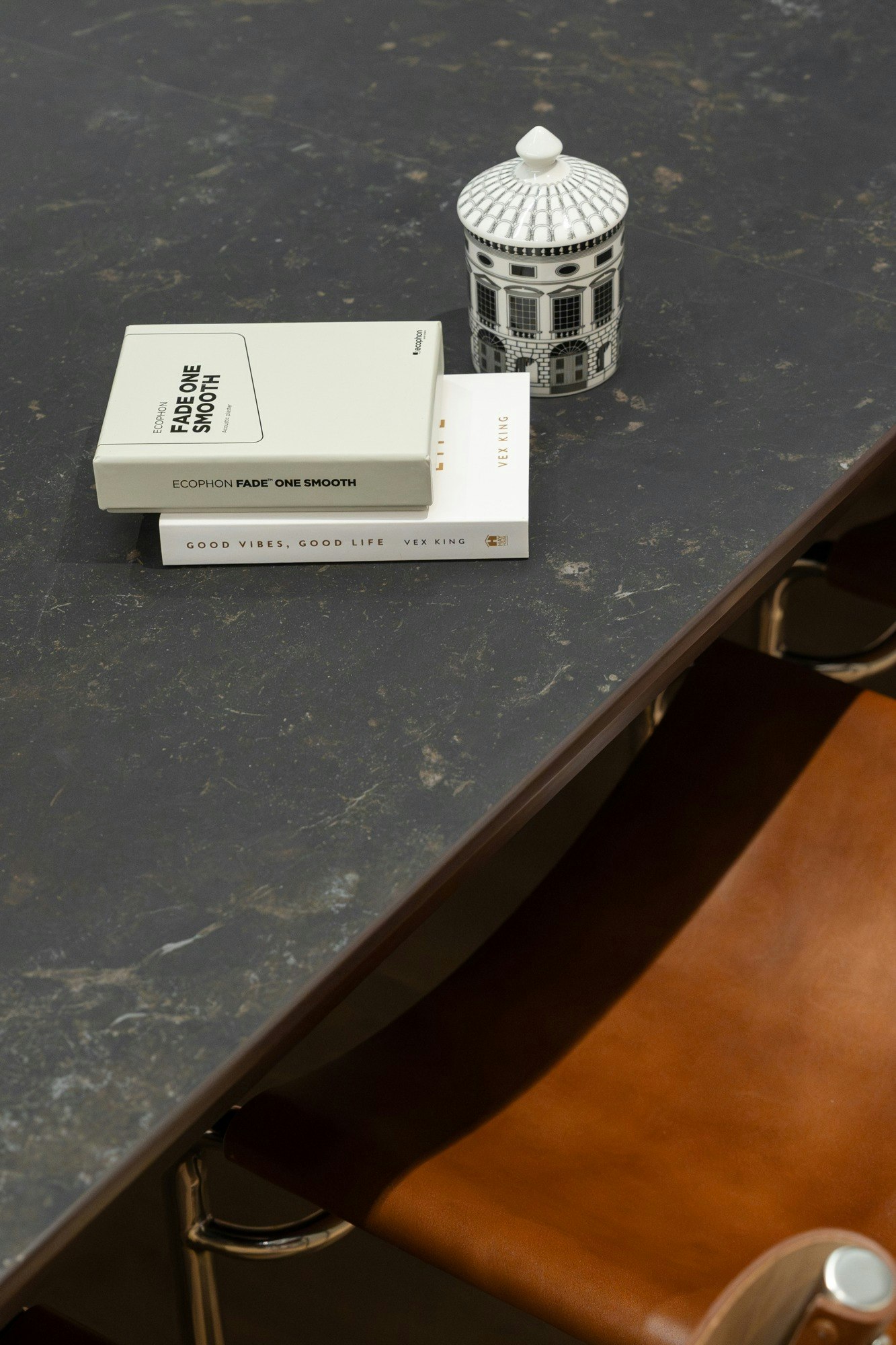 The meeting room, an intimate setting designed for more formal and private interactions, features a table with a Dekton Kelya top, accompanied by leather-backed chairs. The kitchen worktop is also clad in Cosentino's ultra-compact surface, in this case, Dekton Bromo, as is the bathroom vanity worktop, made with Dekton Neural.