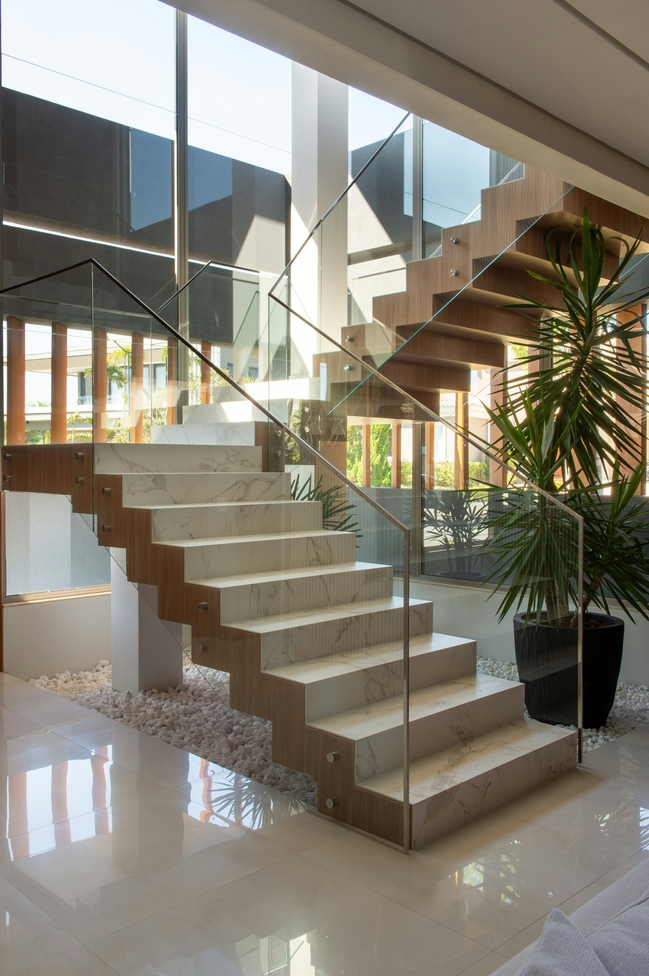 Por sua vez, Dekton Entzo, inspirado no mármore Calacatta dourado, foi utilizado nas escadas, nas paredes da sala e na bancada da cozinha. Seus veios dourados criam um ambiente elegante e acolhedor, que atrai o olhar sem se impor.
