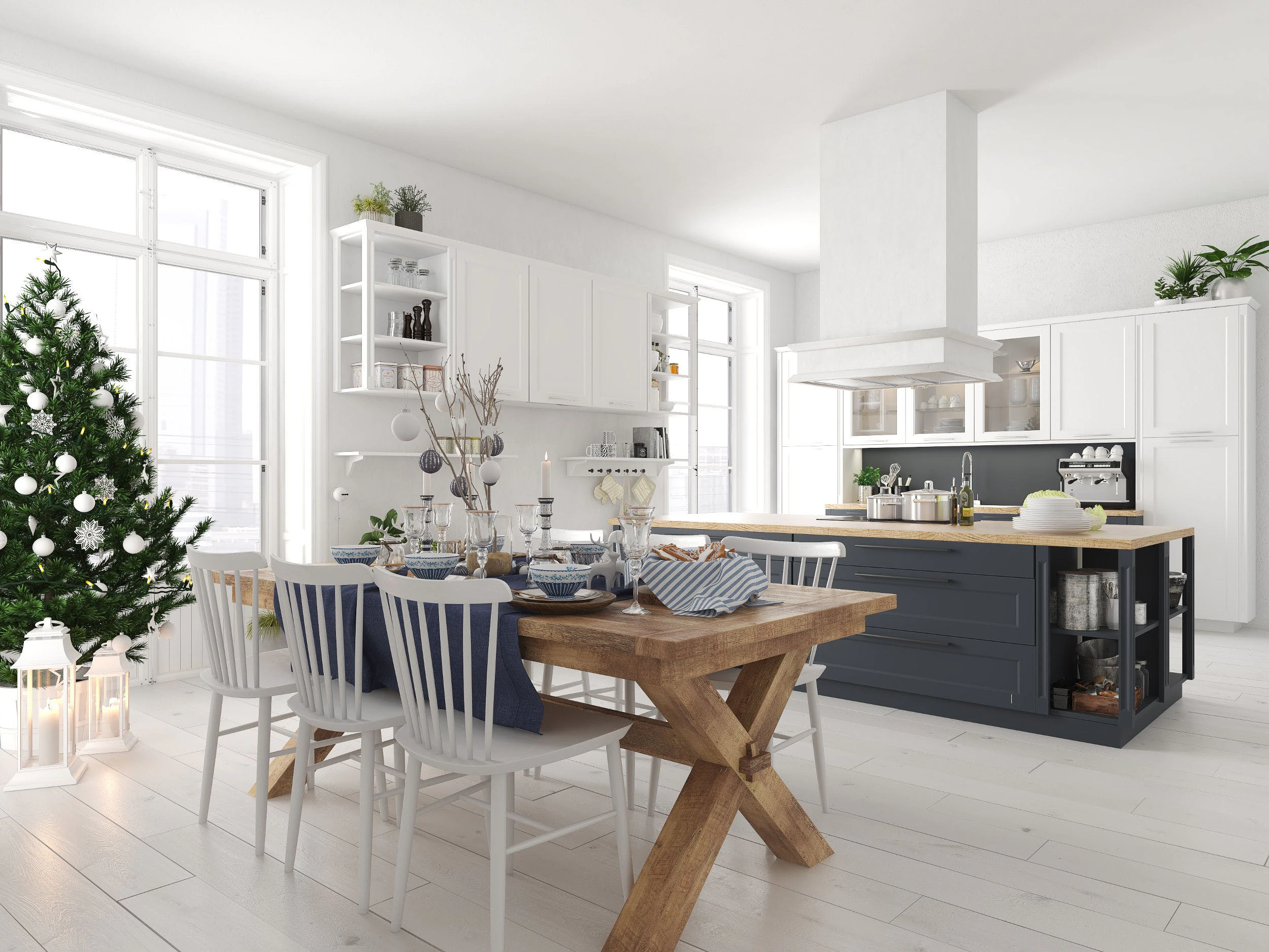 We recommend using decorations based on vegetation, which work well in any kitchen. Beyond the traditional fir, how about holly and mistletoe wreaths for doors, and poinsettia for the countertop and dining table?