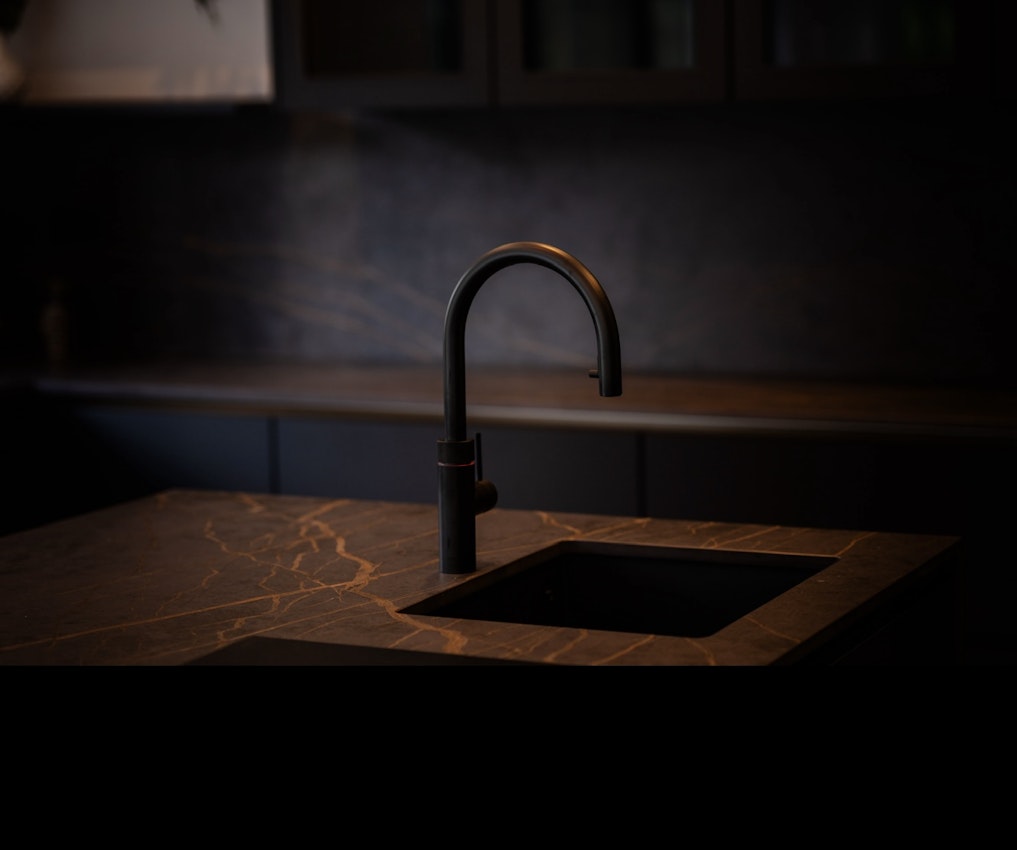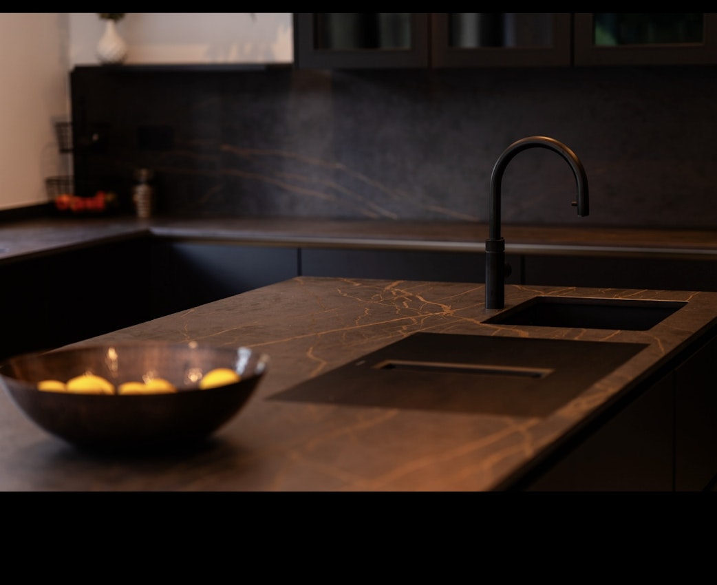 Step into a space where elegance meets functionality. This stunning kitchen features the Dekton Laurent worktop, inspired by natural stone with rich, dark tones and striking gold veining — a statement piece that exudes style and sophistication.