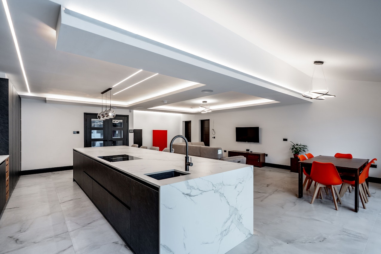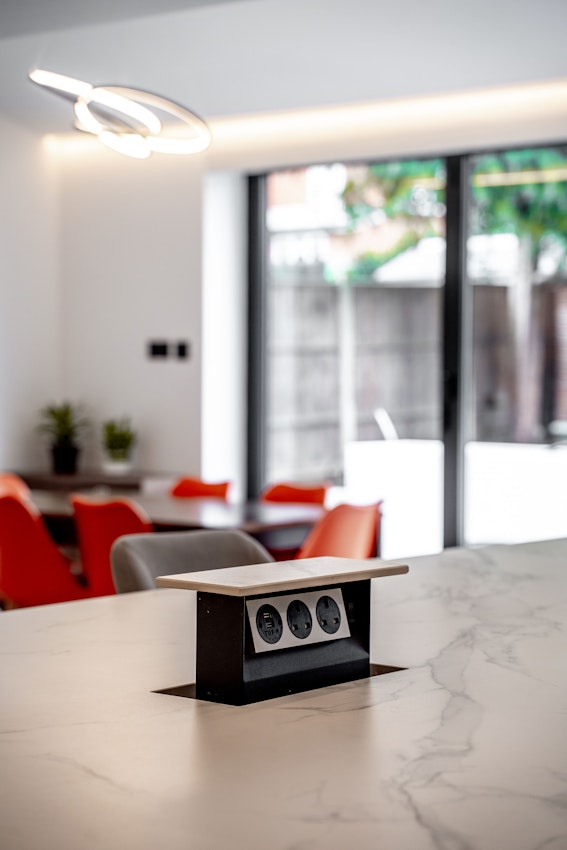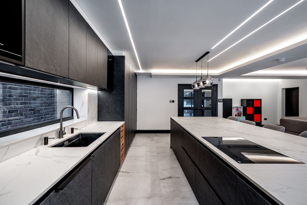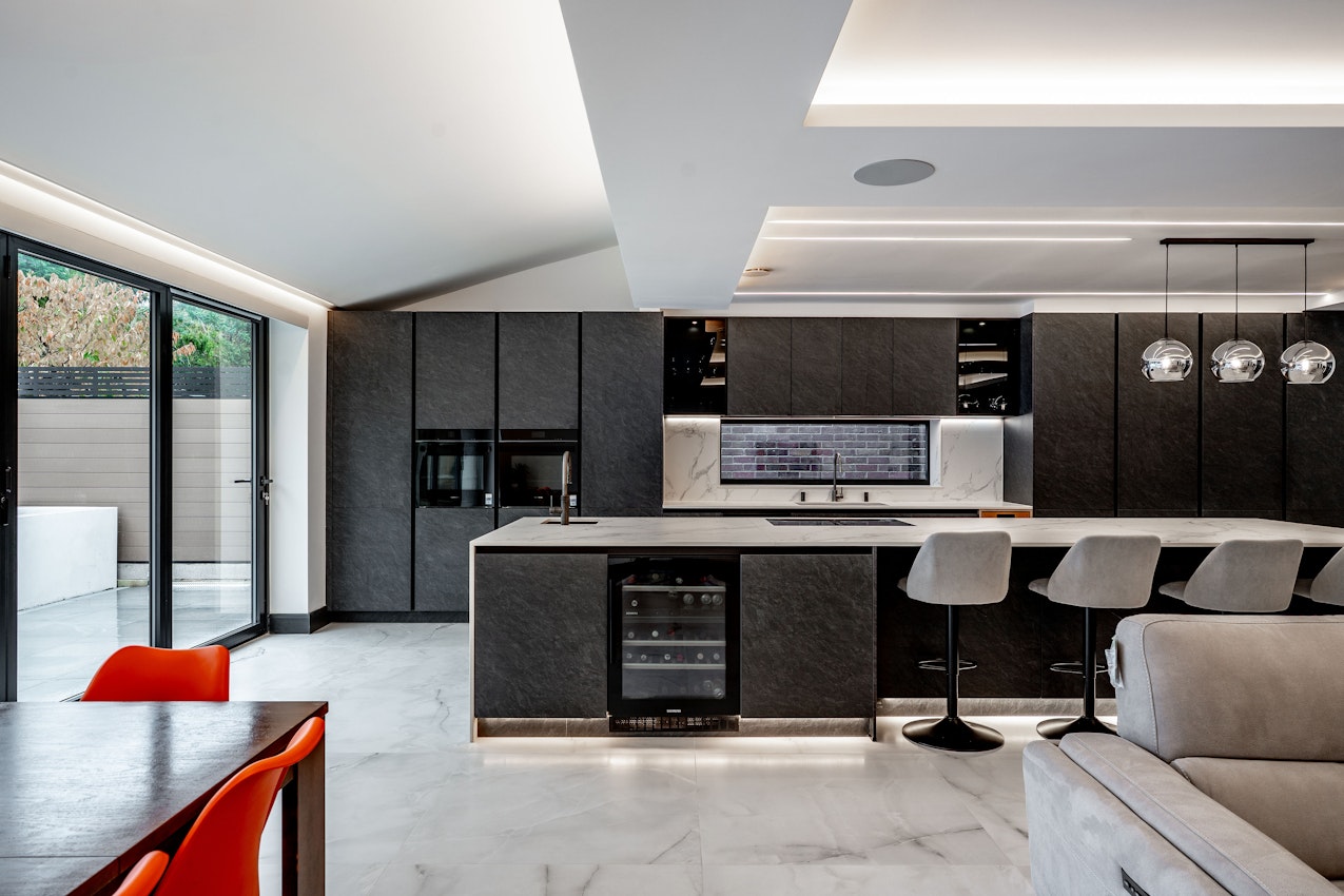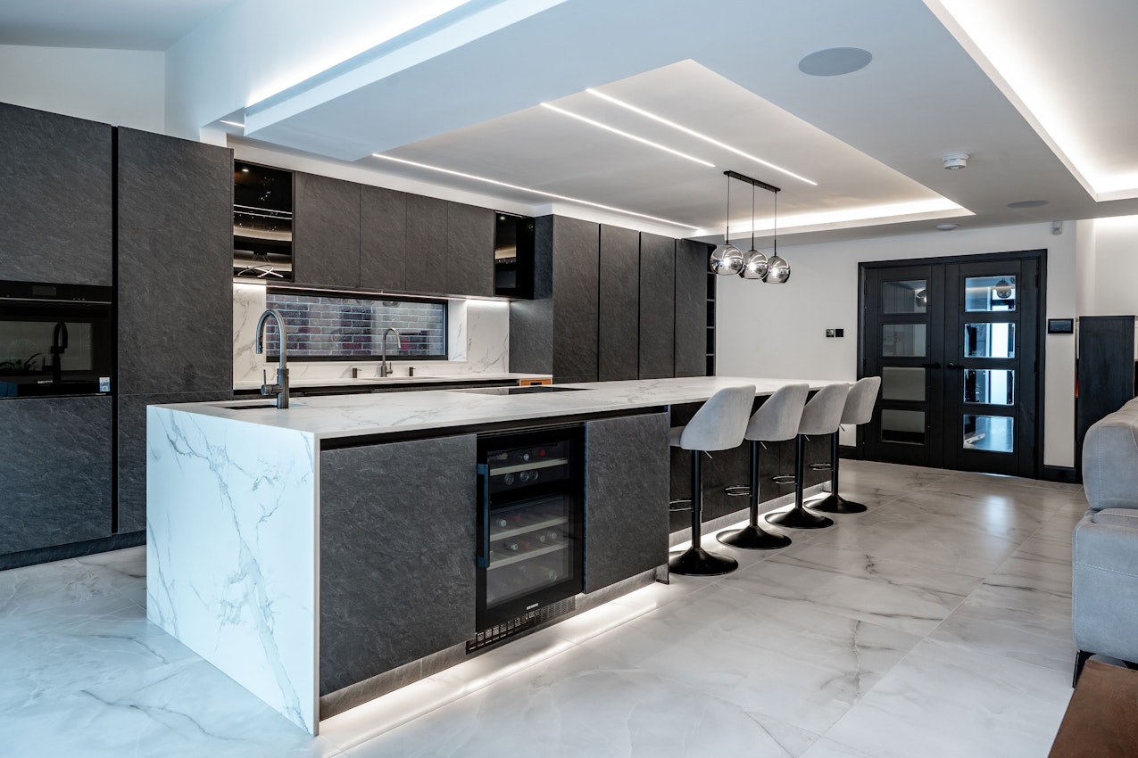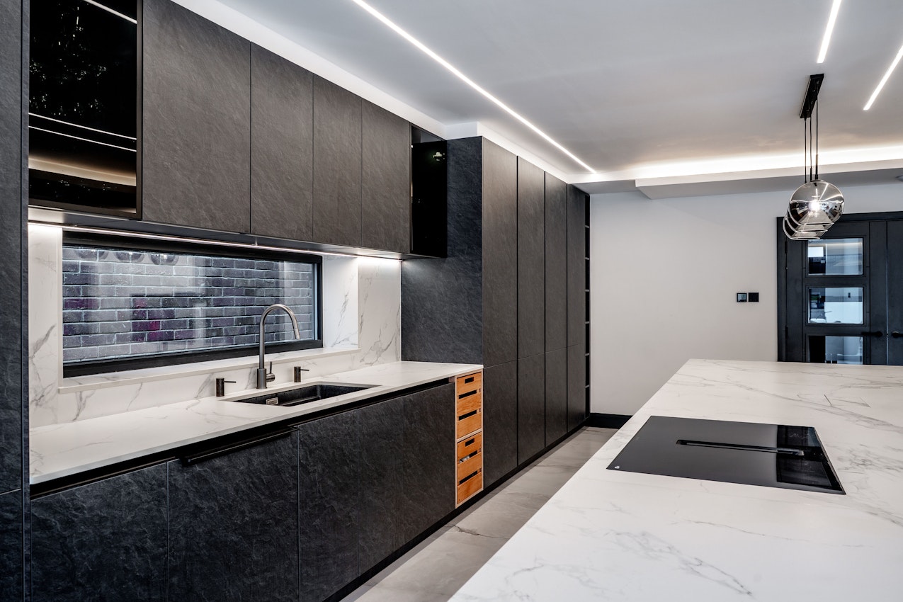 For this kitchen the client wanted a modern design with a Large Island with a Marble characteristic so we decided to use Dekton Aura. Island is 4500mm long plus they wanted a waterfall down-stand one side. They also wanted to wrap the whole window in the worktop stone which we have done it in this case showing that Dekton is a multipurpose worktop material.