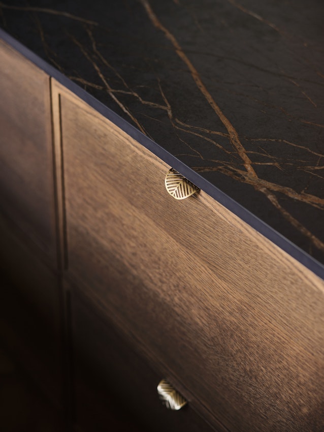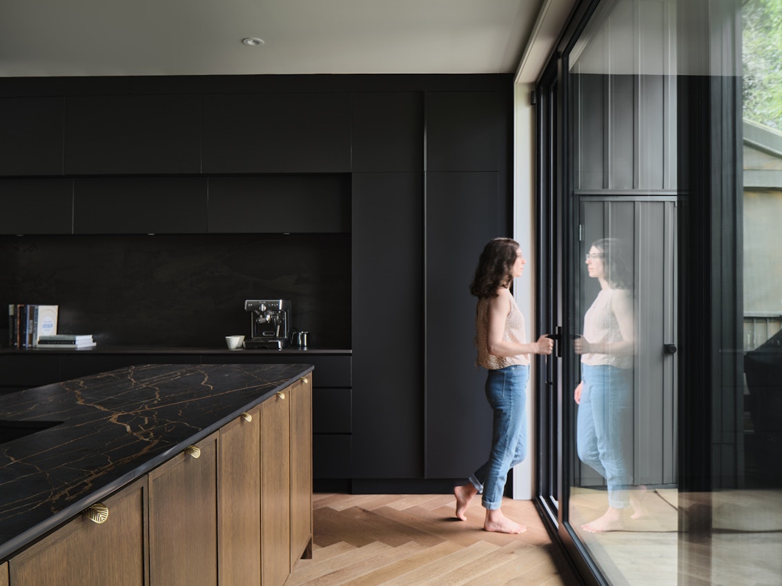 Le choix des matériaux dont le Dekton Laurent aux teintes sombres et chaudes permet de contraster avec la grande luminosité naturelle qui inonde l’arrière de la maison.