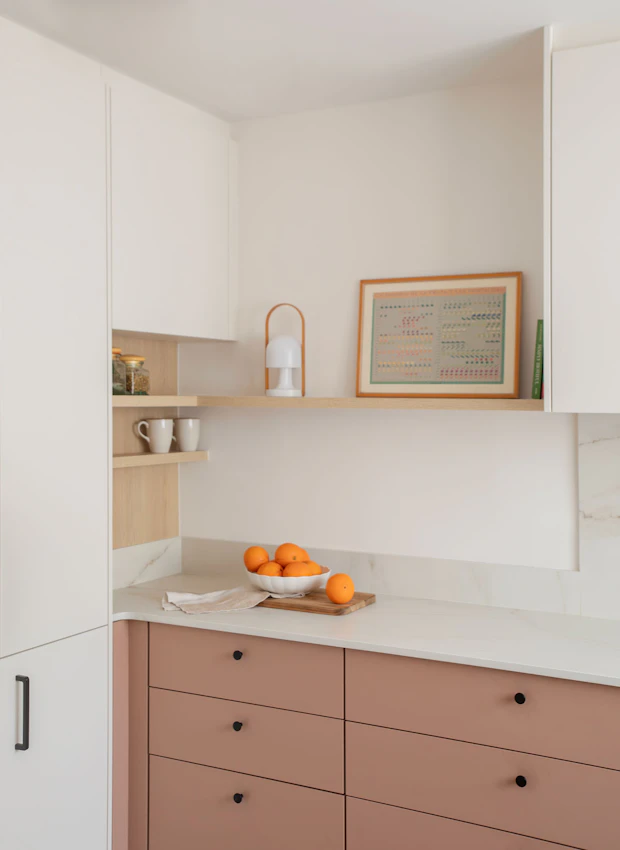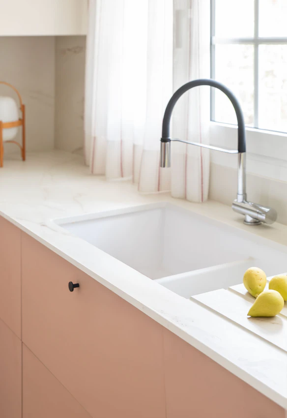 cocina en dos colores y encimera de DEKTON REM DE 2cm y aplacado de 1,2 cm