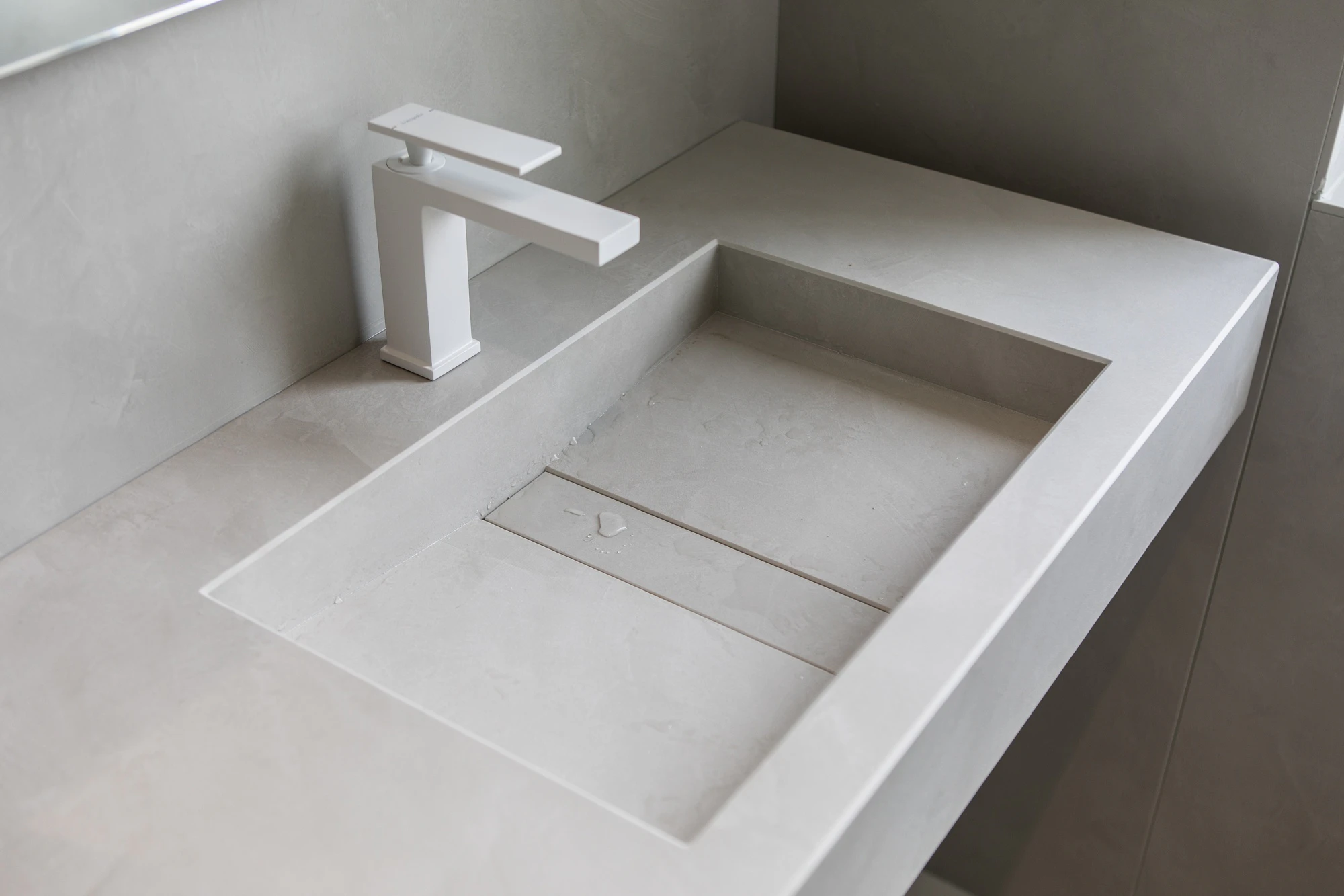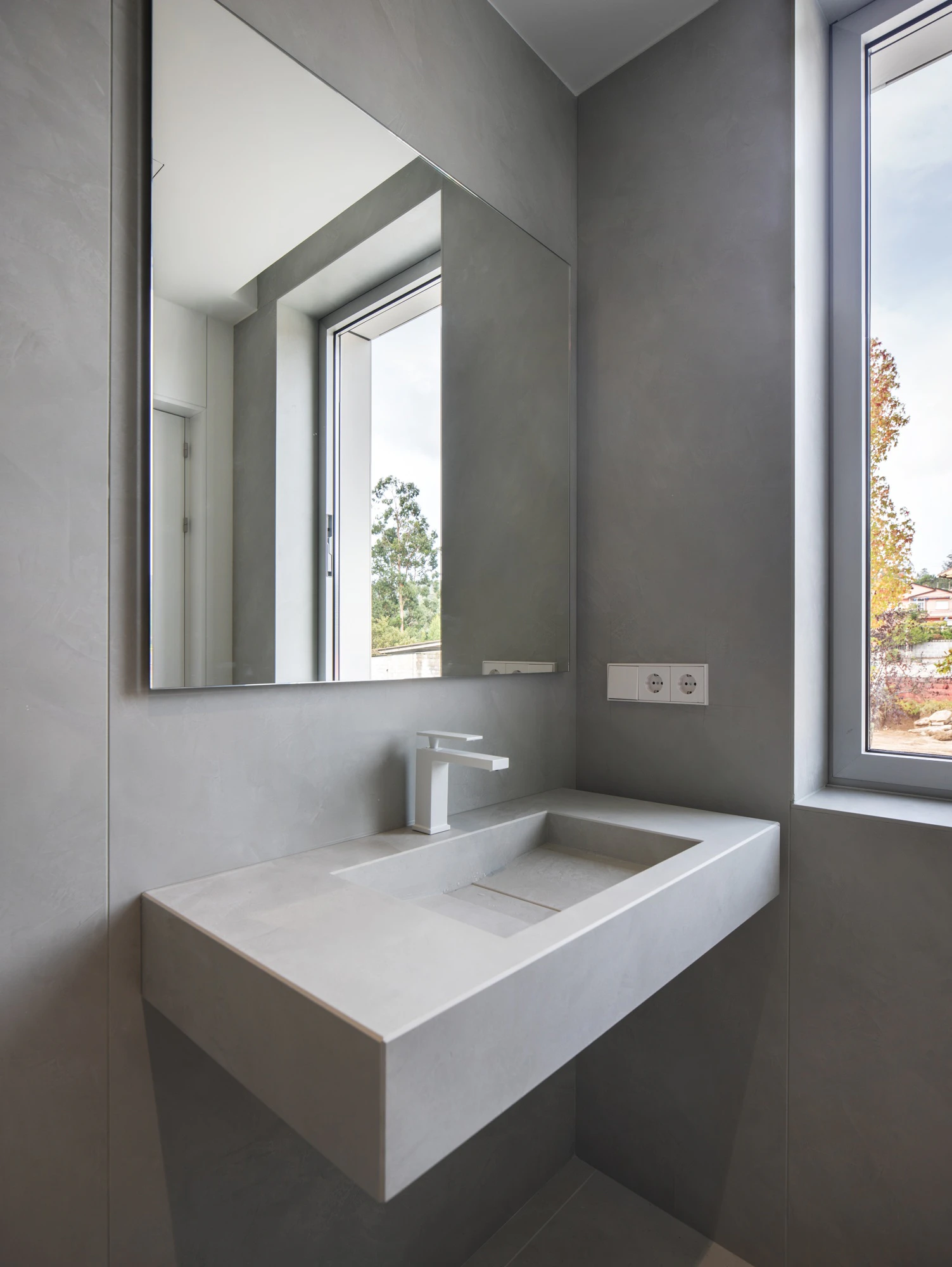 This soft finish colour, with a cream background and a subtle haze of grey tones, pairs perfectly with Dekton Argentium, a neutral grey with a trowelled effect reminiscent of lime stucco. It is also present in the bathroom cladding and even in its washbasin, the Reflection model in the same colour.