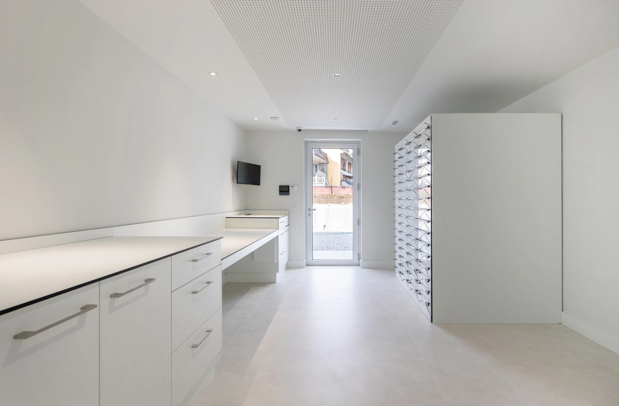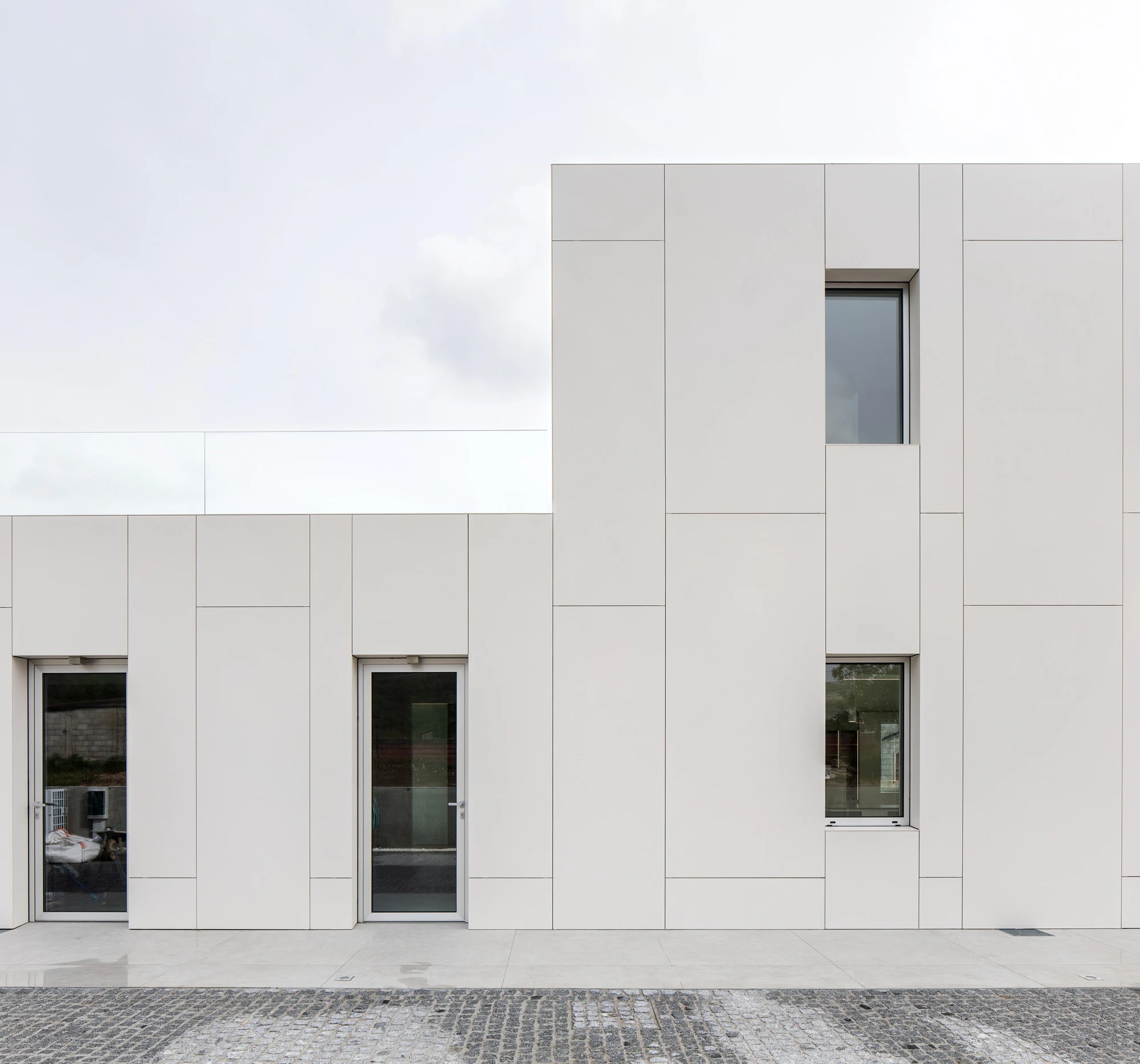 From the outside, the volume forms a continuous whole thanks to the white cladding of Dekton Moone. “The ventilated façade was resolved with a single-layer system with thermal insulation, in compliance with the CTE-HE requirements,” explains Martínez. He adds: “White was the main premise, so a SATE in this tone was considered, as well as a construction solution like the current one with a ventilated façade but with a metallic finish such as Alucobond. Ultimately, these were discarded because they were not as effective as Dekton, in addition to aesthetic considerations such as the large-format layout that was finally executed.”