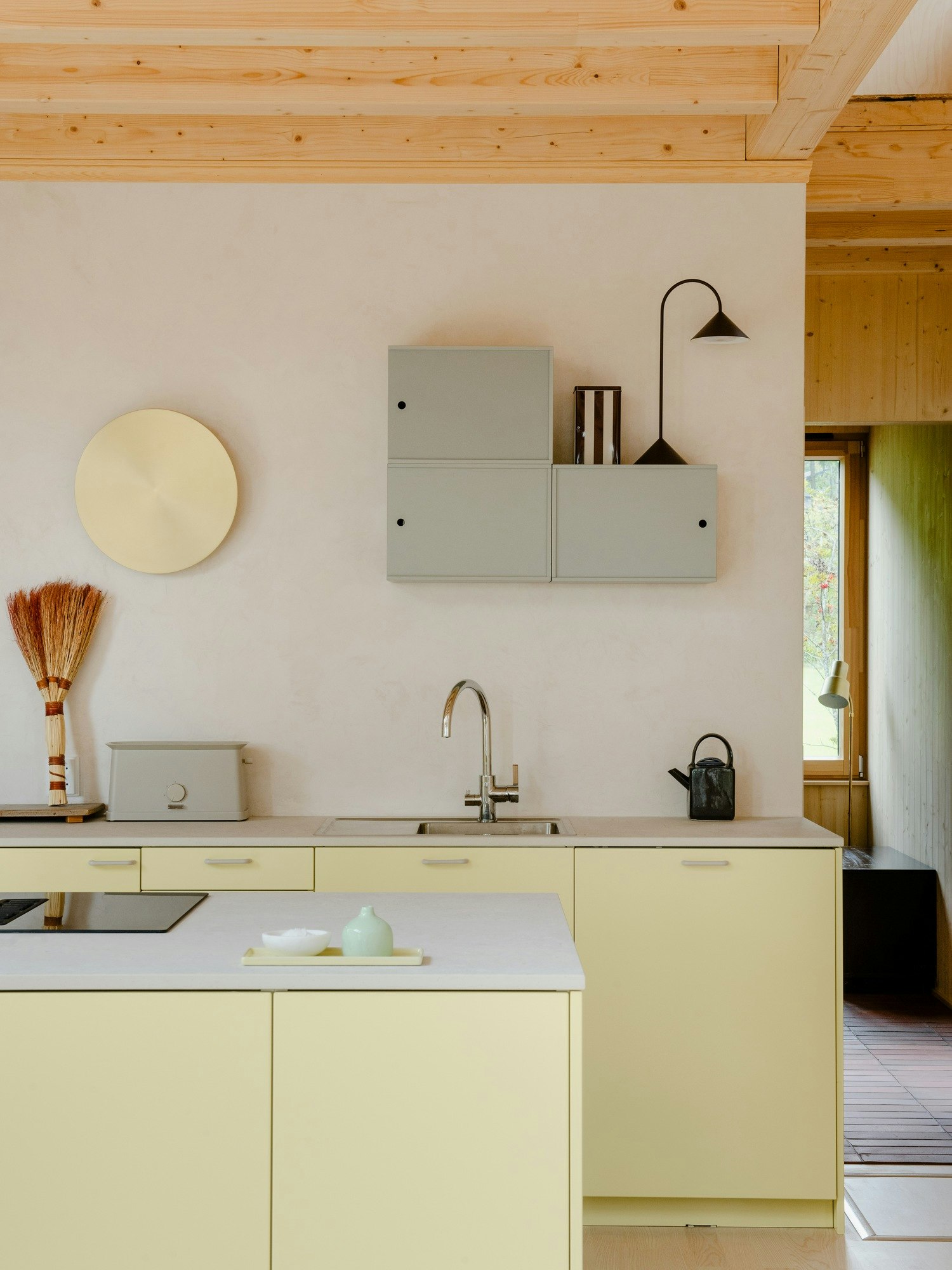 The heart of the home is this kitchen with clean lines, where natural light, soft tones, and materials create a warm and balanced atmosphere. The furniture, in a soft butter yellow tone (“the beautiful Simple Butter yellow by Doorie,” explains Juurinen), establishes a harmonious dialogue with the natural wood walls and Nordic spruce ceiling. The composition, simple and meticulously crafted, reveals the precision of Scandinavian design, but with a more emotional and vibrant touch that characterises Juurinen's visual universe.