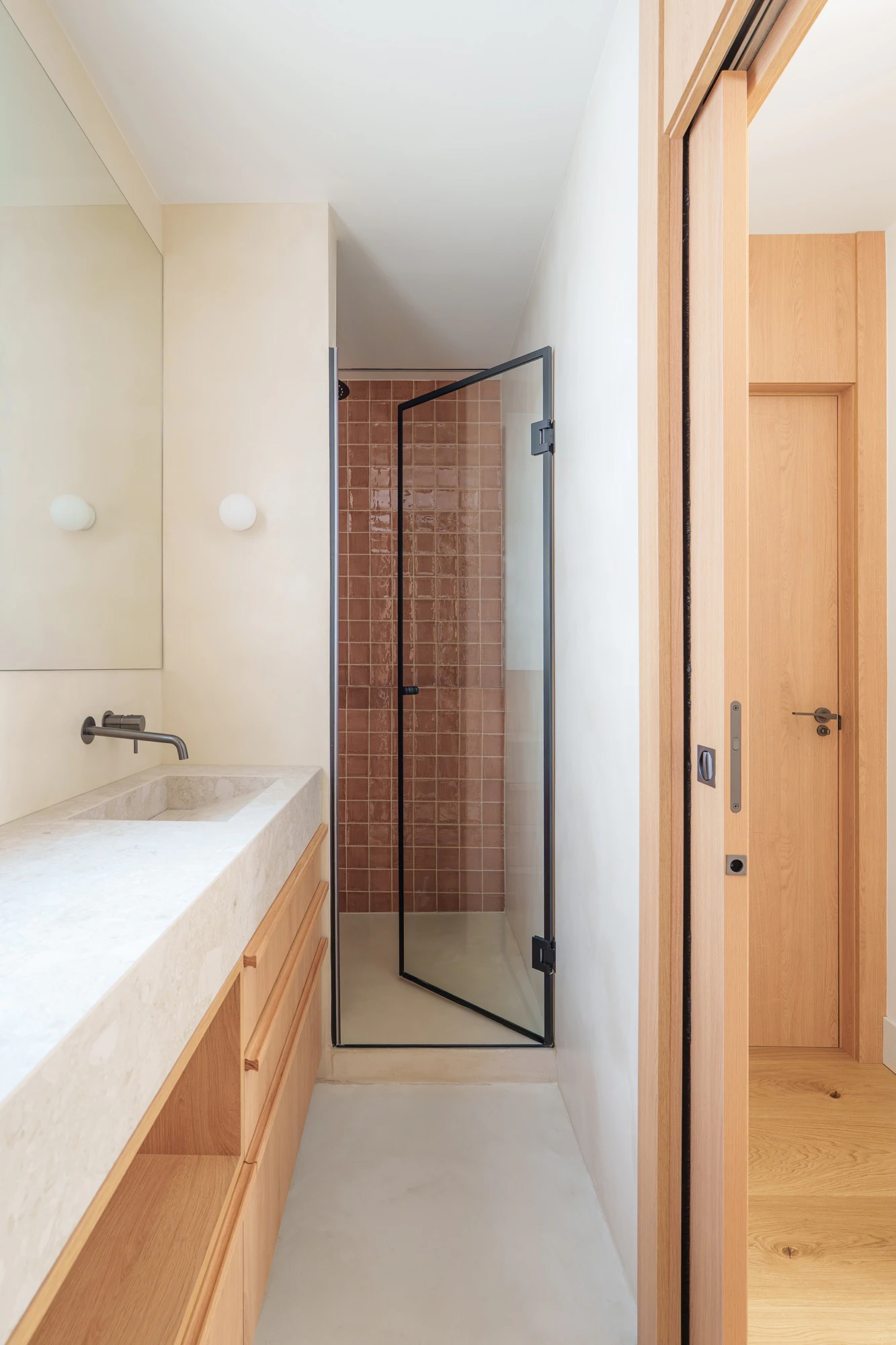 Finally, in the case of the en-suite bathroom, a slightly more striking pattern was chosen, while still matching the microcement palette: 'We created a complete washbasin in Dekton Ava KC with greater texture, adding material richness within a neutral palette,' recall the studio.