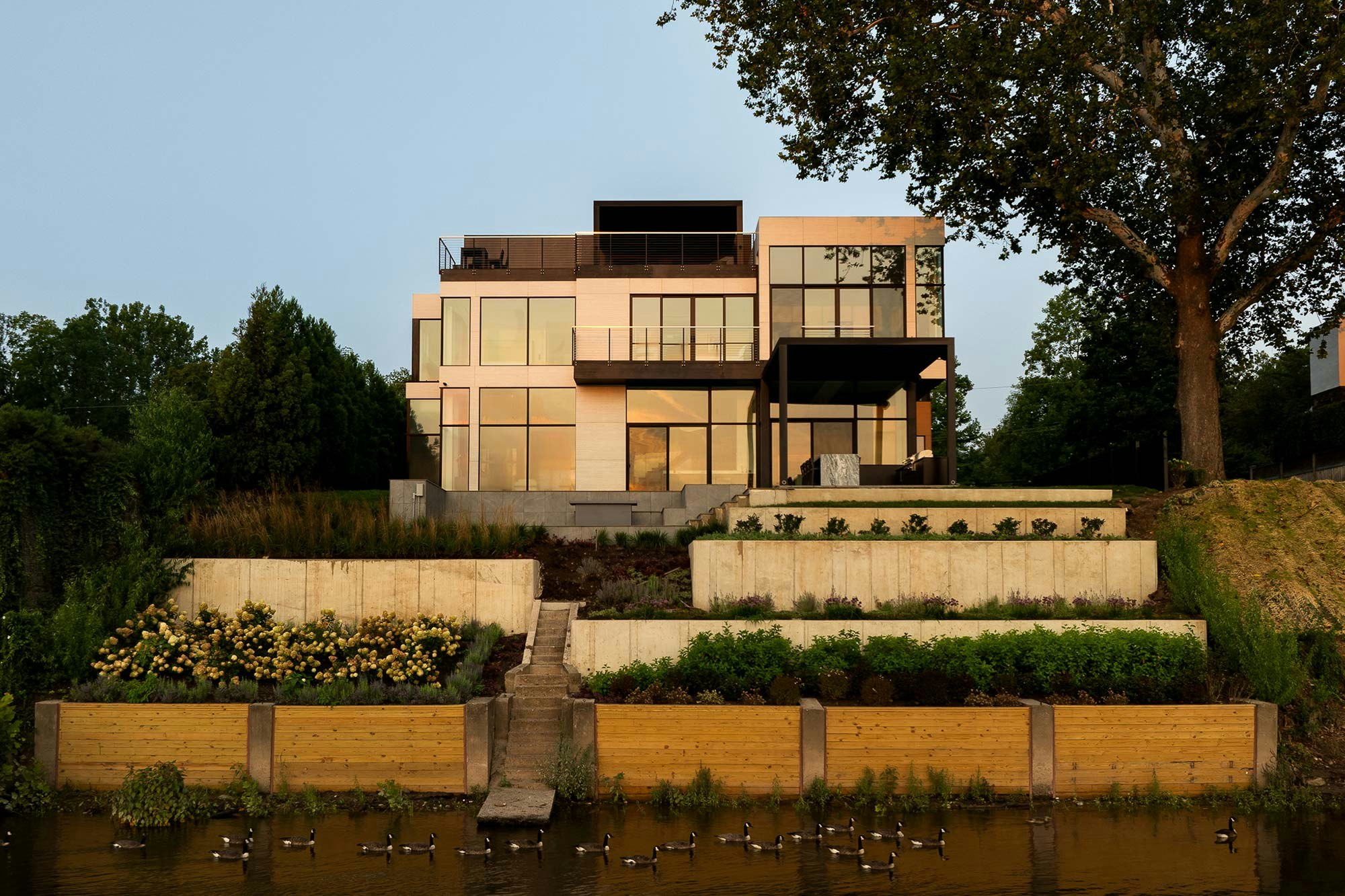 Perhaps the most captivating feature of the project is the interplay of the facade and the expansive glazing facing the river. When viewed from the water, the house offers a seamless integration of texture, light, and structure. The facade acts not just as cladding, but as a design statement in its own right.