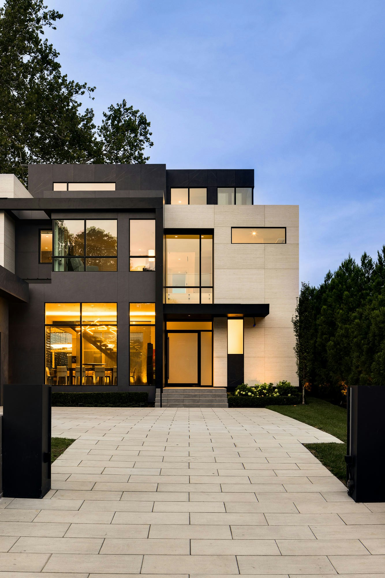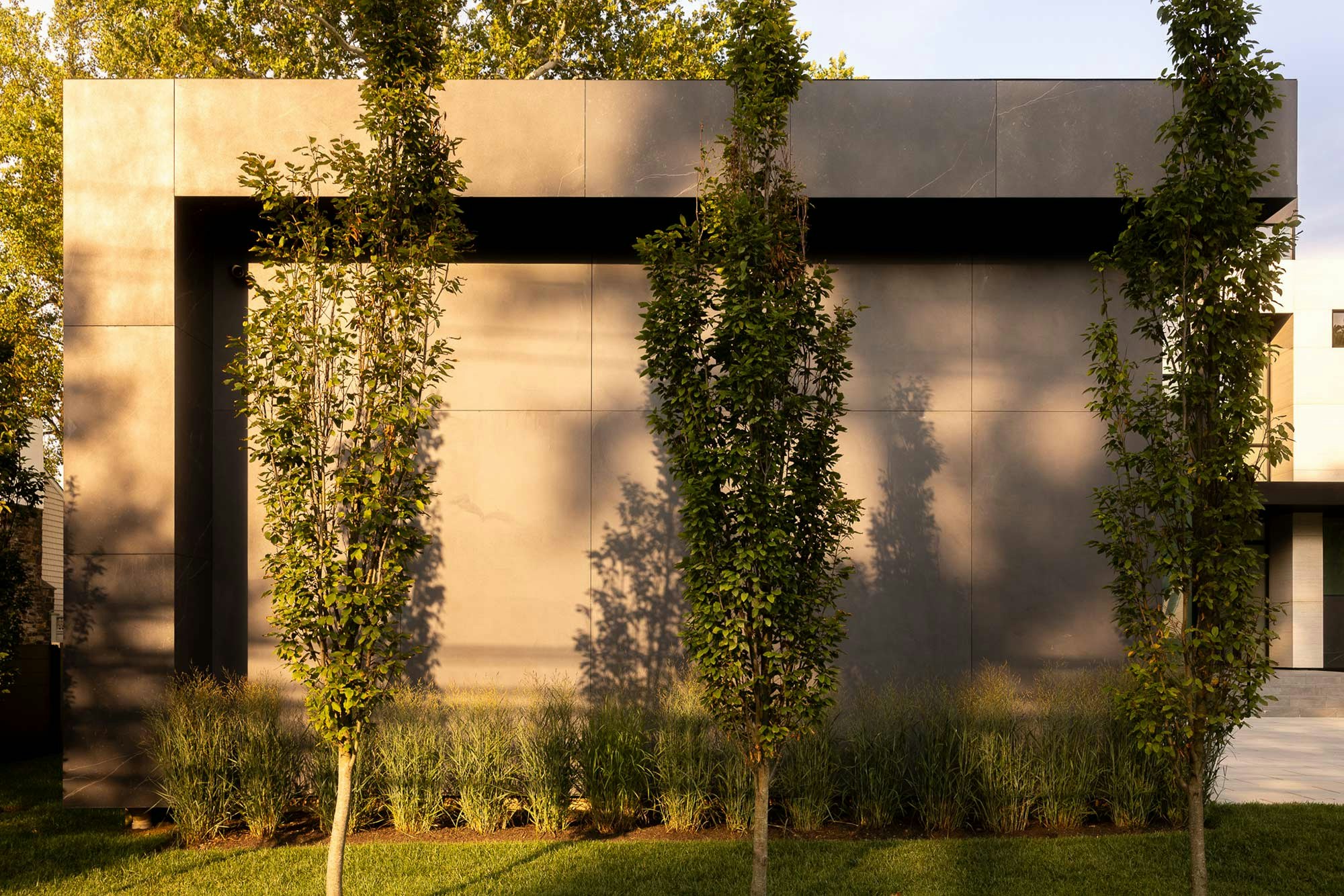 The design called for a layered visual effect, combining multiple Dekton colors - Kelya, Marmorio, and Domoos - to create depth and contrast in the home’s exterior. This blend of dark and cream tones played beautifully against the natural backdrop while complementing the oversized windows and doors that define the home’s front and rear elevations.