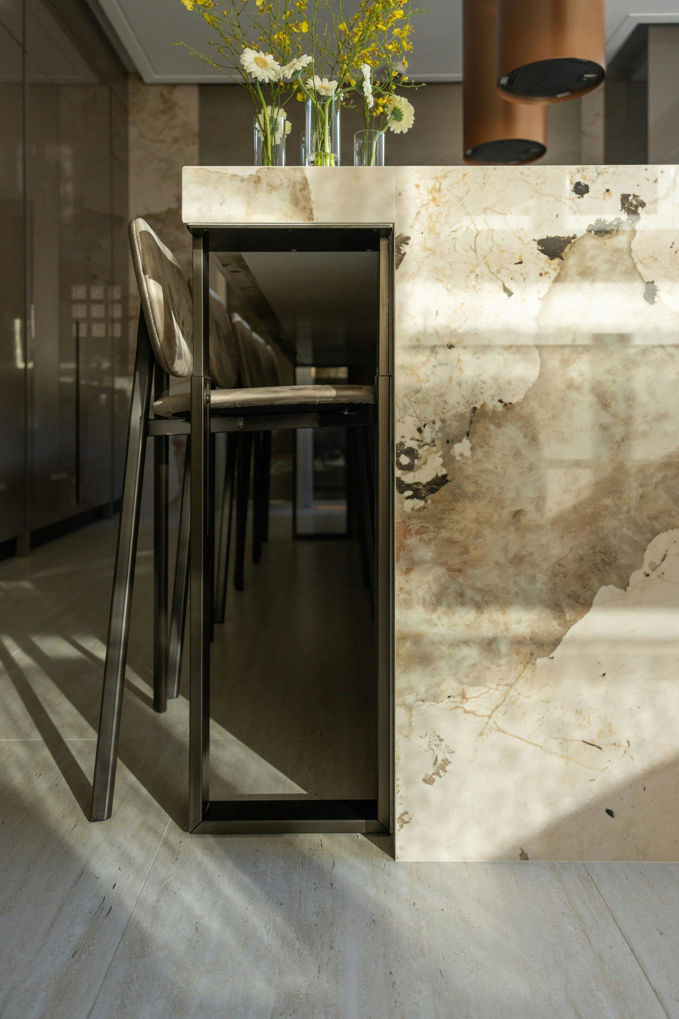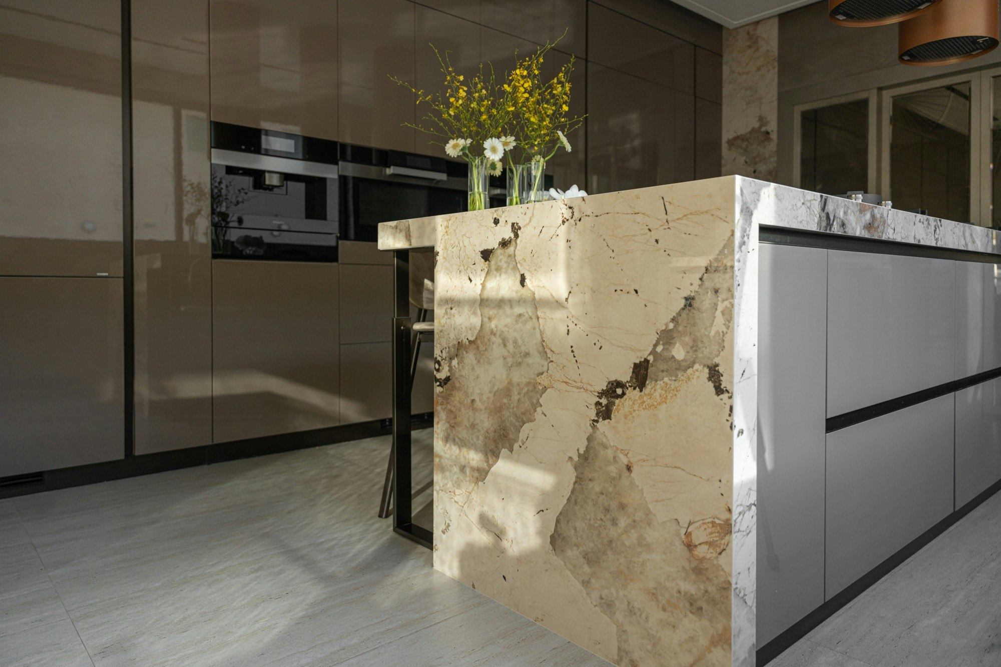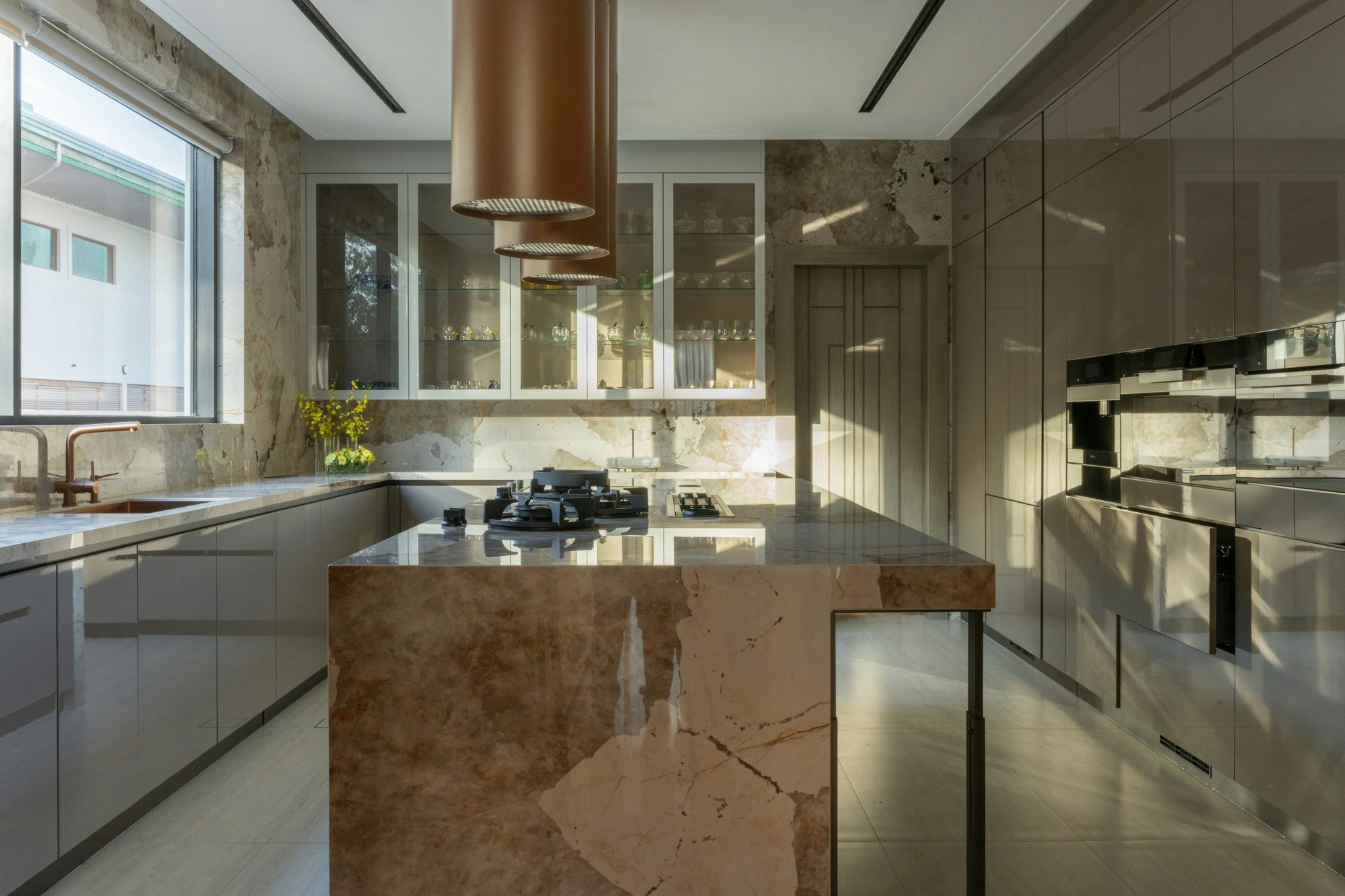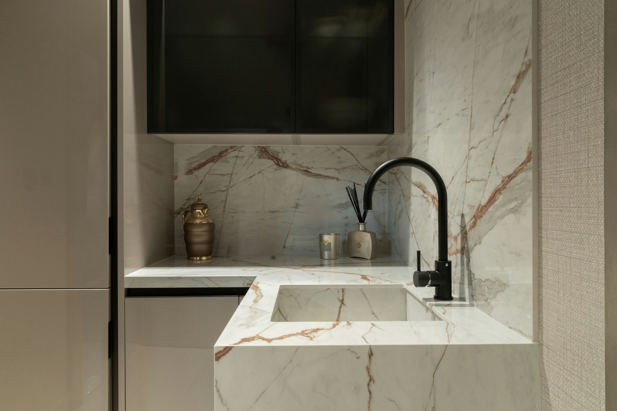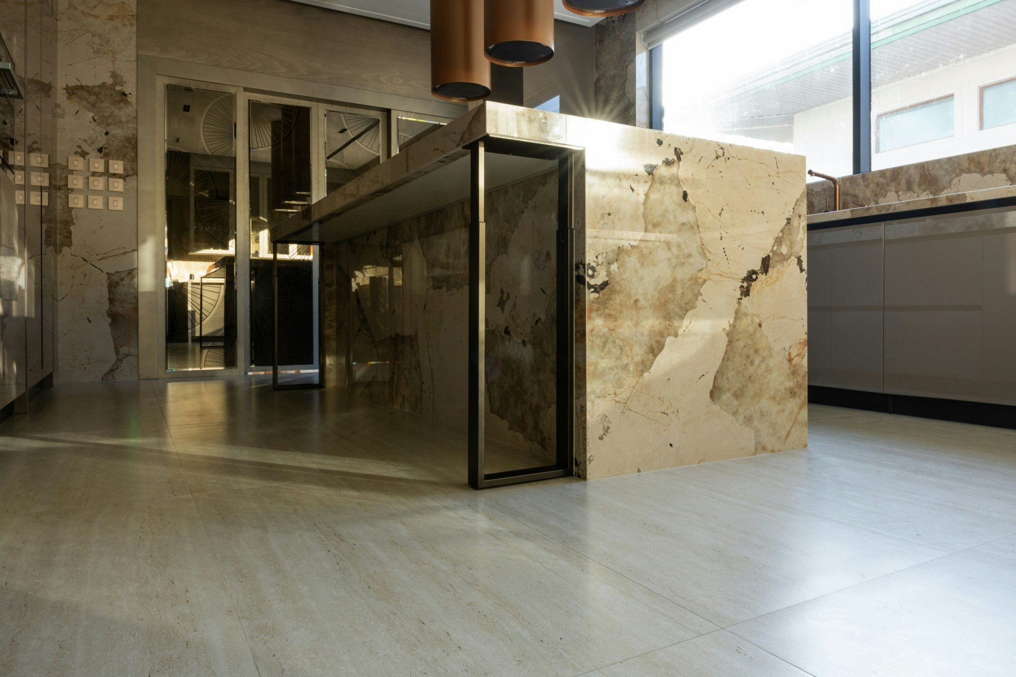 The kitchen is the most striking example. Here, Dekton Khalo, inspired by the natural stone Patagonia, covers the island, the worktop, and the walls to create a sculptural block that combines opulence and precision. The shine of brass and metallic accents further elevate the true heart of the home.