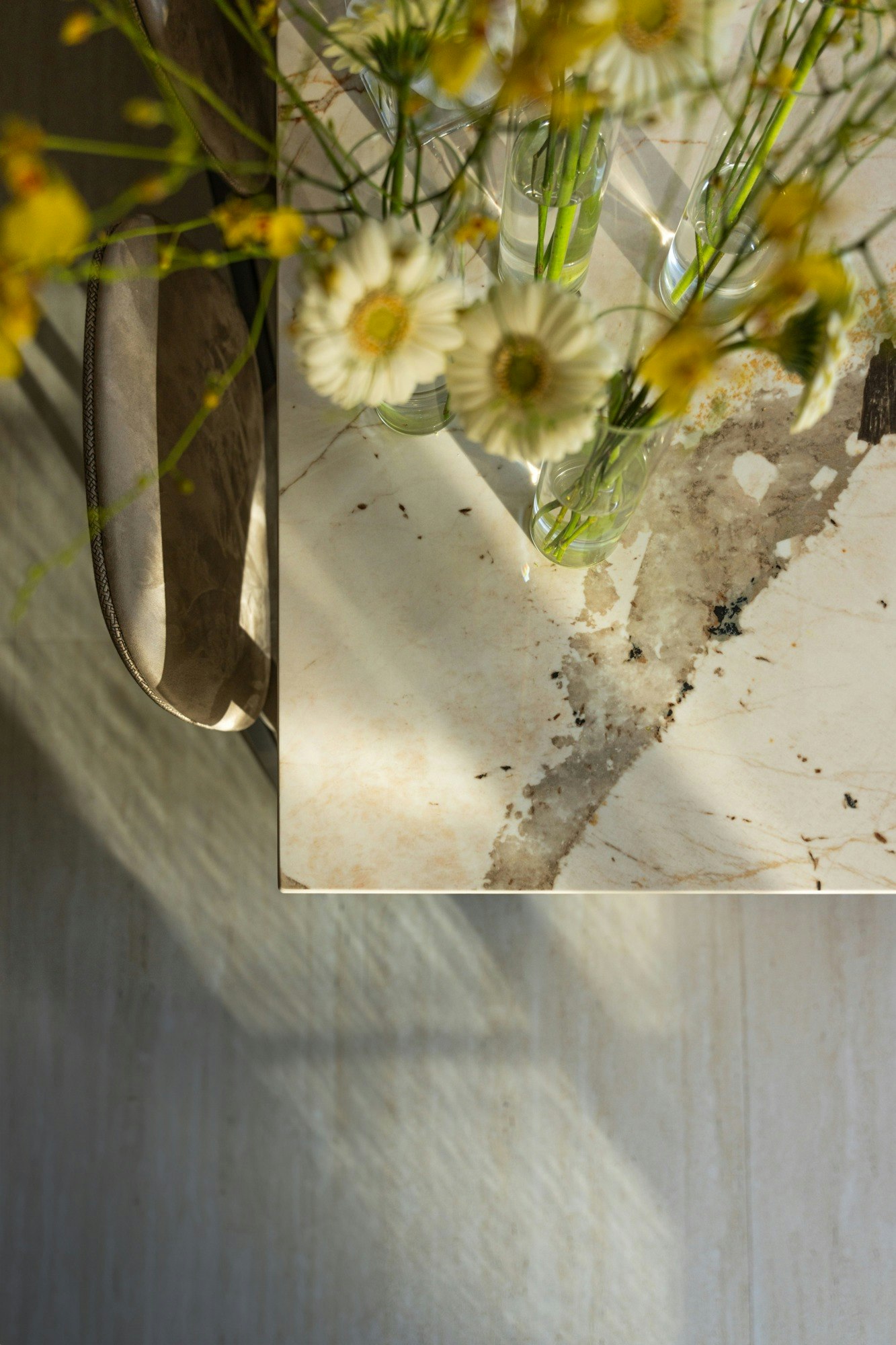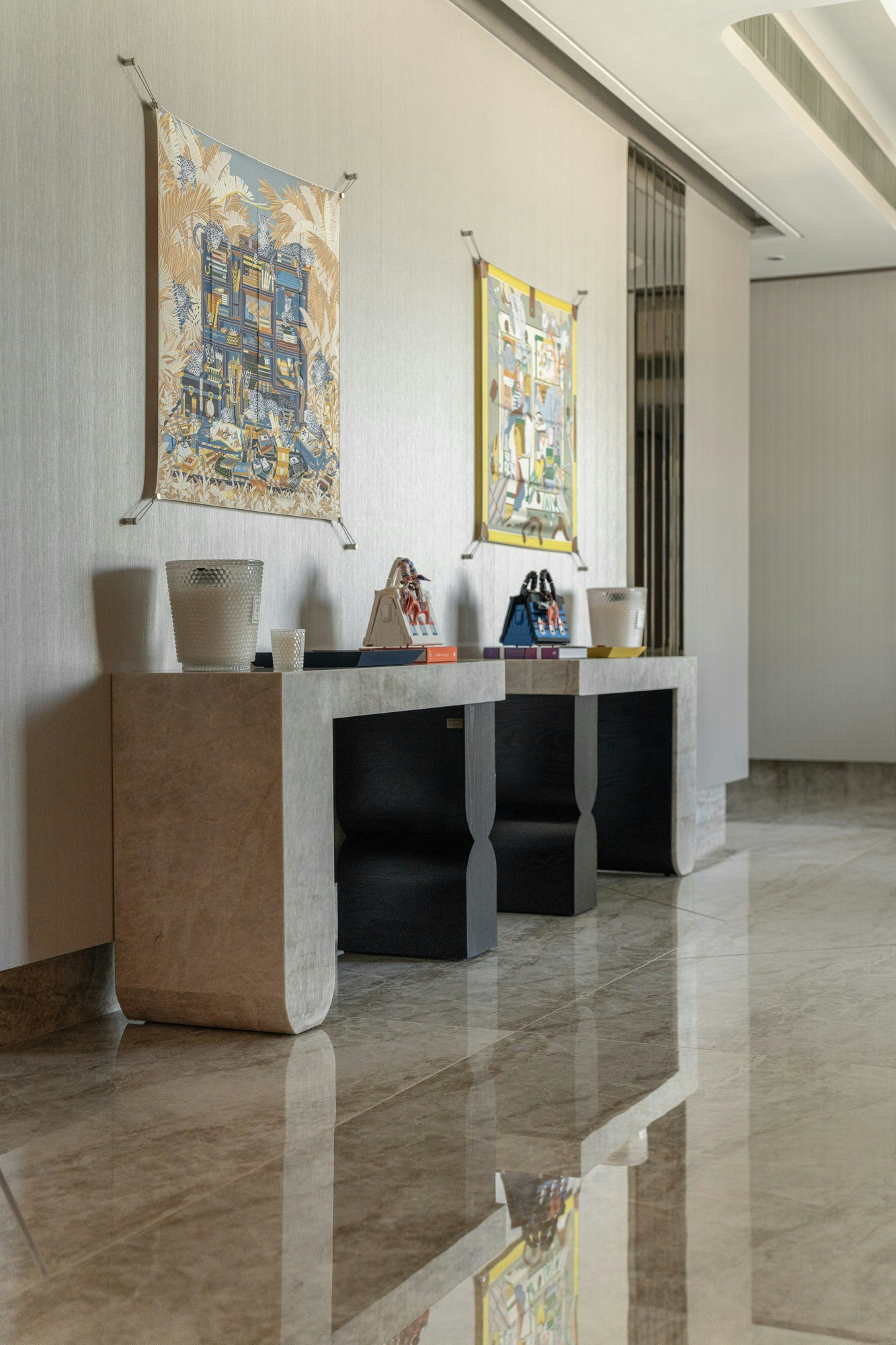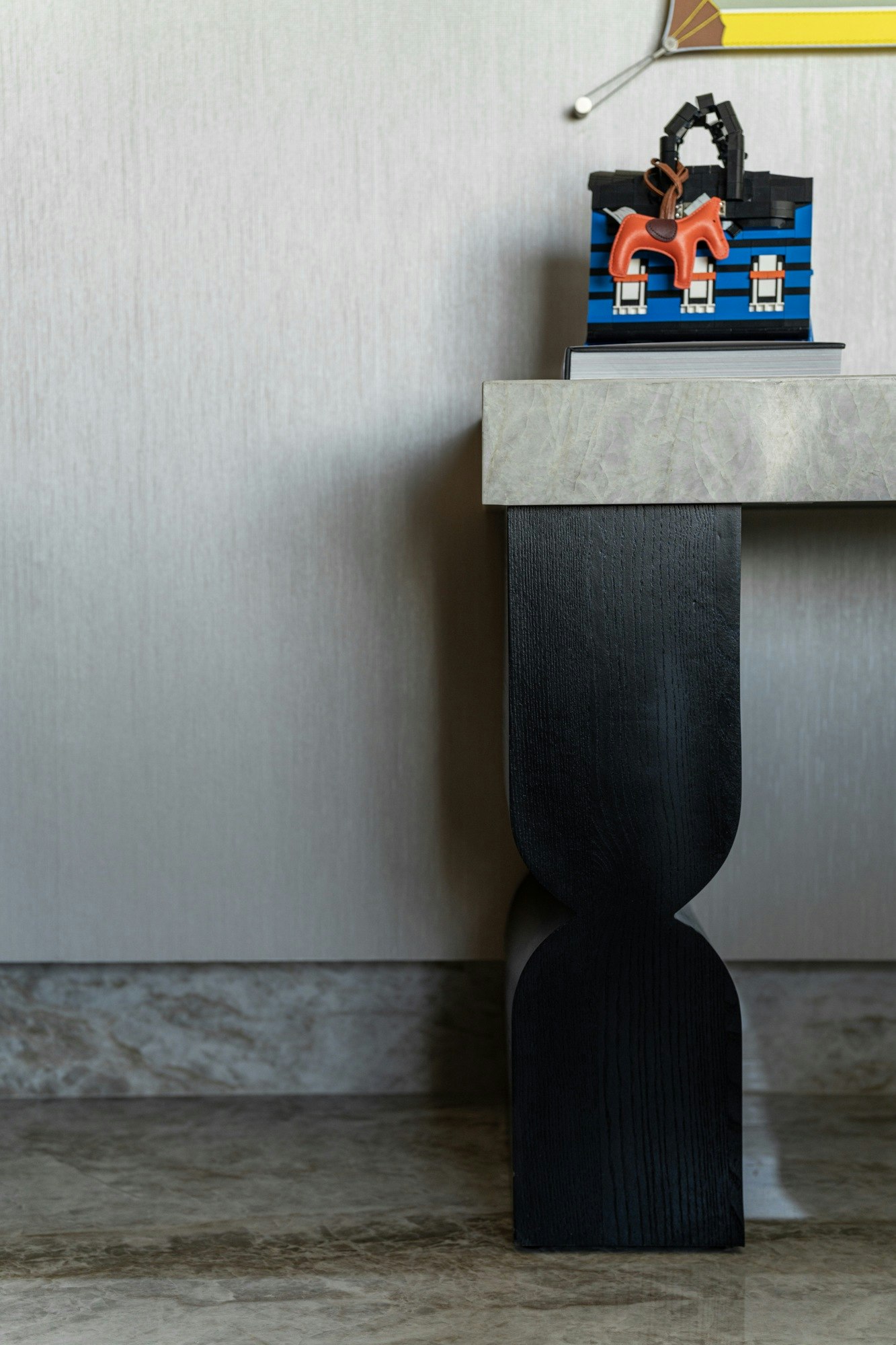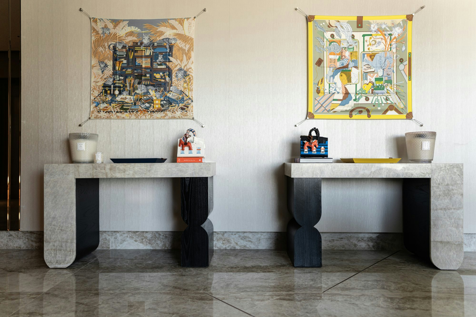 Beyond their structural role, Cosentino surfaces also appear in unique pieces. Two twin consoles, custom-designed in a combination of Sensa Taj Mahal and wood, demonstrate how natural stone can be integrated into furniture with surprising results. This detail perfectly encapsulates the designer's philosophy: to experiment, mix, and find new ways to apply materials that initially seem reserved for kitchens or floors.