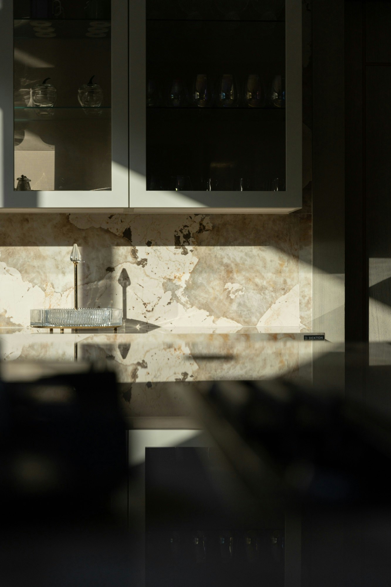 Nearby, the pantry takes on unexpected prominence thanks to the dramatic veining of Dekton Awake, transforming a secondary space into a corner with character. The flooring is completed with Dekton Taga and Dekton Arga, surfaces that reinterpret quartzite with a timeless and elegant finish.