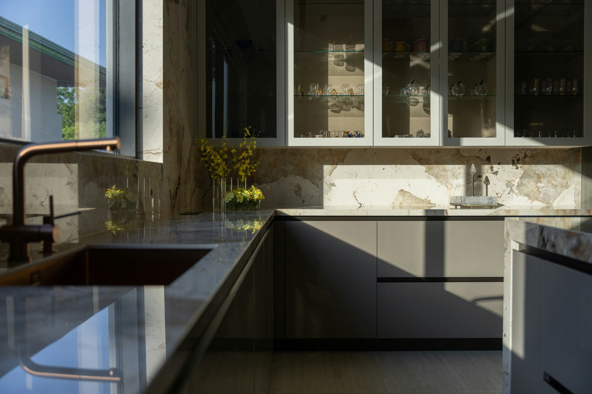 One of Al Kassim's obsessions was to test how these surfaces performed in high-wear areas, and the experiment worked. The so-called 'dirty kitchen' is equipped with Silestone Stellar Blanco13, designed to resist stains and continuous use without losing any of its aesthetic appeal.
