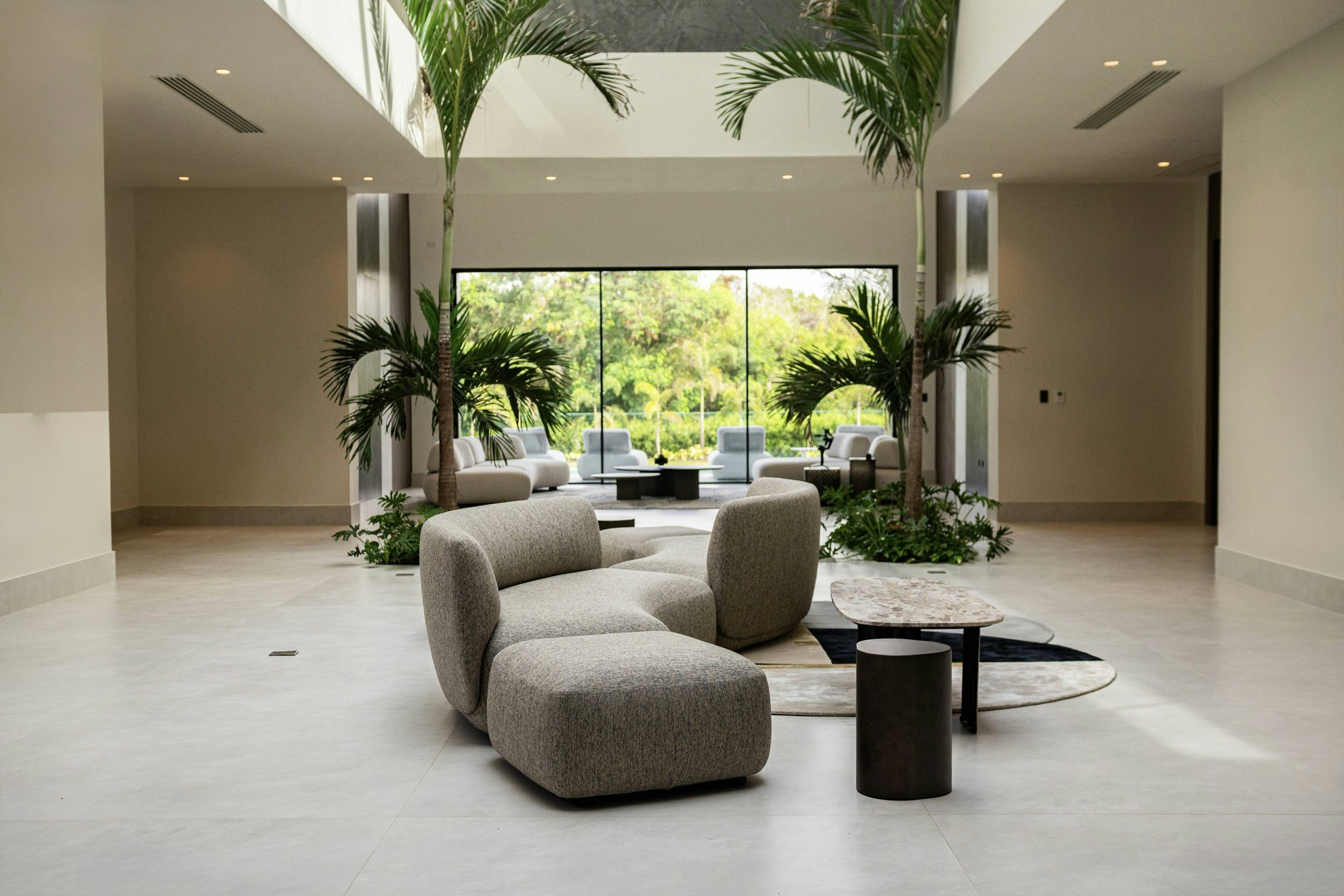 The flooring is the main thread of this continuity. Over 1,200 m2 of Dekton Albarium cover both the general flooring and the surfaces surrounding the pool, creating a homogeneous gesture that accompanies the transition between spaces. Its warm, mineral tone brings serenity while offering optimal performance for outdoor use thanks to its resistance and anti-slip properties.