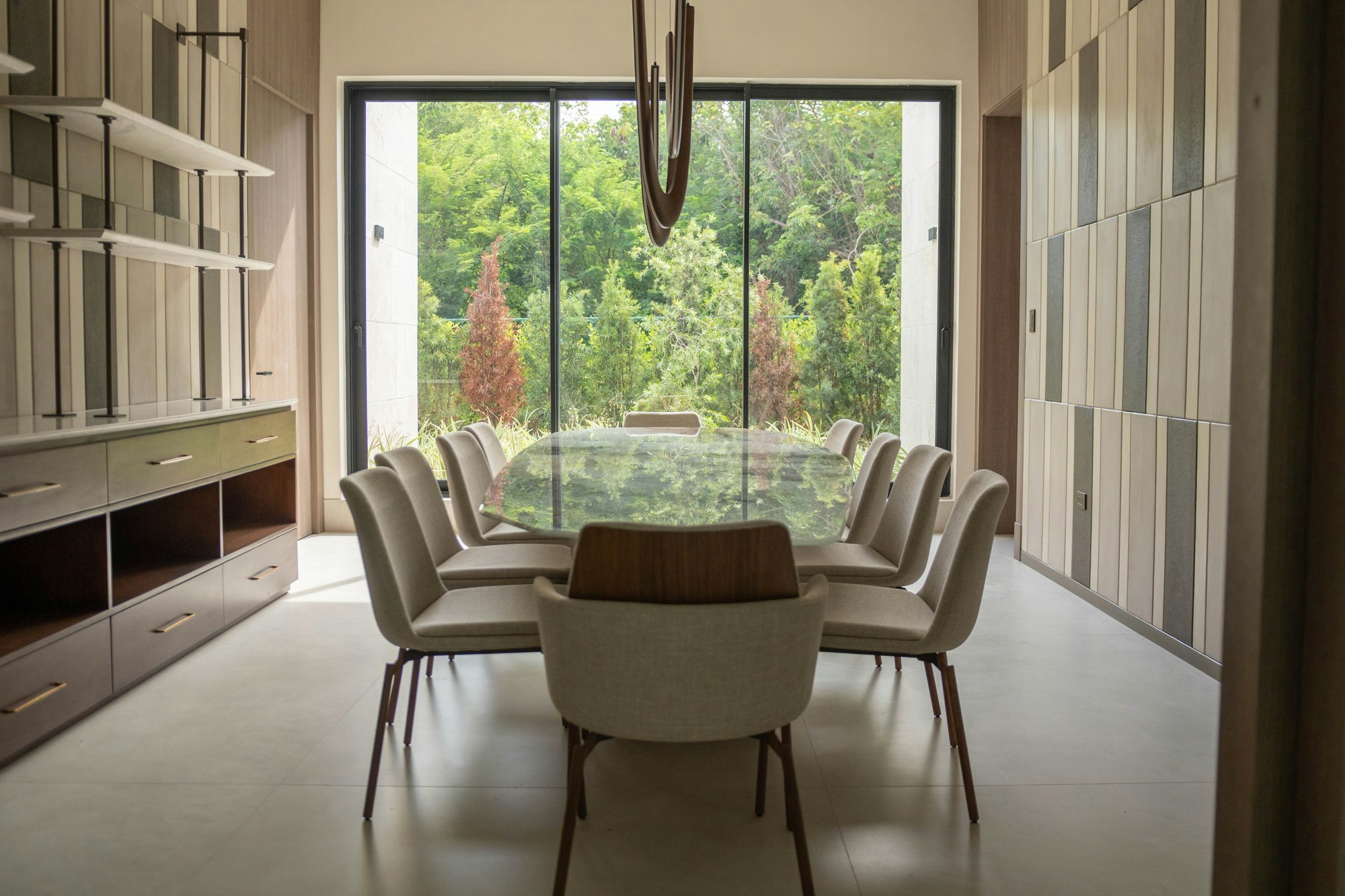 The chromatic choice was driven by the client, who sought “a touch of elegance and similarity to natural elements, as well as enhancing spaces with a natural stone appearance.” This decision explains the predominance of earthy tones, greys, and beiges that define the house. Their assessment of the material's performance was also decisive, highlighting “low maintenance, stain resistance properties, and surface durability,” essential qualities for a home with intensive use in a tropical climate.