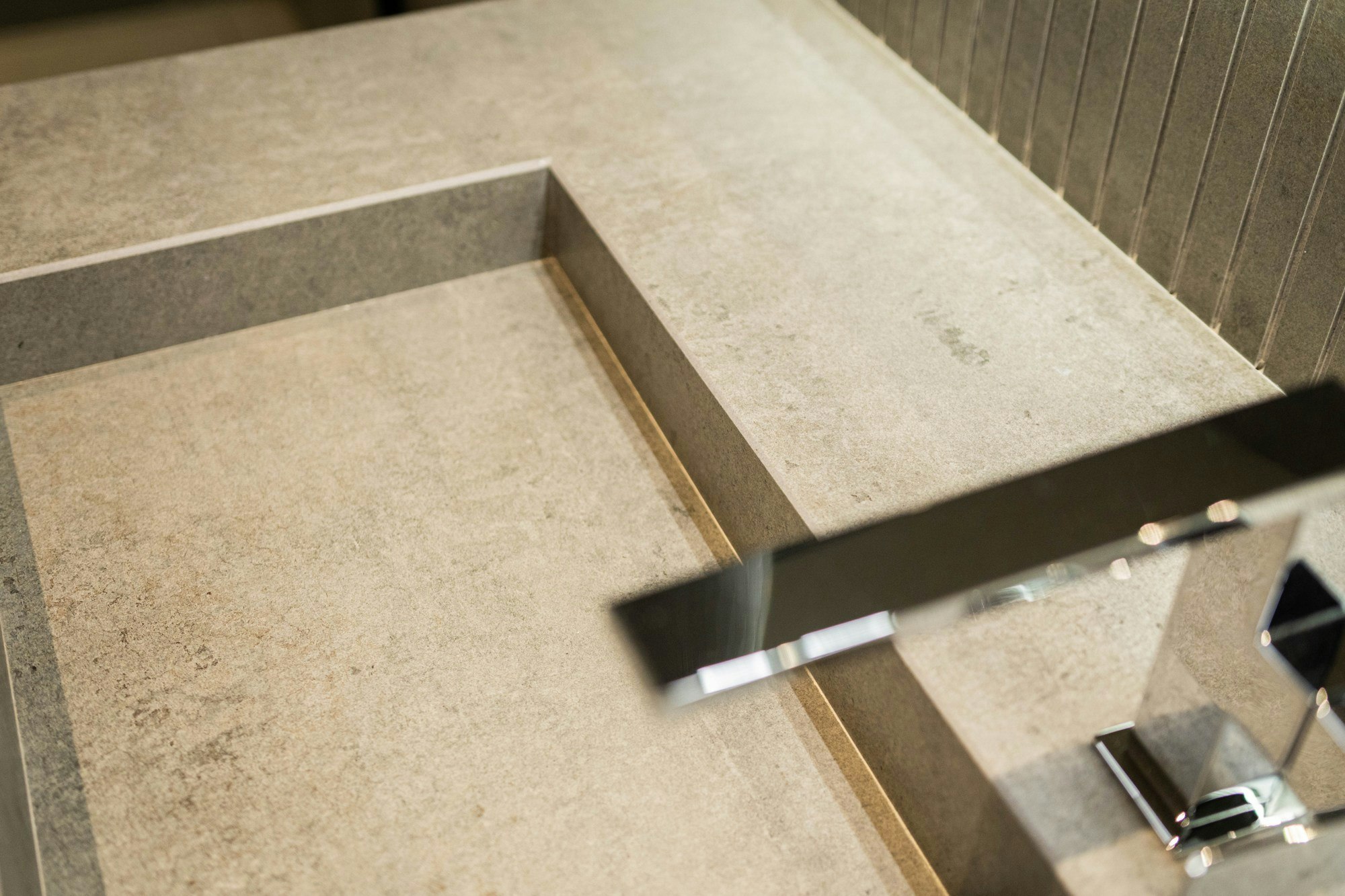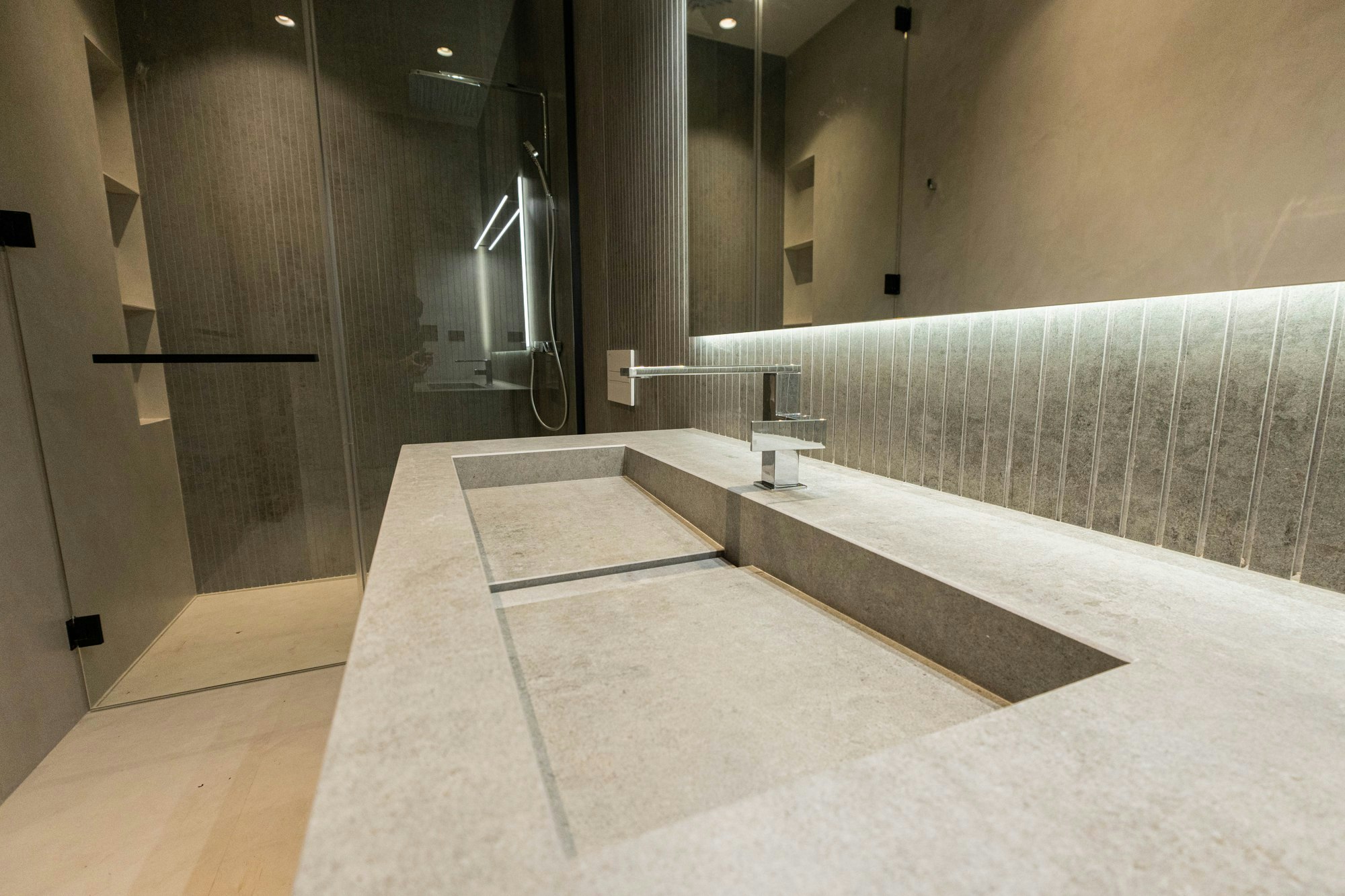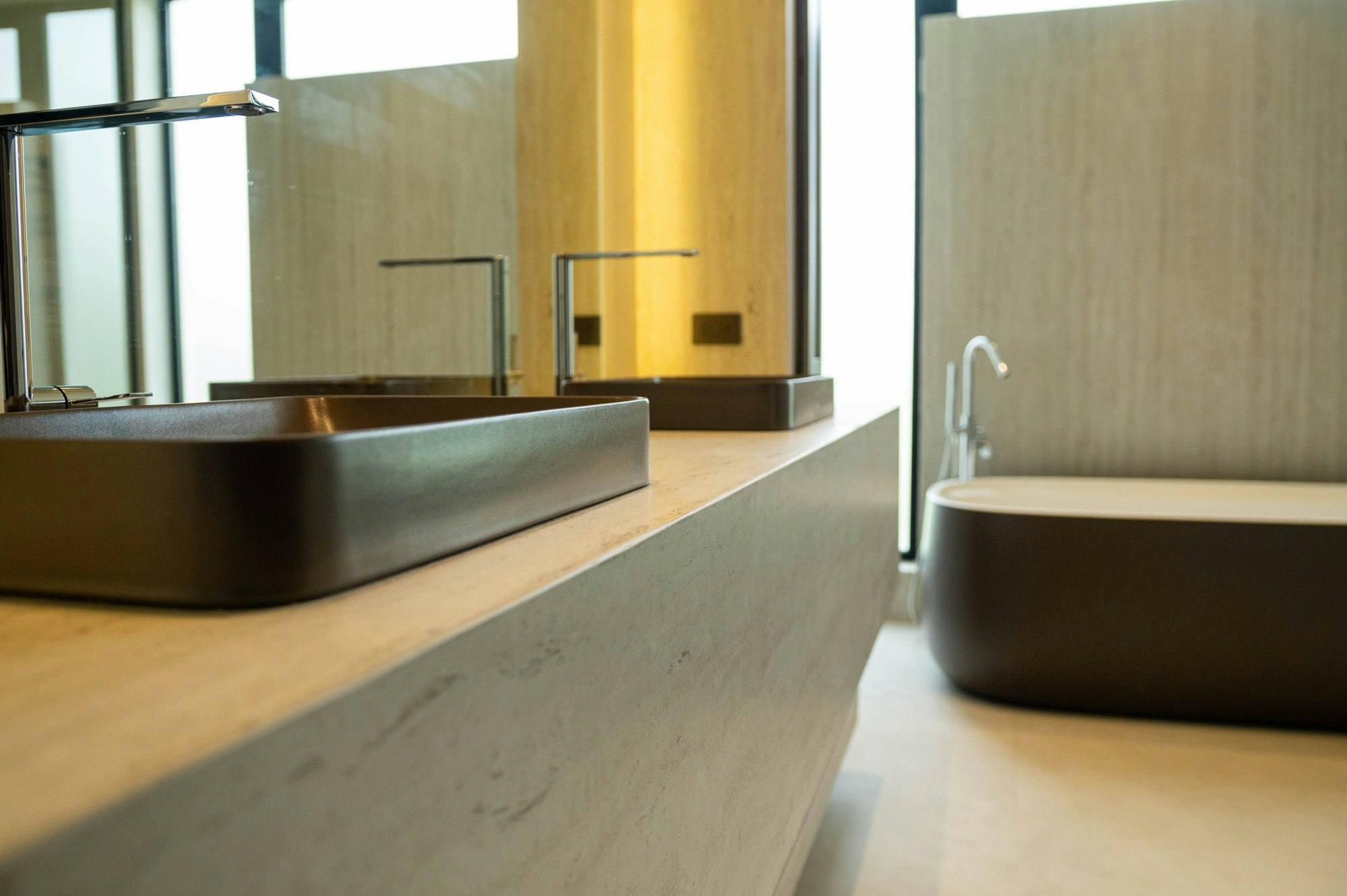 Inside, the presence of the material is intensified through the bathrooms, which combine the colours Dekton Albarium and Dekton Kreta. The spaces flow around monolithic surfaces that envelop worktops, walls, and architectural details, creating a warm, tactile, and refined atmosphere. The composition of vertical lines and grazing lighting enhances this sense of calm.