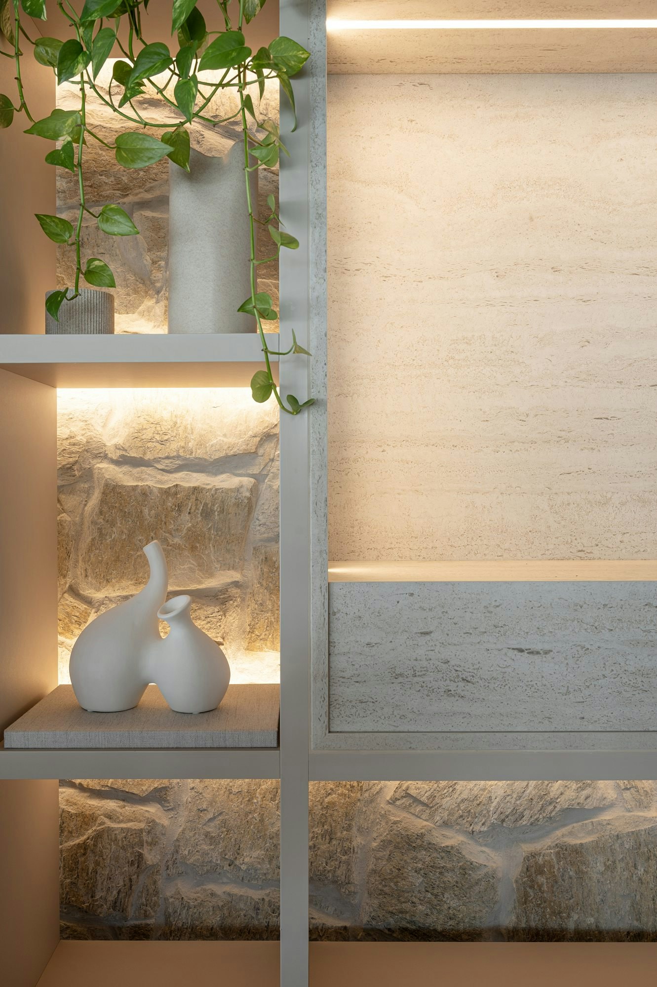 Dekton Marmorio was used on the kitchen countertop and island, on the service tables and in part of the shelving, standing out for its elegance and high performance. Ideal for high-traffic environments, it combines resistance, practicality, and versatility, perfectly integrating into the Praia Brava lifestyle.
