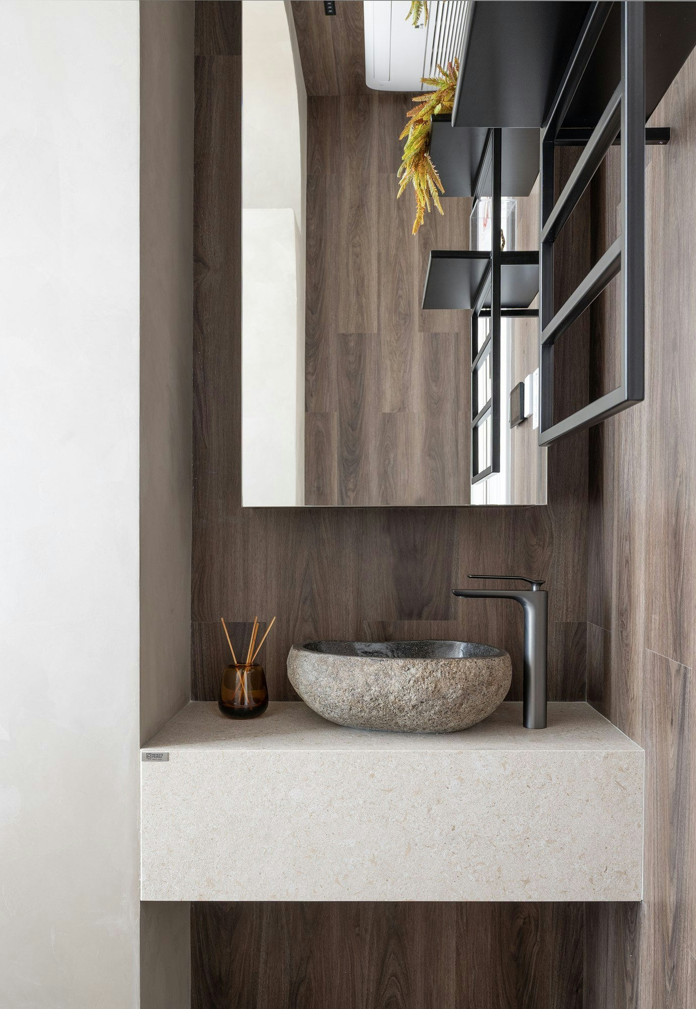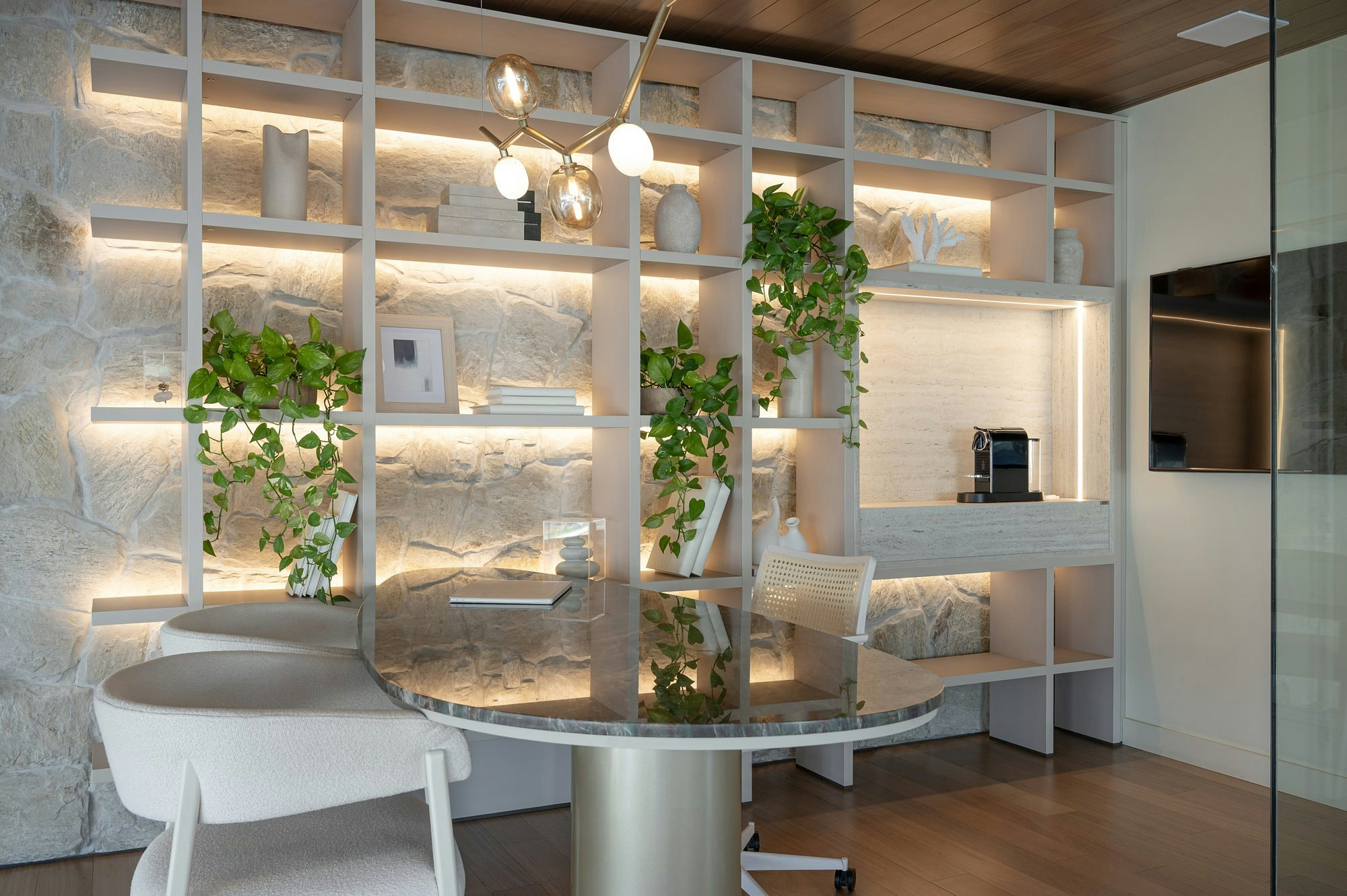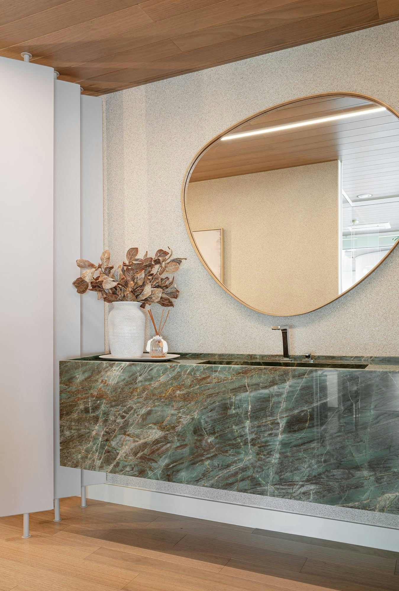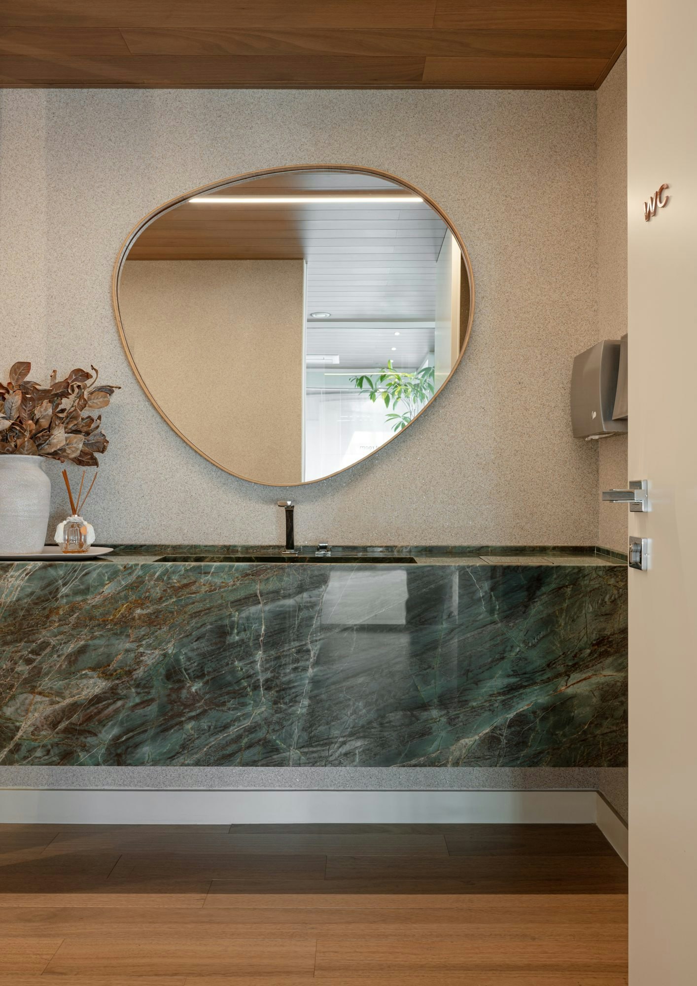 The Scalea Cuarcita Verde Esmeralda was selected for the bathroom countertops and the meeting table top, bringing the strength and beauty of natural stone. Its texture and color give personality to the spaces, creating a welcoming and elegant atmosphere.