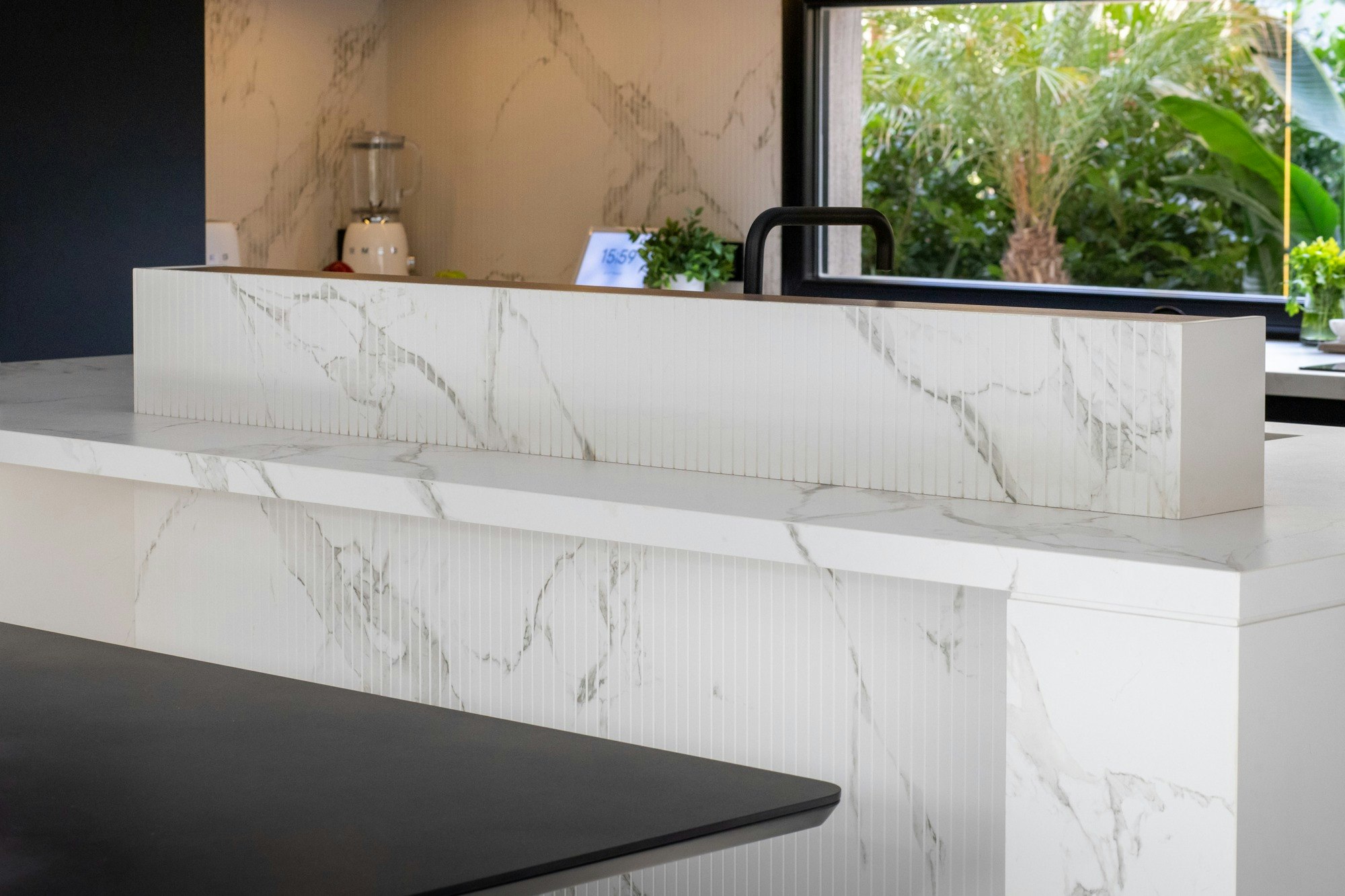 On the splashback, the same Dekton Aura is applied as cladding, extending from the worktop. The grooved design of the material, with Dekton Ukiyo Aura, introduces texture and adds rhythm to the ensemble, emphasising the purity of lines that characterises the project. It is also found on the wall cladding that houses a television. The result is a kitchen that is both functional and architectural.