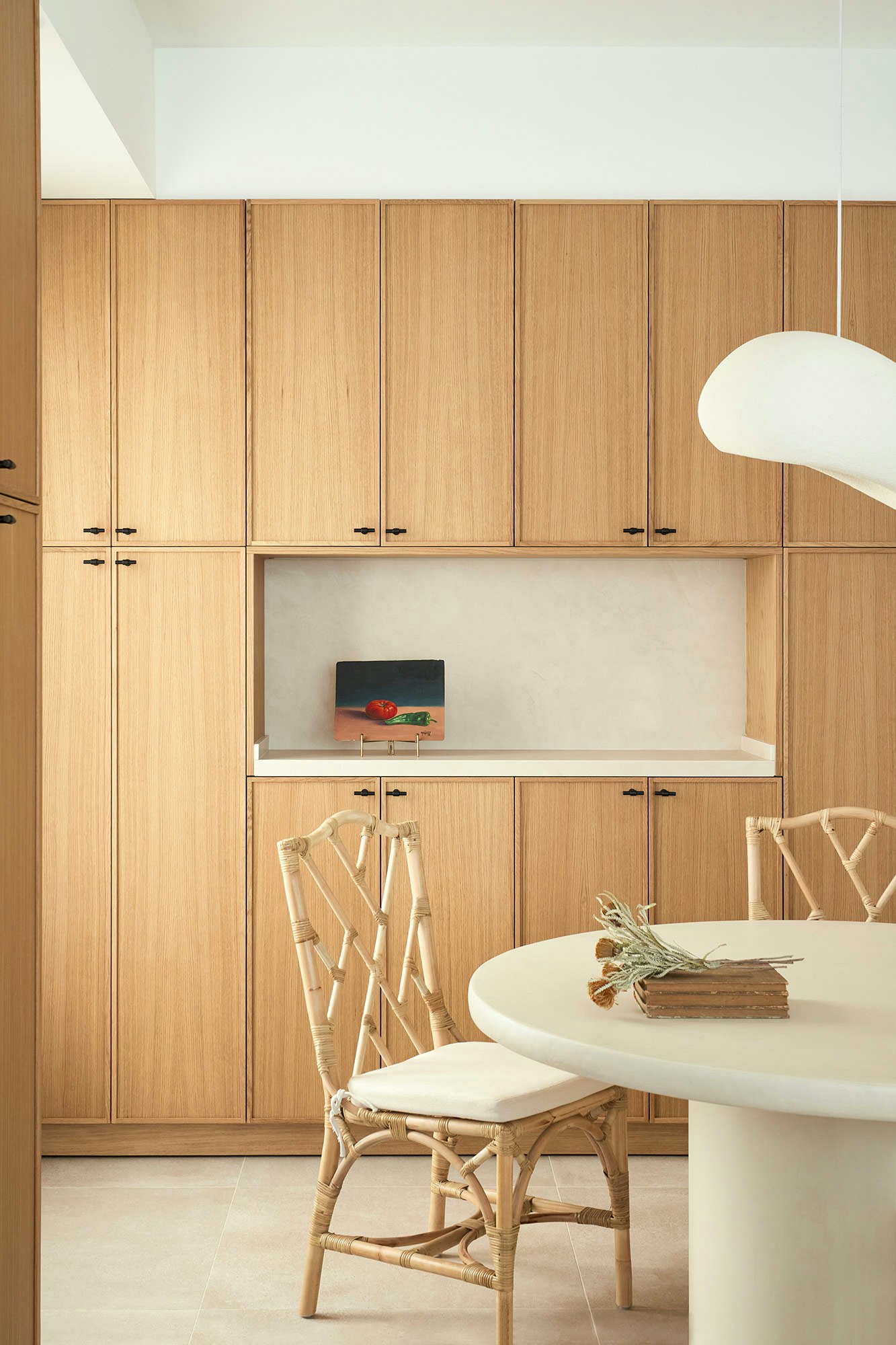 Oak wood is the star of this project, where it has been used particularly in the kitchen and bathroom. The rest of the materials used, such as microcement and paint, are all part of the same colour range, giving a natural feel to the different spaces. The living room and kitchen are connected by a central partition wall with shelves and alcoves on both sides, providing plenty of storage space for both rooms. Large windows connect the interior to the garden and swimming pool, blurring the boundaries between inside and out. A floor-to-ceiling solid door separates the private bedroom and bathroom area from the rest of the house.