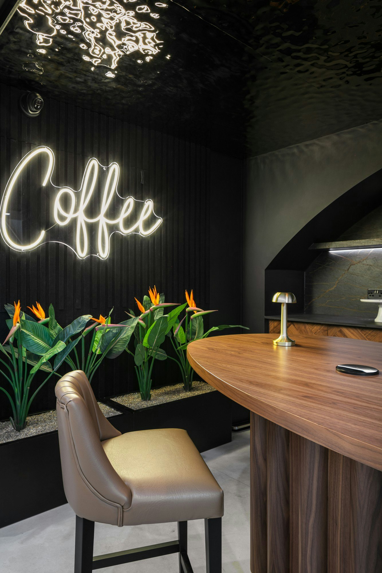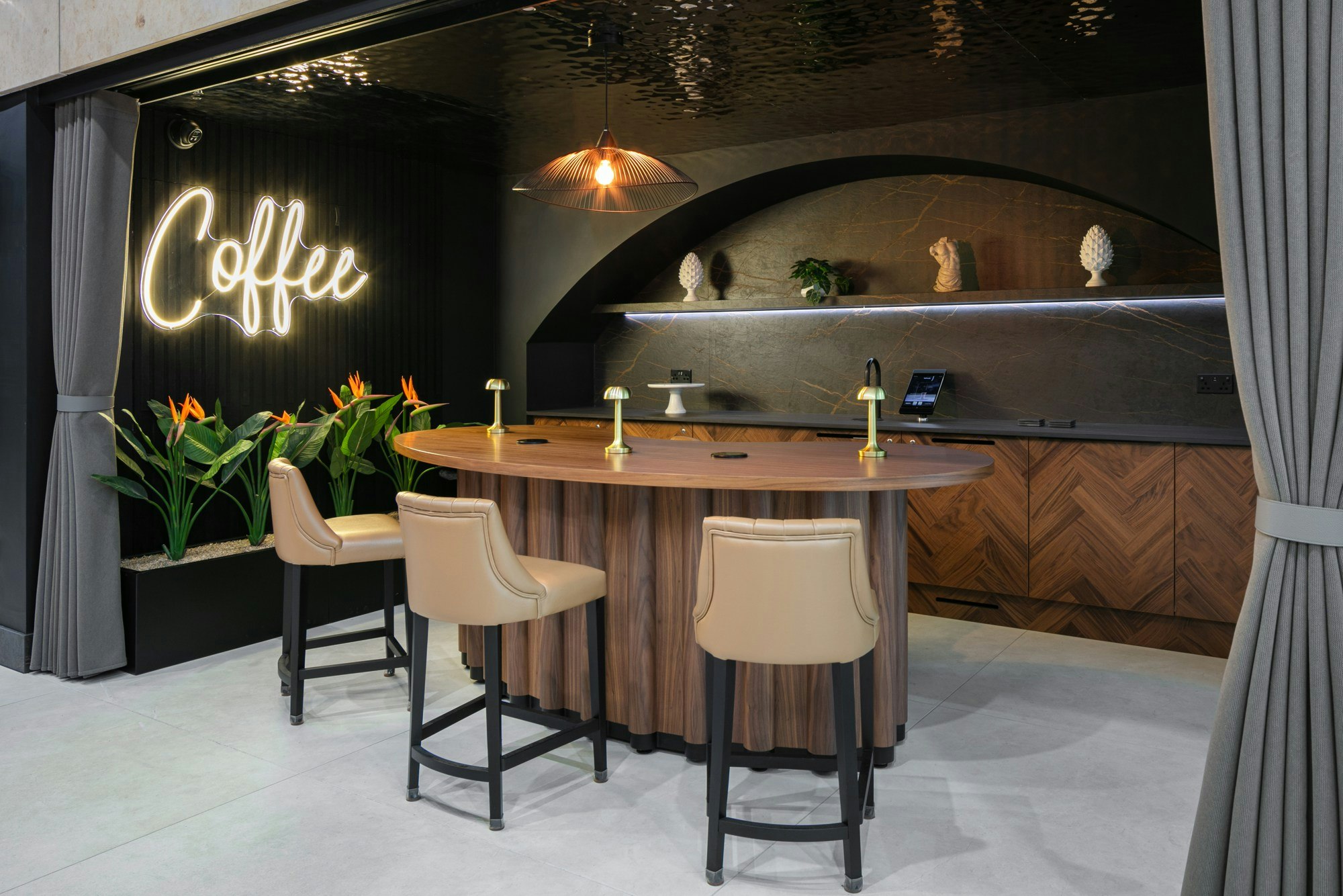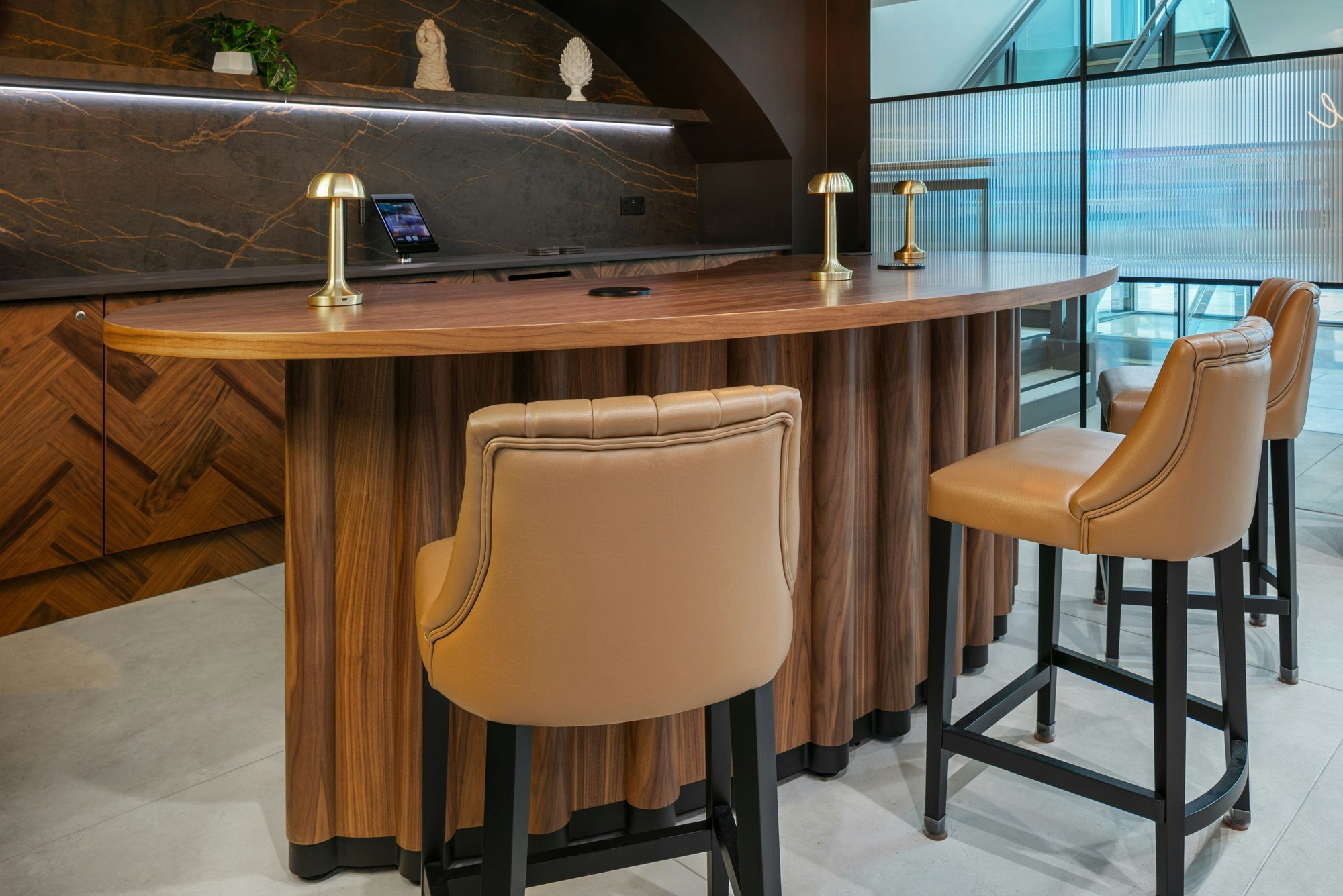 If the floor is the foundation, the reception is the calling card. Here, Dekton Laurent was chosen, a surface inspired by natural marble with golden veining on a deep brown background. The result is a reception desk that stands out and adds a sophisticated touch to the overall design. Moreover, the choice wasn't limited to the desk: custom furniture was also clad in the same material, reinforcing the project's visual identity.