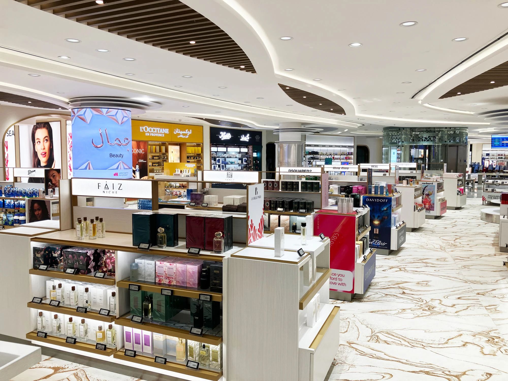 The shopping experience is organised into distinct thematic zones, carefully choreographed. The Perfumery and Cosmetics area evokes the desert through oasis-inspired forms, palm motifs, and warm champagne gold tones. Tobacco, Sweets, and Kids create a marine atmosphere with fluid lines and reflective surfaces reminiscent of the Red Sea. Meanwhile, the Fashion area elevates the narrative towards the sky, using celestial geometries and sophisticated materials that express lightness, movement, and spirituality.