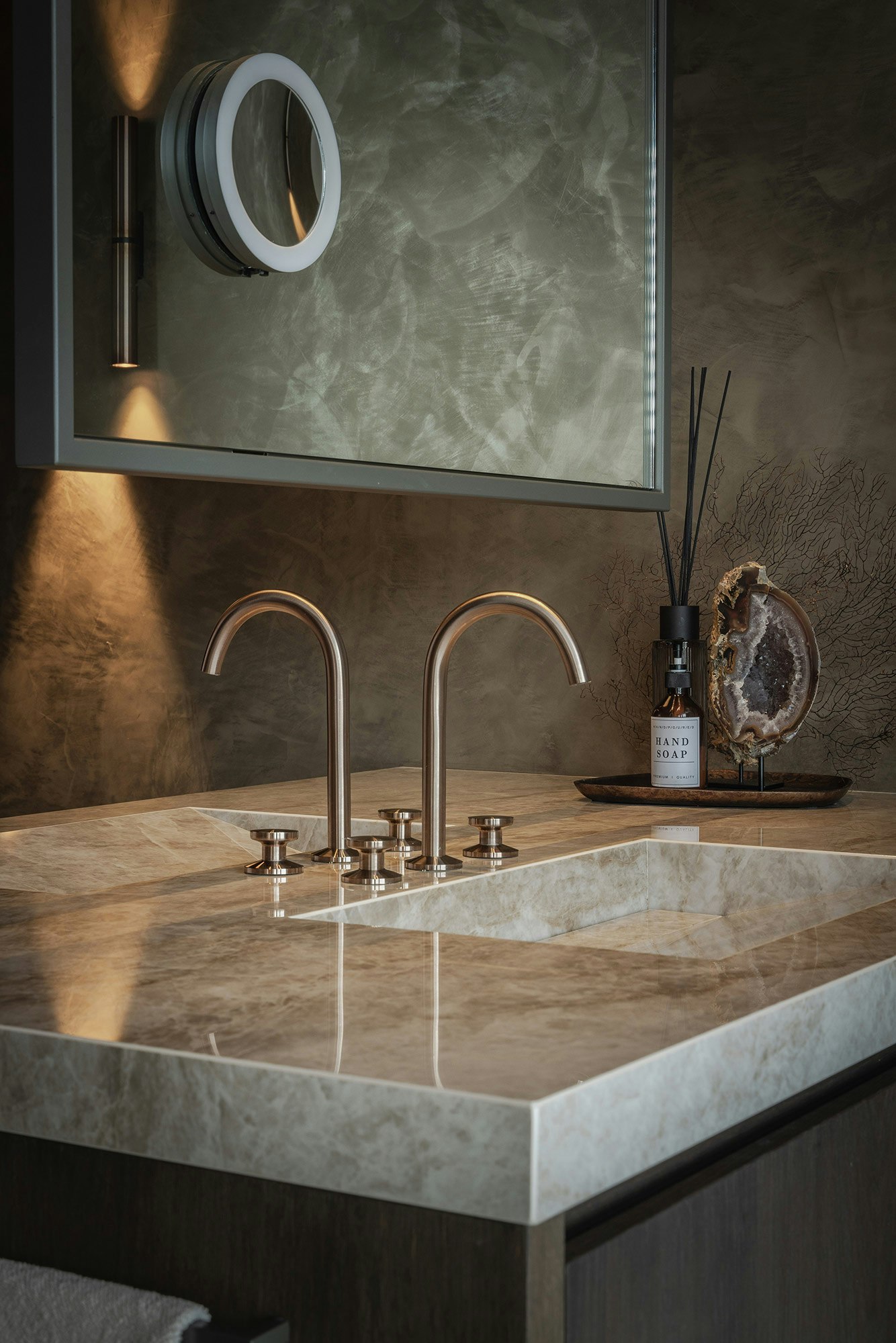 Since Studio MBC was involved from the beginning of the construction and was in continuous contact with the architect and contractor, they also contributed to the layout of the villa's interior. The custom work and all details were designed by Studio MBC. The furniture and materials were also carefully chosen. Miriam even designed the wall fixtures and the carpet in the living room. Additionally, Studio MBC was in close contact with the suppliers involved in this project, supervised the work on-site, and had a lot of creative freedom to work with various beautiful materials.